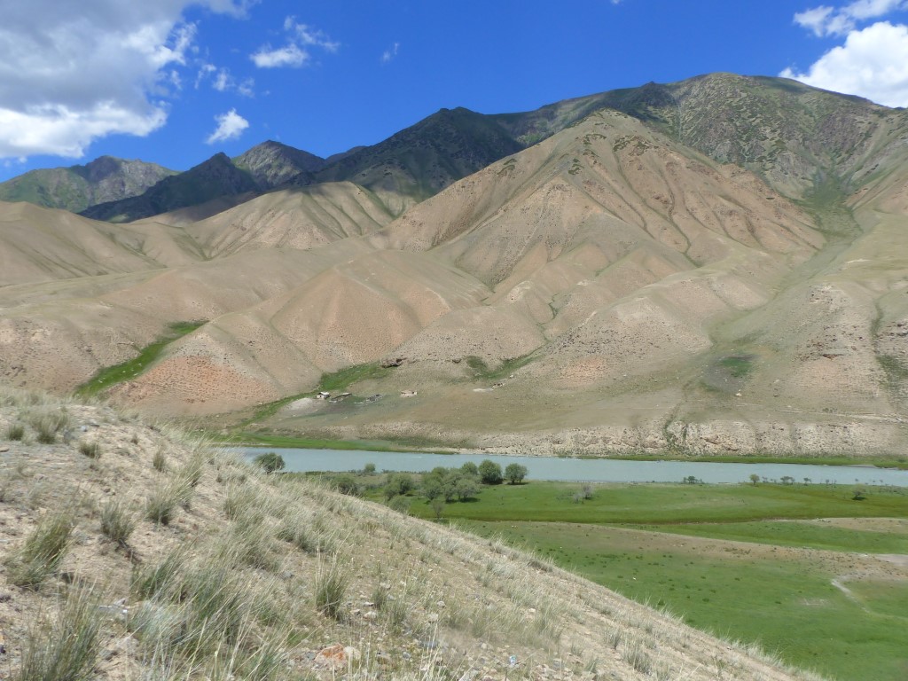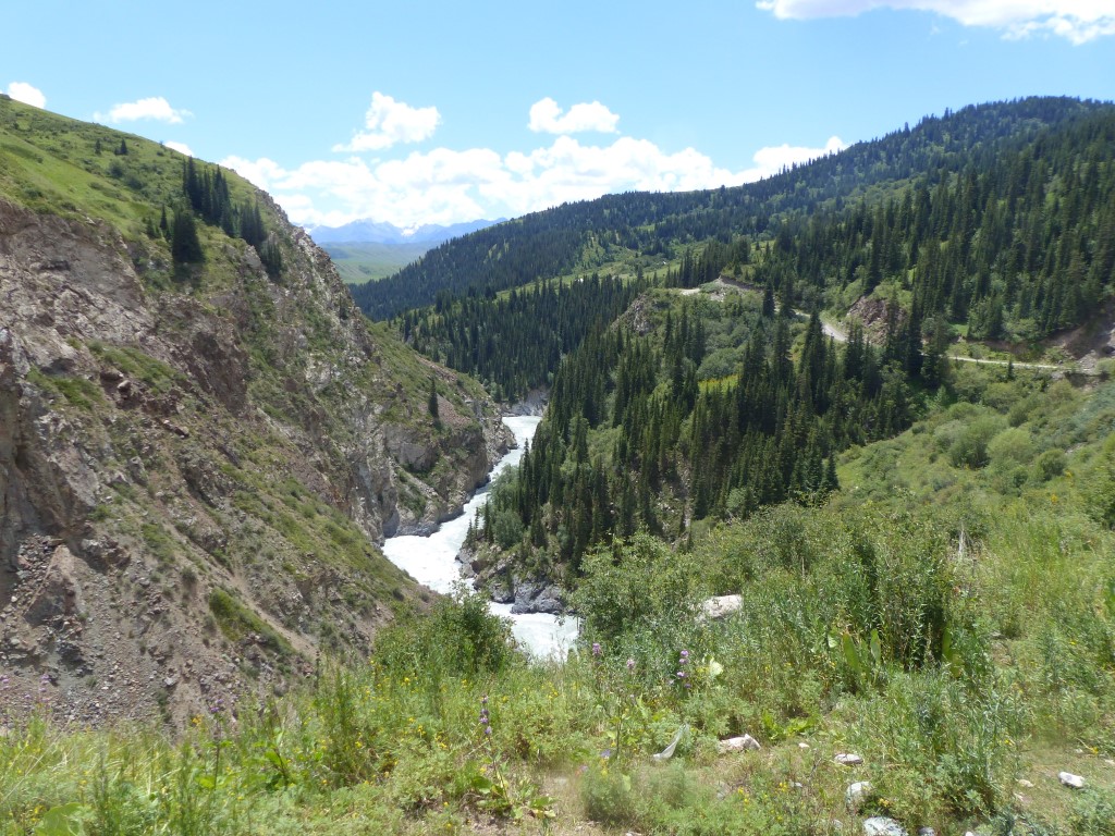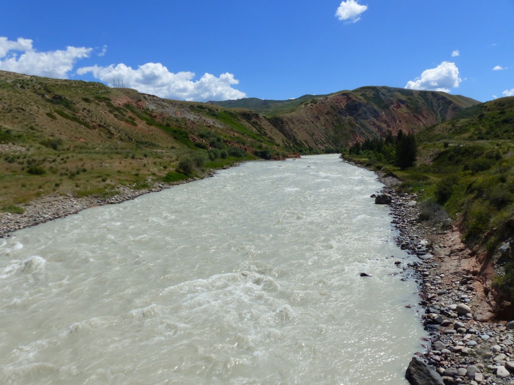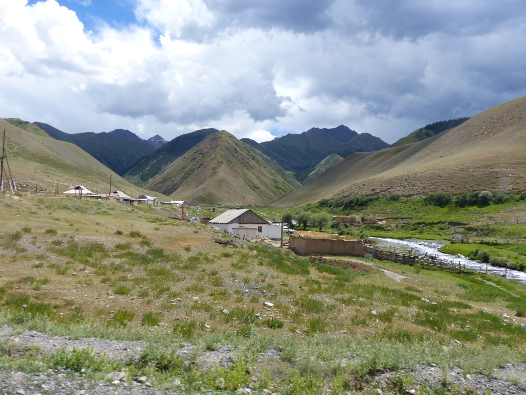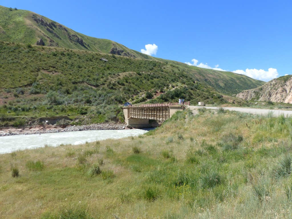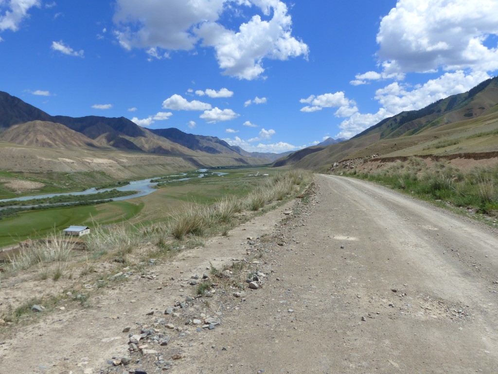 Mais je m’égare, on passe donc ce magnifique pont de l’ère pré-soviétique, et on s’engage dans une piste qui s’élève en longeant une rivière. Comme toute les rivières kirghize, elle est d’une magnifique couleur d’un turquoise laiteux (c’est la description la plus proche que j’aie trouvée…). On passe le village de « petite Naryn », au milieu des champs de trèfle et de colza. Oulan nous explique plus tard que le gouvernement envisage de noyer cette vallée en construisant un barrage, ce qui permettrait au pays de diviser par 2 sa consommation de charbon (et un autre barrage est aussi prévu dans une autre vallée pour la stopper totalement).