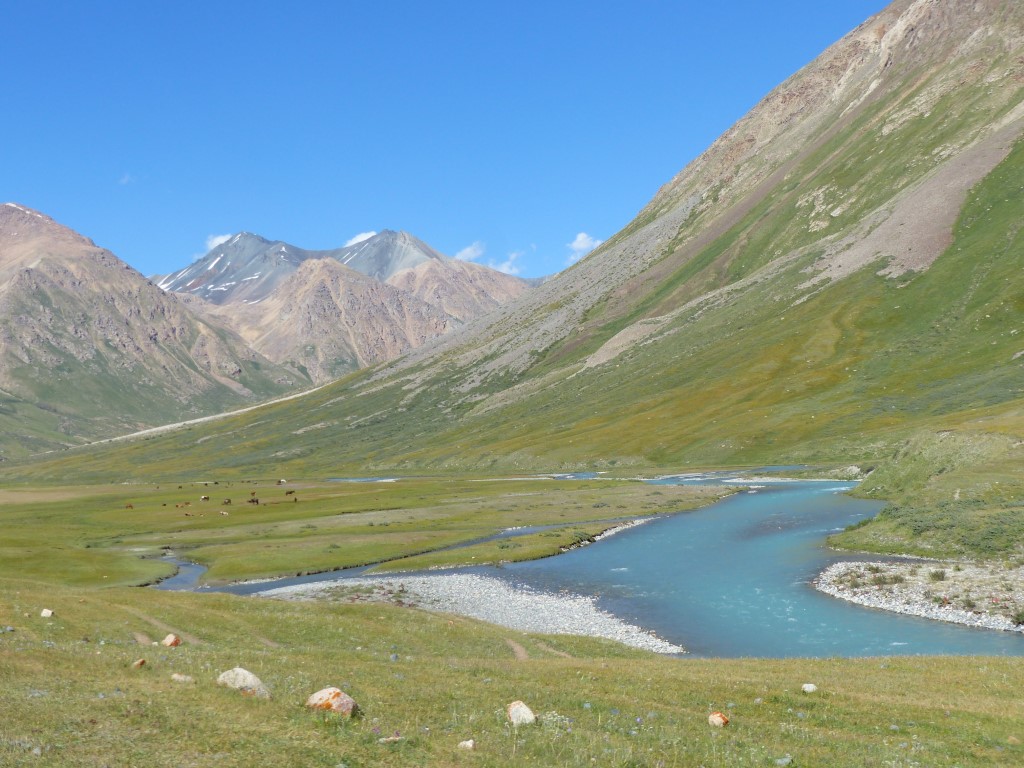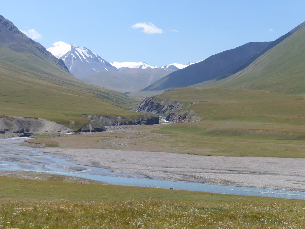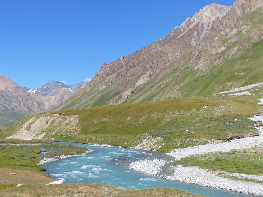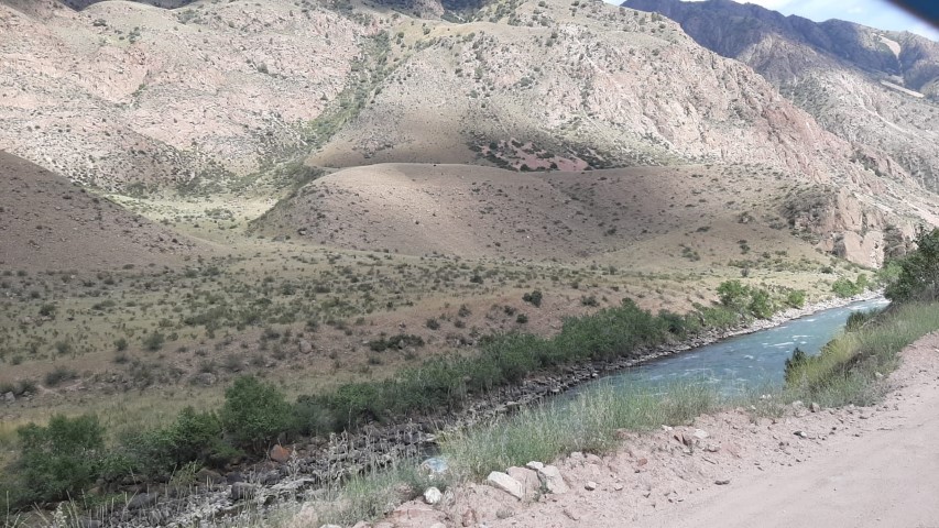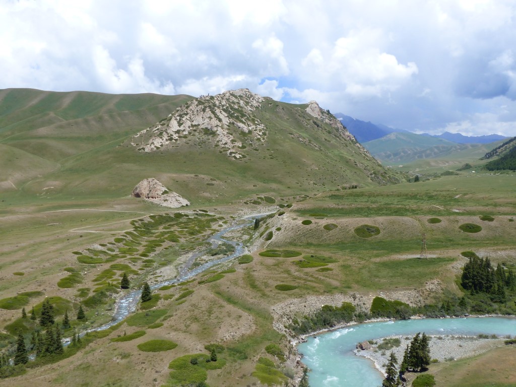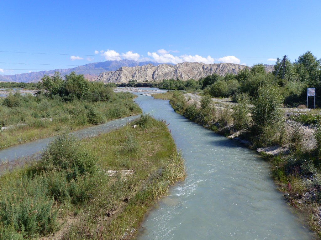 Mais je m’égare, on passe donc ce magnifique pont de l’ère pré-soviétique, et on s’engage dans une piste qui s’élève en longeant une rivière. Comme toute les rivières kirghize, elle est d’une magnifique couleur d’un turquoise laiteux (c’est la description la plus proche que j’aie trouvée…). On passe le village de « petite Naryn », au milieu des champs de trèfle et de colza. Oulan nous explique plus tard que le gouvernement envisage de noyer cette vallée en construisant un barrage, ce qui permettrait au pays de diviser par 2 sa consommation de charbon (et un autre barrage est aussi prévu dans une autre vallée pour la stopper totalement).