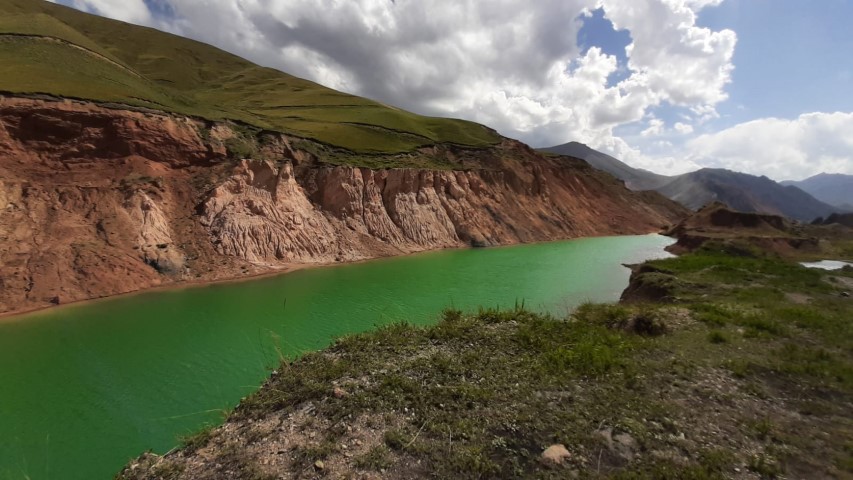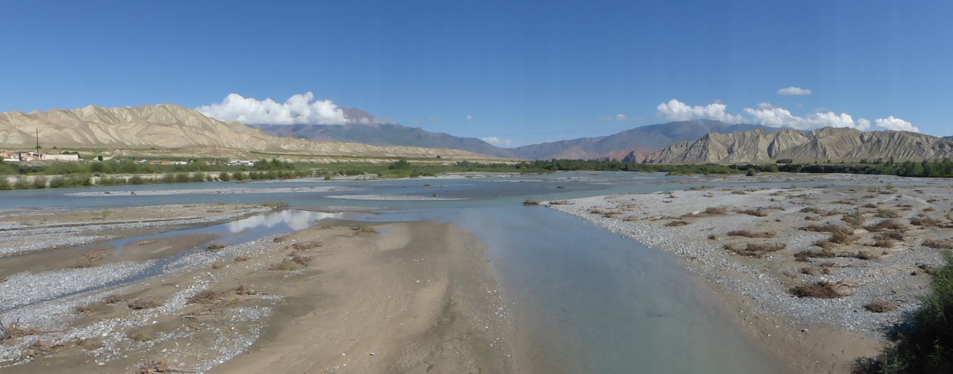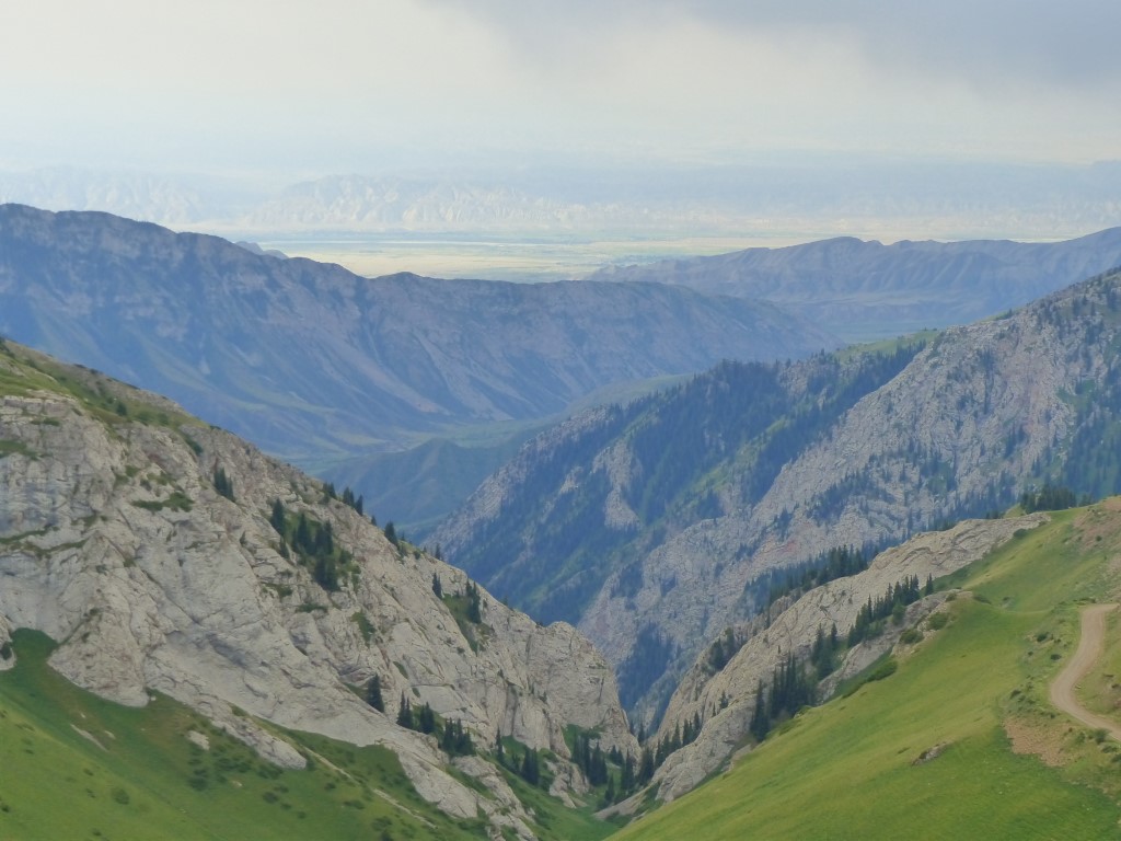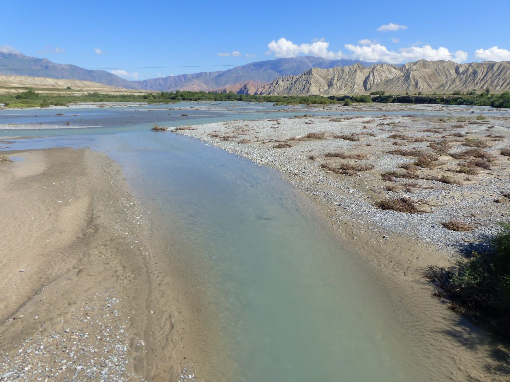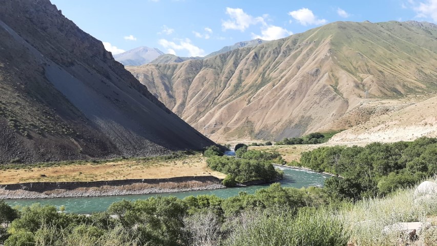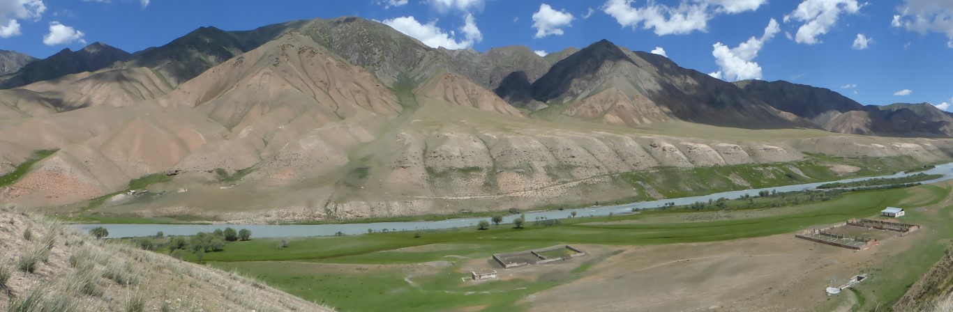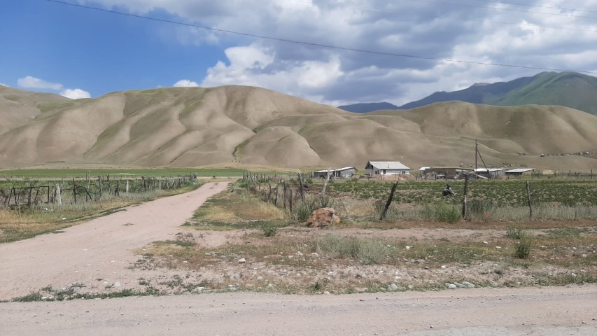 Mais je m’égare, on passe donc ce magnifique pont de l’ère pré-soviétique, et on s’engage dans une piste qui s’élève en longeant une rivière. Comme toute les rivières kirghize, elle est d’une magnifique couleur d’un turquoise laiteux (c’est la description la plus proche que j’aie trouvée…). On passe le village de « petite Naryn », au milieu des champs de trèfle et de colza. Oulan nous explique plus tard que le gouvernement envisage de noyer cette vallée en construisant un barrage, ce qui permettrait au pays de diviser par 2 sa consommation de charbon (et un autre barrage est aussi prévu dans une autre vallée pour la stopper totalement).