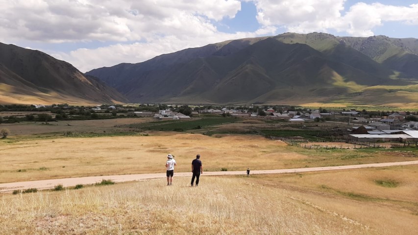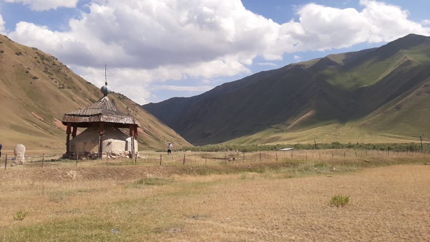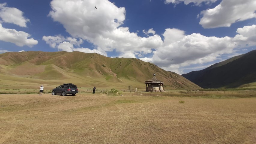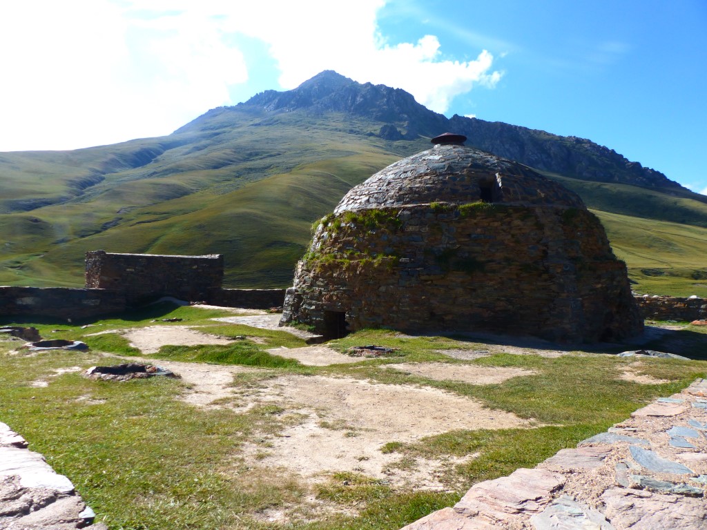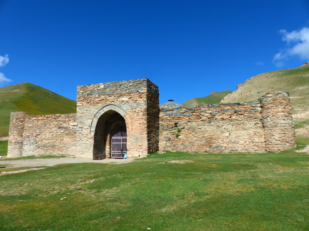 Il a quand même assez d’énergie pour demander à bénéficier d’une visite du caravansérail (qu’il a loupé avant hier soir pour cause d’épuisement total…), ce qui oblige Oulan à aller sortit de son lit (ou presque) la dame qui tient la billetterie d’entrée. La visite se fait rapidement, puis on prend la route pour une longue journée qui devait nous conduire jusqu’au lac Kol Suu après une rando de 4H (à 3515 m d’altitude), mais qui finalement nous amènera avec 1 jour d’avance à la ville de Naryn (2300 m). En effet devant l’état général des troupes, on s’est dit qu’une nouvelle nuit sous yourte, en altitude, avec rando, n’était pas la meilleure idée pour nous remettre d’aplomb. Oulan a gentiment accepté ce changement de programme et a géré le changement d’hébergement.