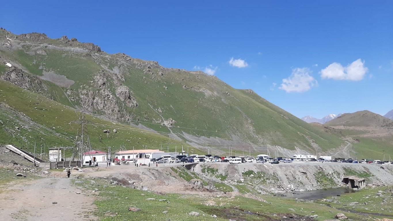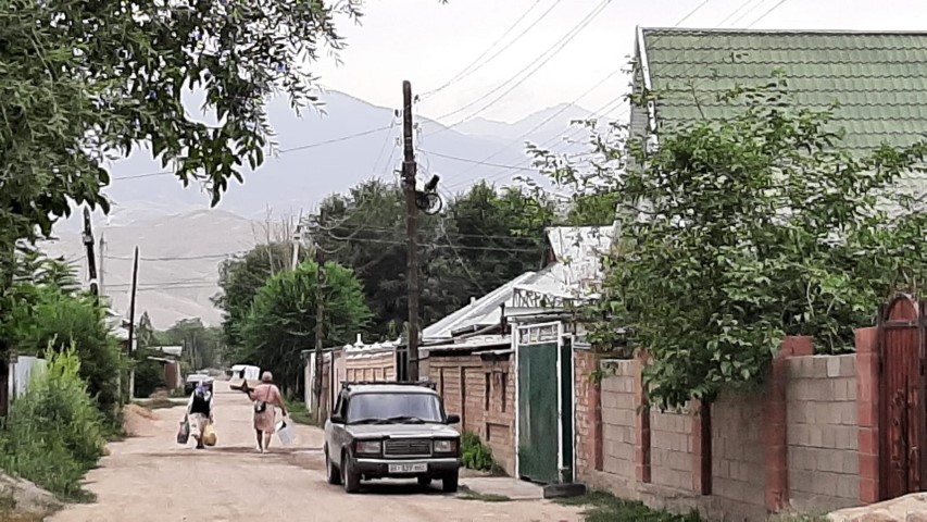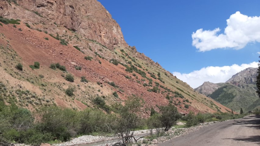 Tout le monde est à l'heure. La circulation dans Bichkek est dense. Il faut jouer des coudes aux carrefours pour passer. En sortie de ville, la 2x2 voies est regroupée sur un seul sens, des travaux étant entrepris pour la réfection de l'autre voie. Cela ne sera pas un mal car régulièrement les voitures passent en première pour éviter des tranchées et des nids de poule. Toutes les voitures ne se valent pas, certaines n'auraient sûrement pas le contrôle technique en France. Notre chauffeur utilise un détecteur de radar en permanence et il sonne très fréquemment. La vitesse limitée n'est pas très élevée sur une 2x2 ; 60km/h avec une tolérance jusqu'à 70km/h. Le 130km/h de nos autoroutes n'existent pas ici.