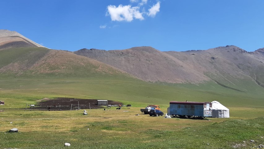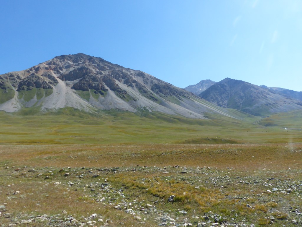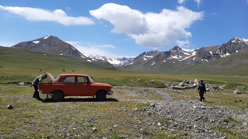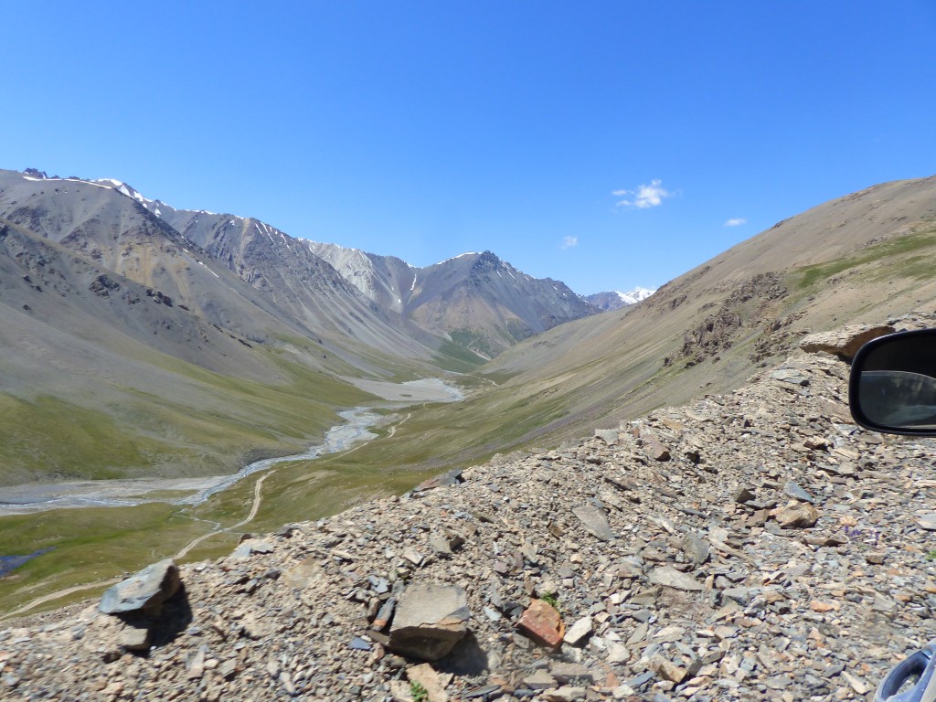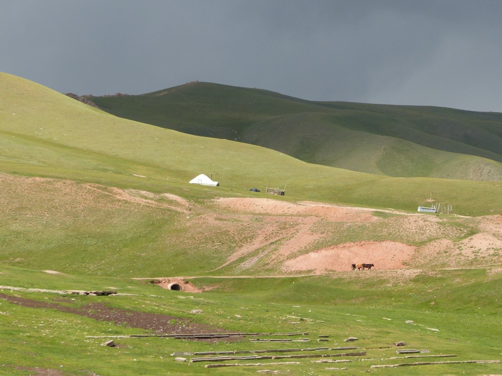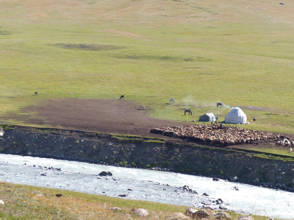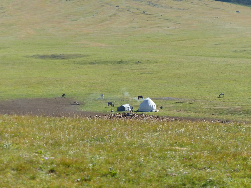 Nous reprenons une partie de la route faite hier et passons au col "d'Abel" à 3175m d'altitude. Une courte pause nous permet de discuter avec des Kirghizes arrivés dans une voiture russe de 40 ans. Ils sont équipés d'un détecteur de métaux. Ils recherchent du fer, mais aussi des vestiges datant de la route de la soie qui passit ici. S'ils trouvent de objets historiques, ils les revendent à un musée. C'est apparemment déjà arrivé. Le détecteur a été acheté sur internet via le site "Alibaba". Il coûte 10000 sum soit 40x250 sum, donc 40 mois de salaire moyen...!