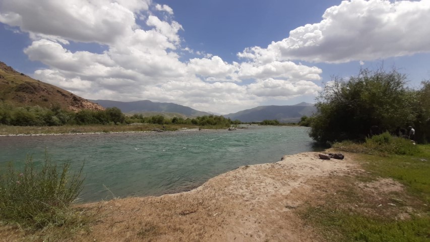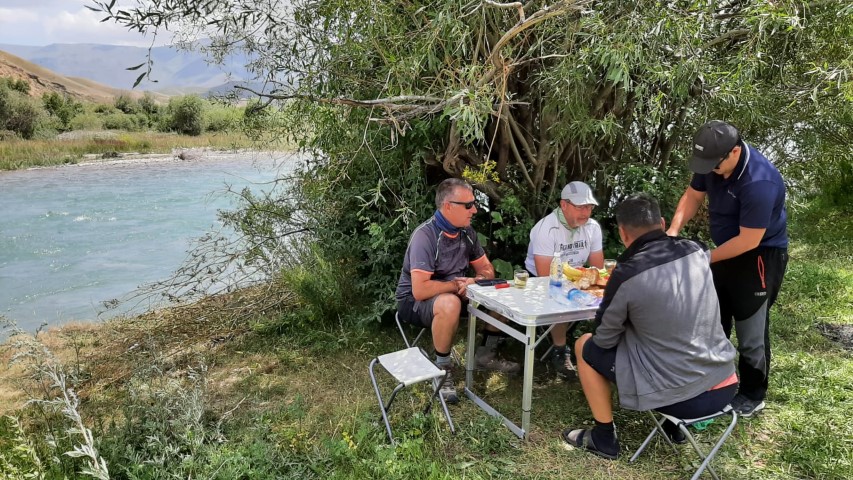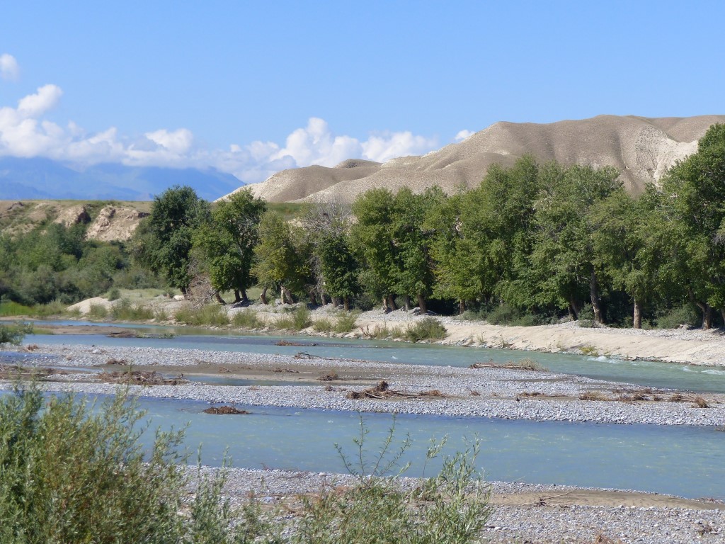 Nous reprenons la piste avant de nous arrêter pour un pique nique au bord de l'eau. Nous sortons la table pliante toute neuve acheté à Bishkek, ainsi que les couverts, les verres (modèle français!) et les assiettes. Pas de couteaux pour se partager le poulet rôti acheté le matin même. Ici on mange facilement avec les doigts.