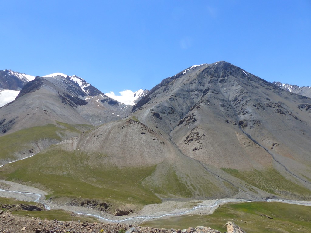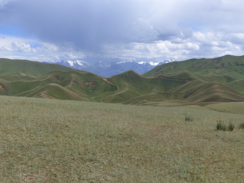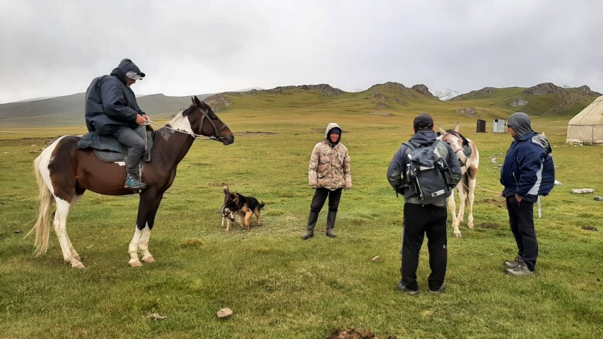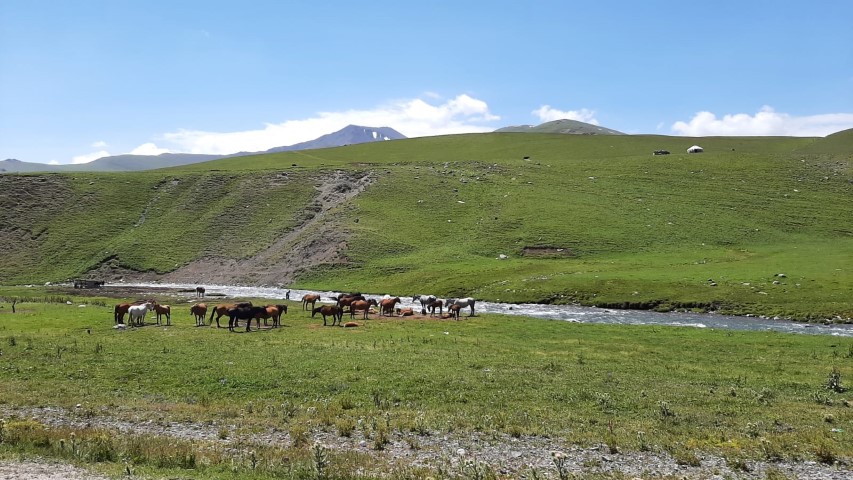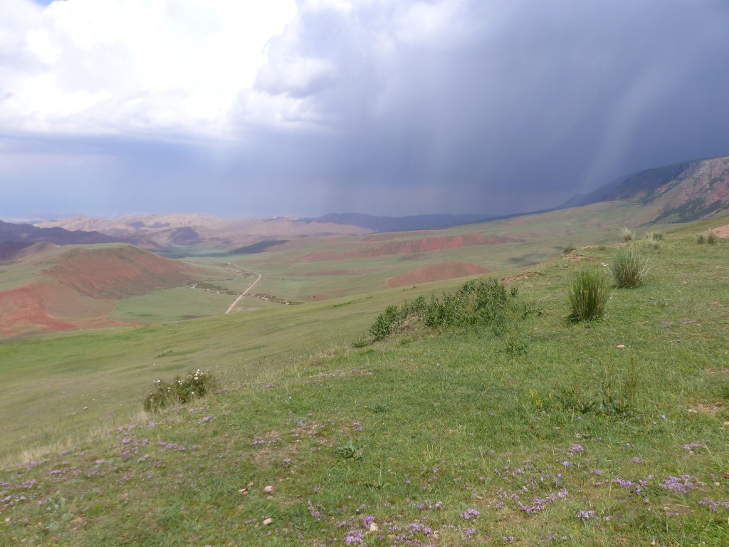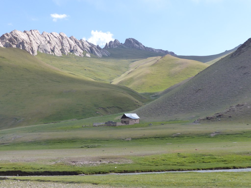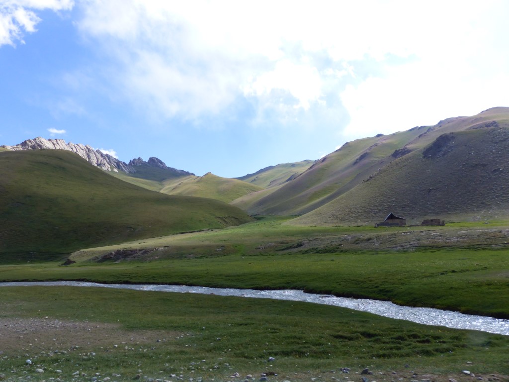 Aujourd'hui Oulan a prévu de nous emmener au col situé à 4000 mètres. Nous pique niquerons en route. Nous marchons entre deux montagnes, à proximité d'un petit cours d'eau qu'il faut plusieurs fois franchir. Nous avançons à deux à l'heure contrairement à nos deux Kirghizes qui semblent insensibles à l'altitude. Rapidement, il devient évident que je pourrais pas atteindre le col. Je m'arrête là en attendant leur retour. Je fais une sieste jusqu'un orage ne se déclare et qu'il s'en suit une petite pluie de grêle qui recouvre le sol. Heureusement, une ancienne maison est à proximité et je m'y abrite en me couvrant de vêtements chauds. L'ambiance a complètement changée, nous sommes en haute montagne. Altimbeck apparaît soudain au détour du chemin. Il est équipé d'une doudounne qui a pris l'eau. Il semble avoir froid. Il me fait signe de le suivre pour rentrer au campement. J'avance toujours à deux à l'heure et lui trace comme pas un. Il m'attendra un peu plus loin lorsque le temps sera redevenu plus chaud. Nous atteignons la Yourte.