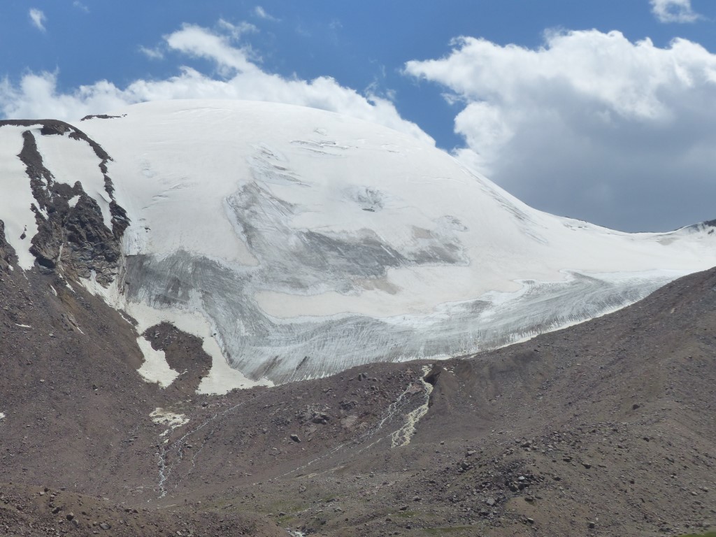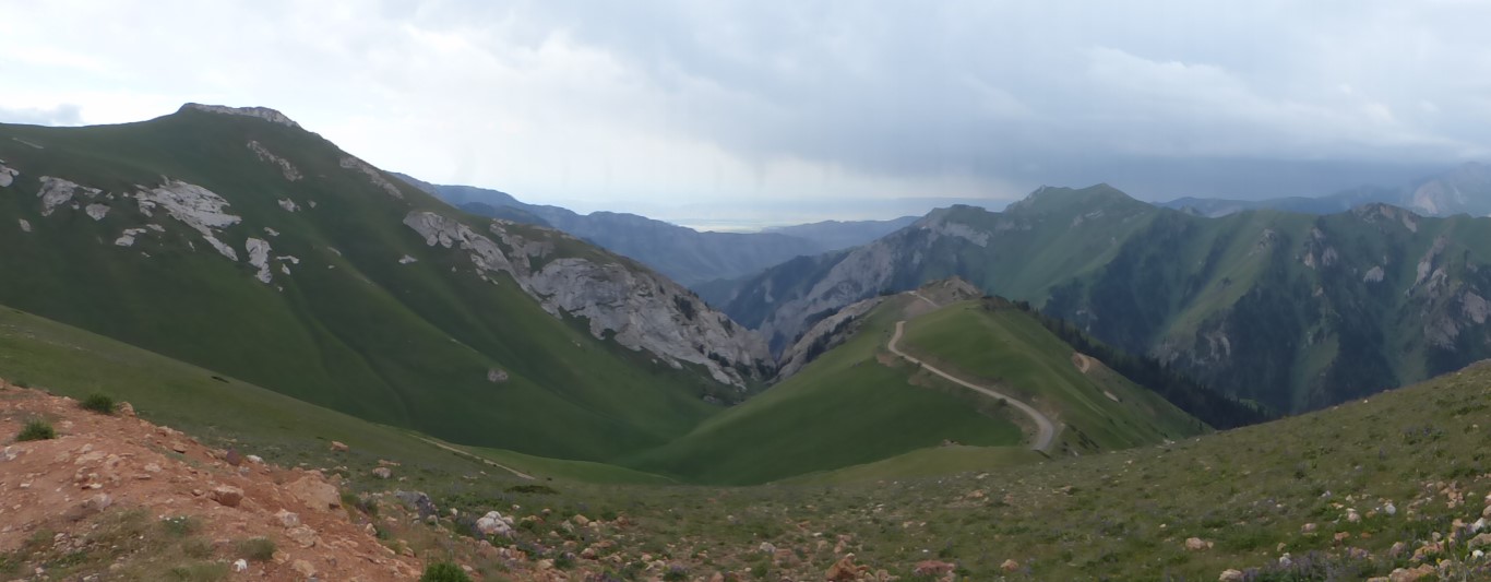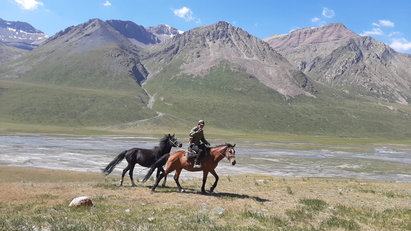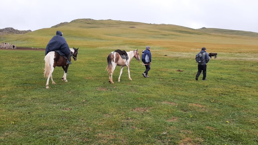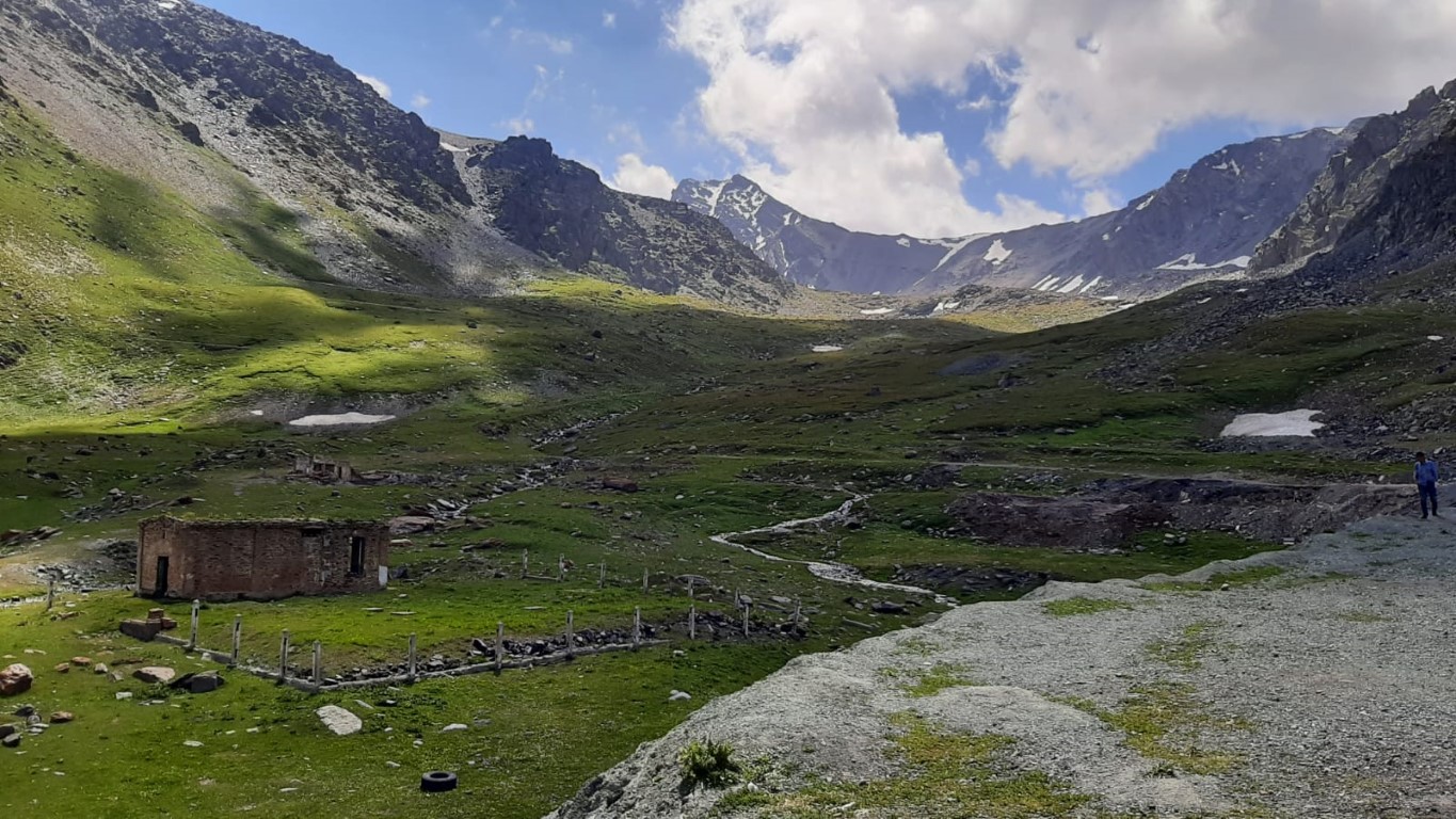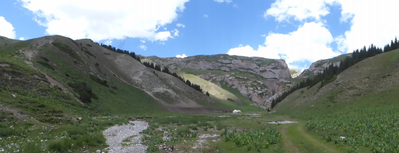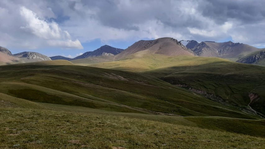 Aujourd'hui Oulan a prévu de nous emmener au col situé à 4000 mètres. Nous pique niquerons en route. Nous marchons entre deux montagnes, à proximité d'un petit cours d'eau qu'il faut plusieurs fois franchir. Nous avançons à deux à l'heure contrairement à nos deux Kirghizes qui semblent insensibles à l'altitude. Rapidement, il devient évident que je pourrais pas atteindre le col. Je m'arrête là en attendant leur retour. Je fais une sieste jusqu'un orage ne se déclare et qu'il s'en suit une petite pluie de grêle qui recouvre le sol. Heureusement, une ancienne maison est à proximité et je m'y abrite en me couvrant de vêtements chauds. L'ambiance a complètement changée, nous sommes en haute montagne. Altimbeck apparaît soudain au détour du chemin. Il est équipé d'une doudounne qui a pris l'eau. Il semble avoir froid. Il me fait signe de le suivre pour rentrer au campement. J'avance toujours à deux à l'heure et lui trace comme pas un. Il m'attendra un peu plus loin lorsque le temps sera redevenu plus chaud. Nous atteignons la Yourte.