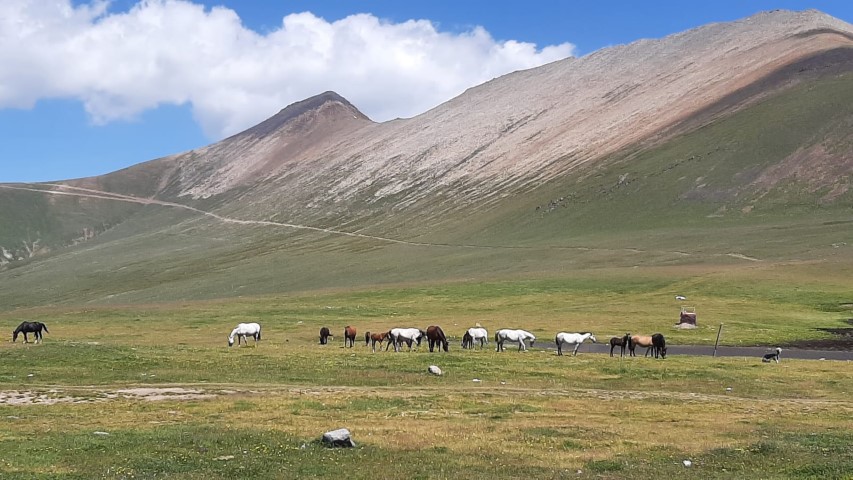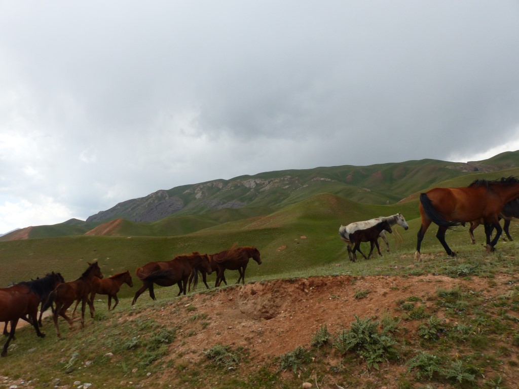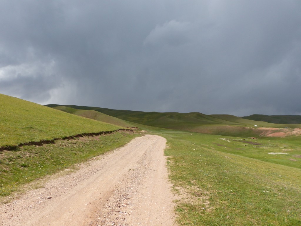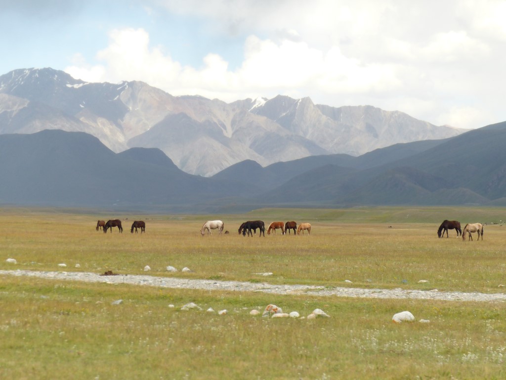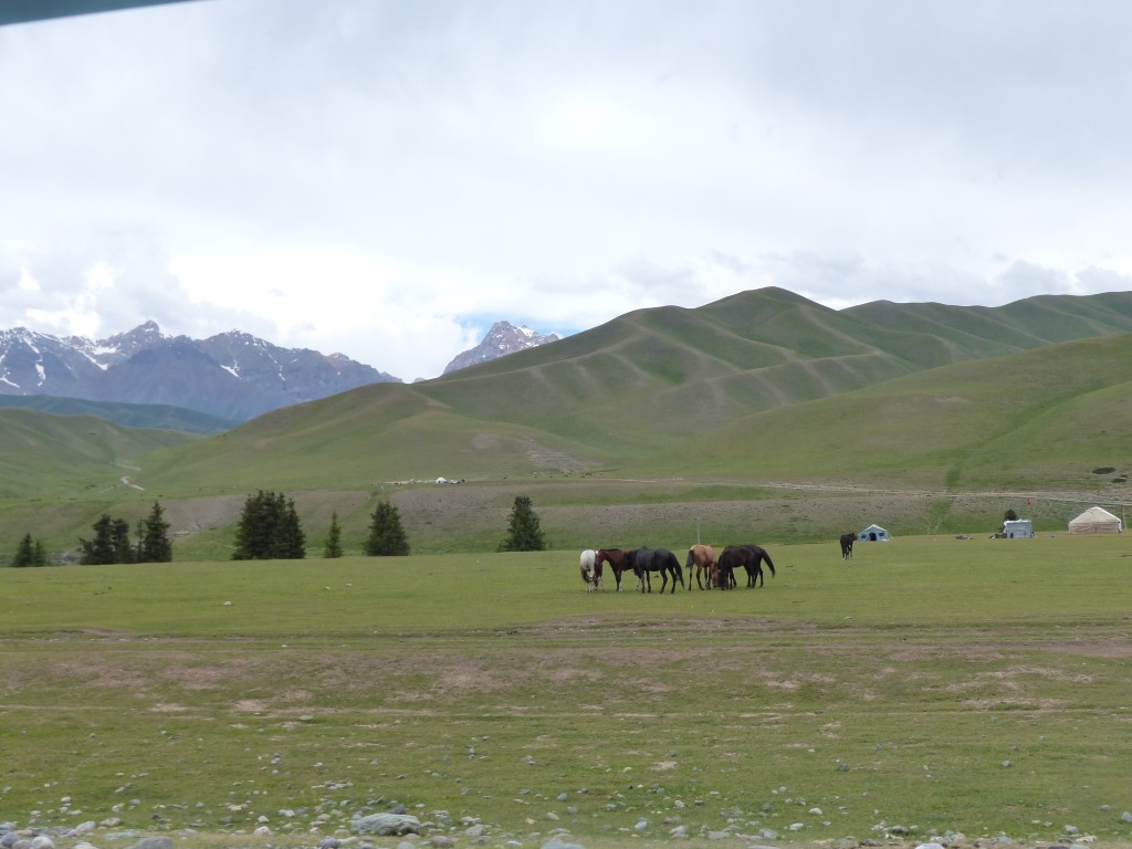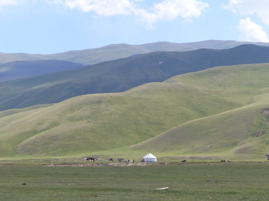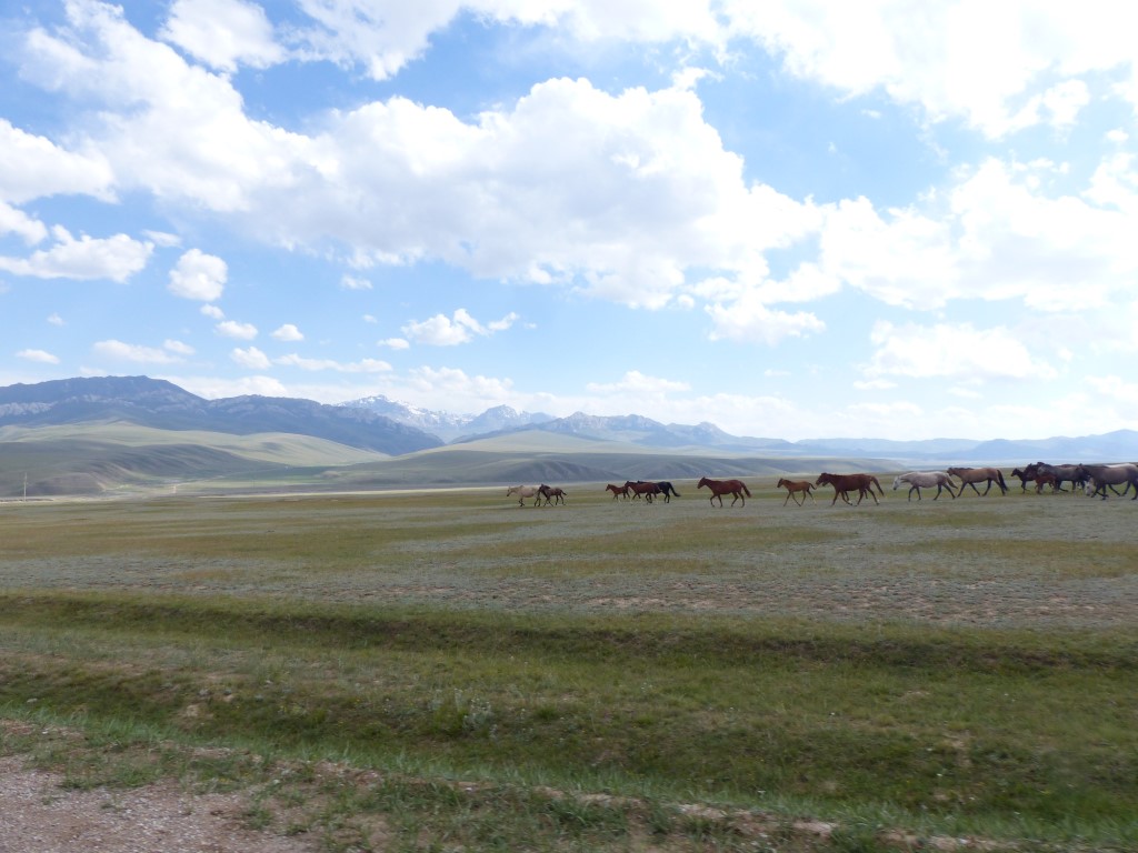 On fait donc le trajet retour sur la piste depuis Tash Rabat jusqu’à la route principale (que l’on apprécie beaucoup plus que l’avant veille, en arrivant bien crevés après 1 journée de route), en suivant la très belle vallée parsemée de yourtes, de campements, de troupeaux de chevaux, vaches, et moutons…