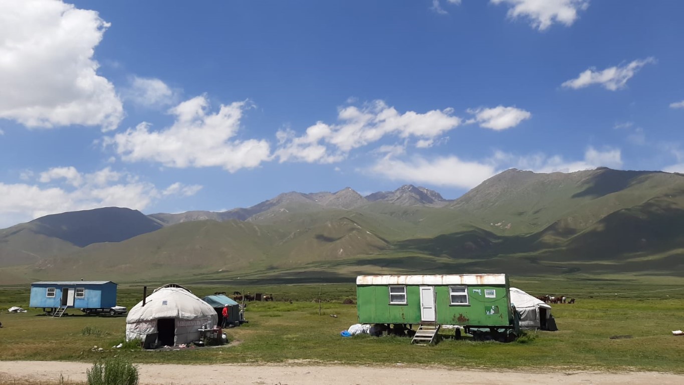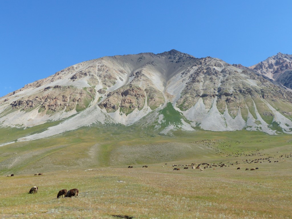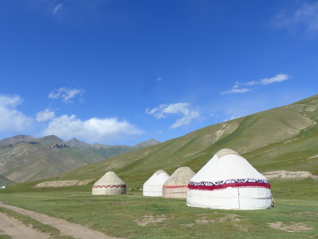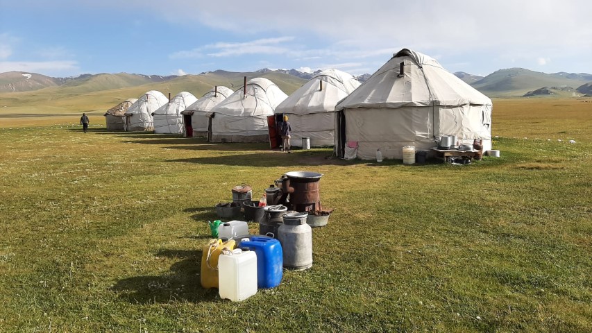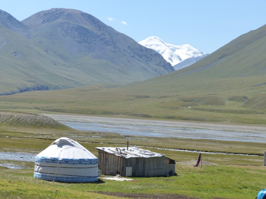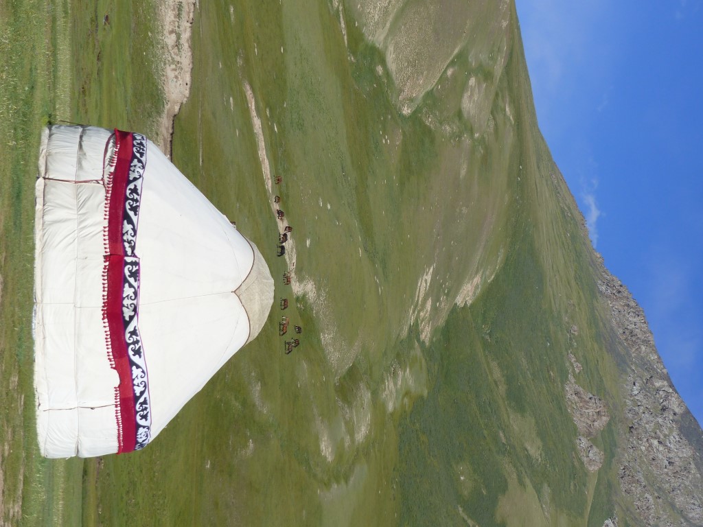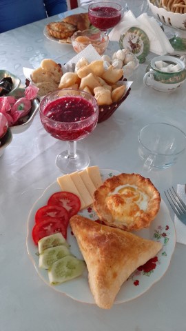 le jour se lève à 5H mais heureusement on est entourés de montagnes donc le soleil ne vient taper sur la tente qu’à 8H, juste à l’heure du petit déj. Oeufs sur le plat, beurre, miel, pain de son, l’inévitable saucisson kirghize, gâteaux … rien ne manque !