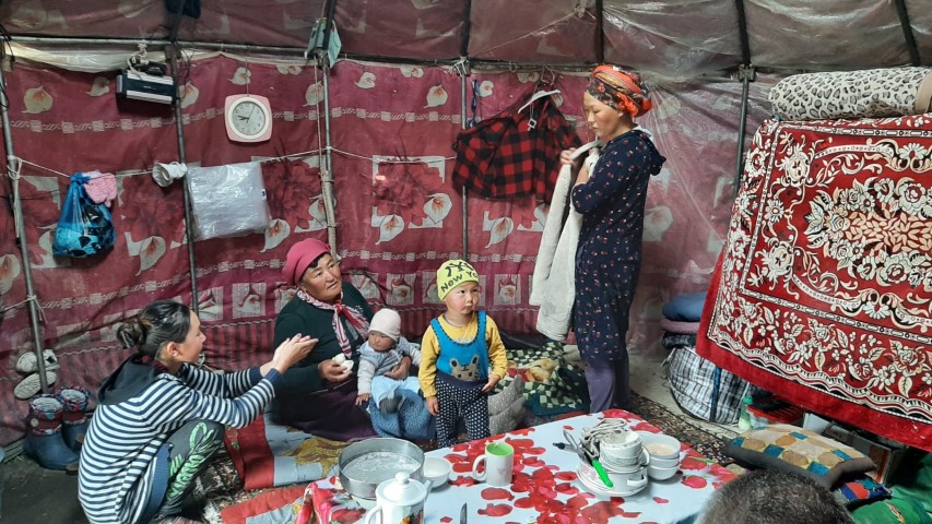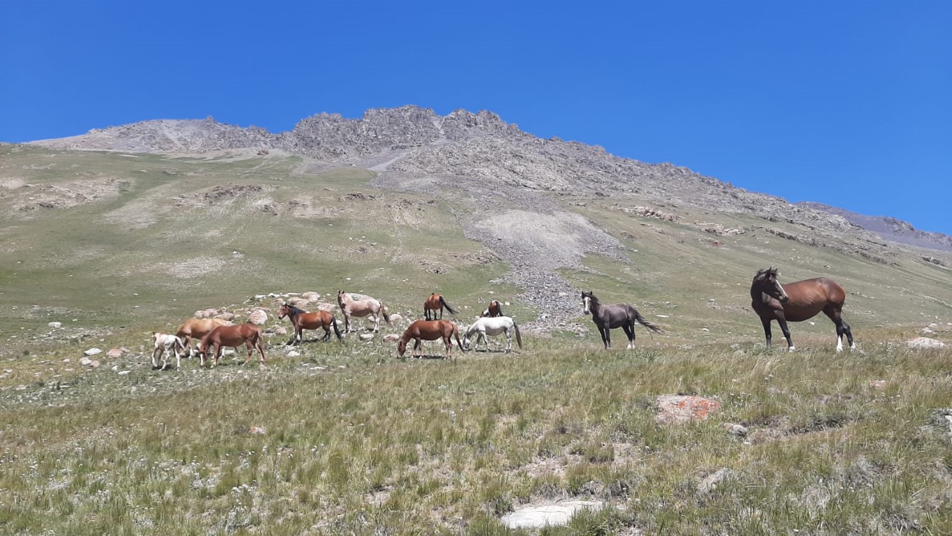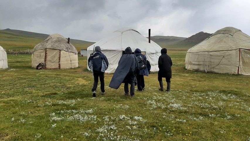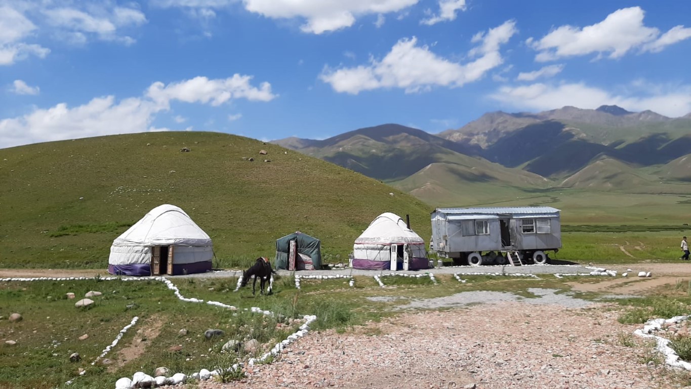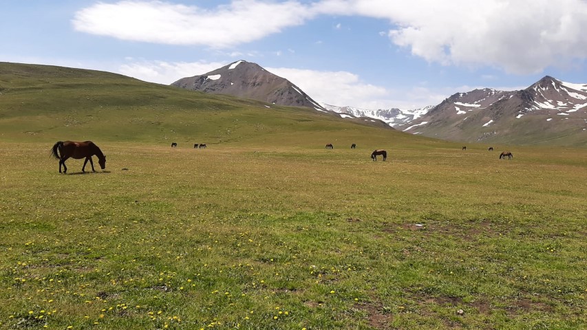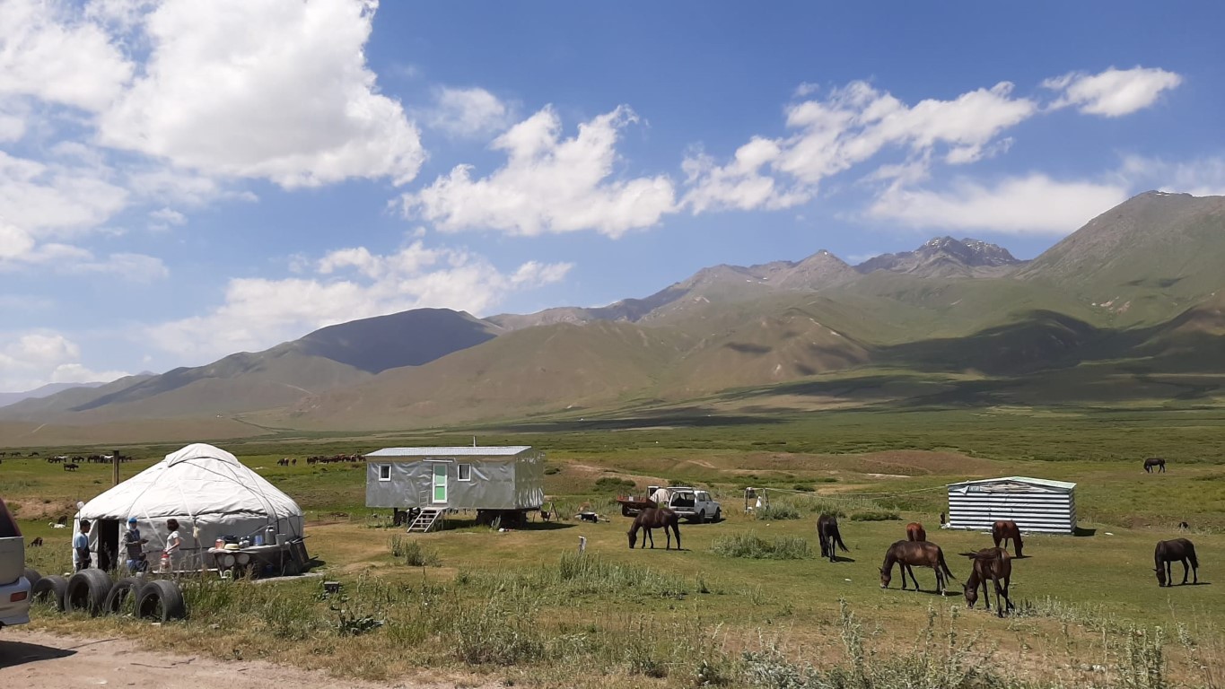 le jour se lève à 5H mais heureusement on est entourés de montagnes donc le soleil ne vient taper sur la tente qu’à 8H, juste à l’heure du petit déj. Oeufs sur le plat, beurre, miel, pain de son, l’inévitable saucisson kirghize, gâteaux … rien ne manque !