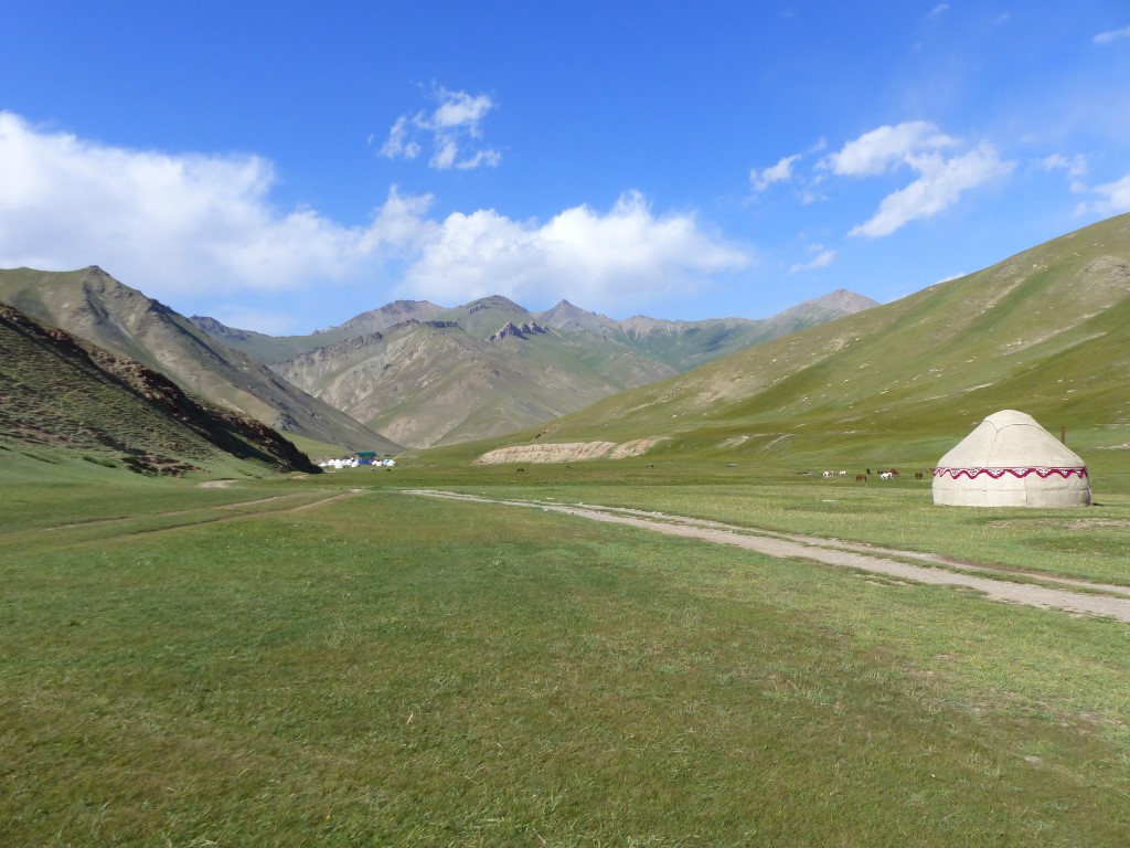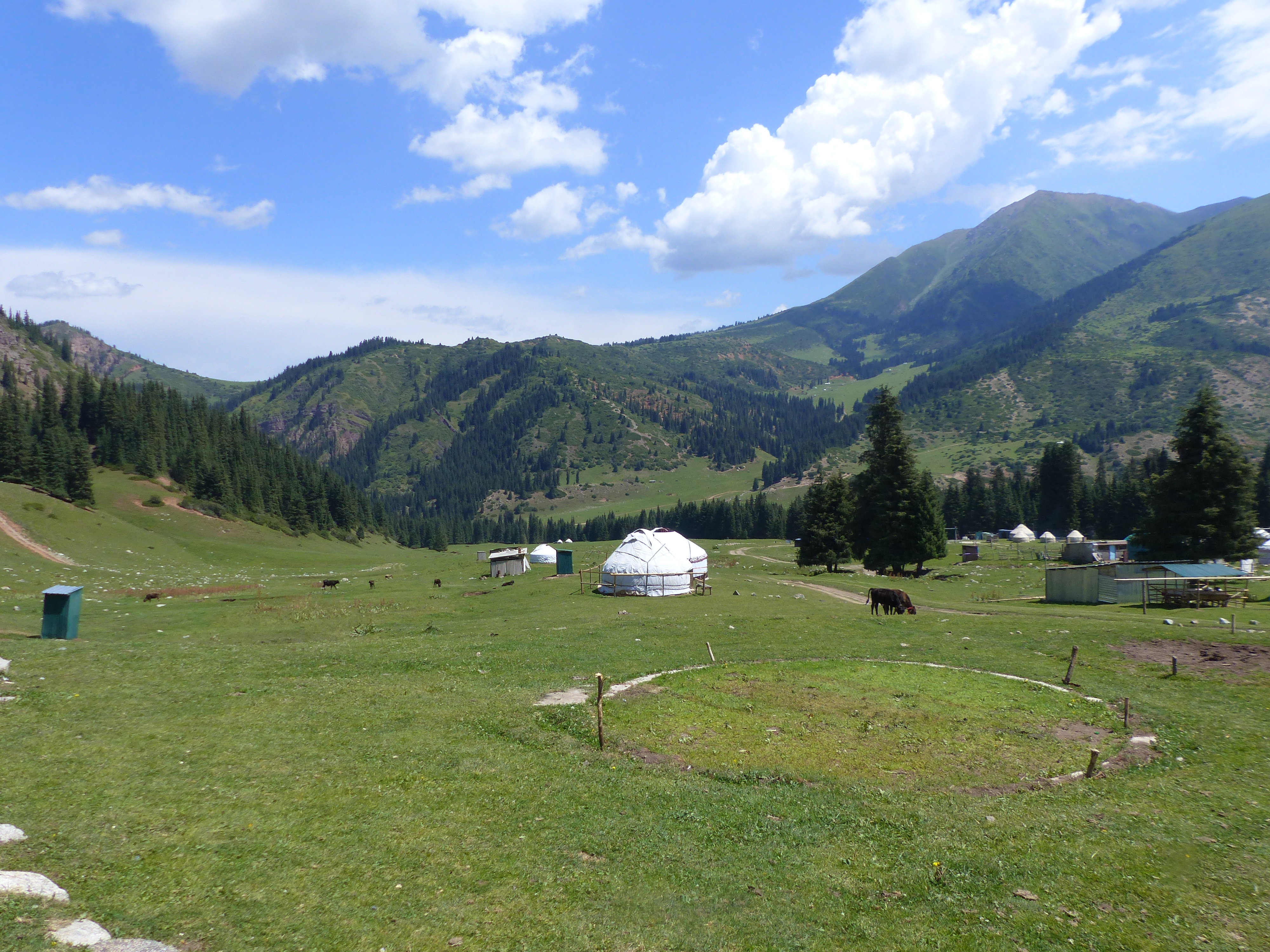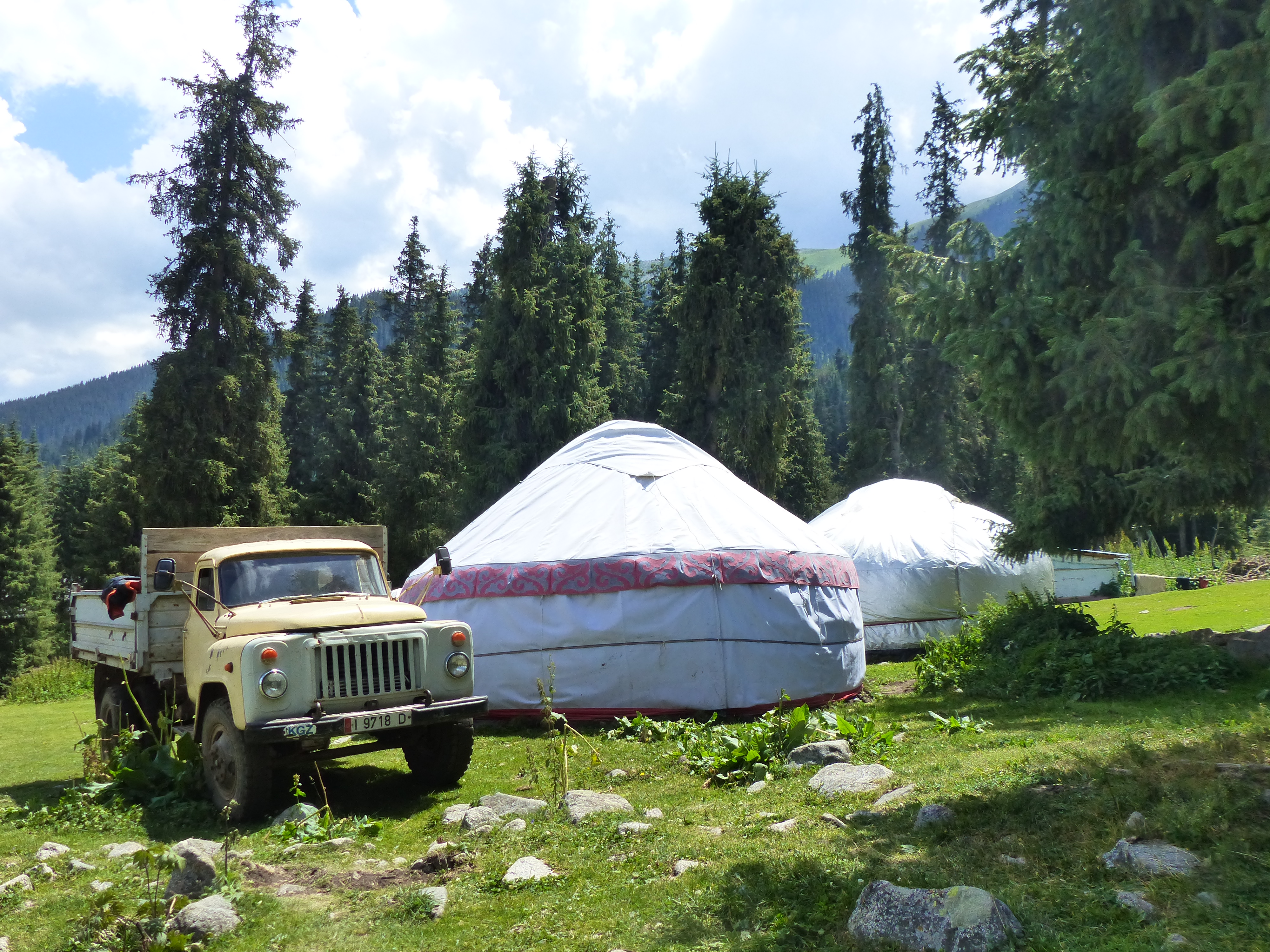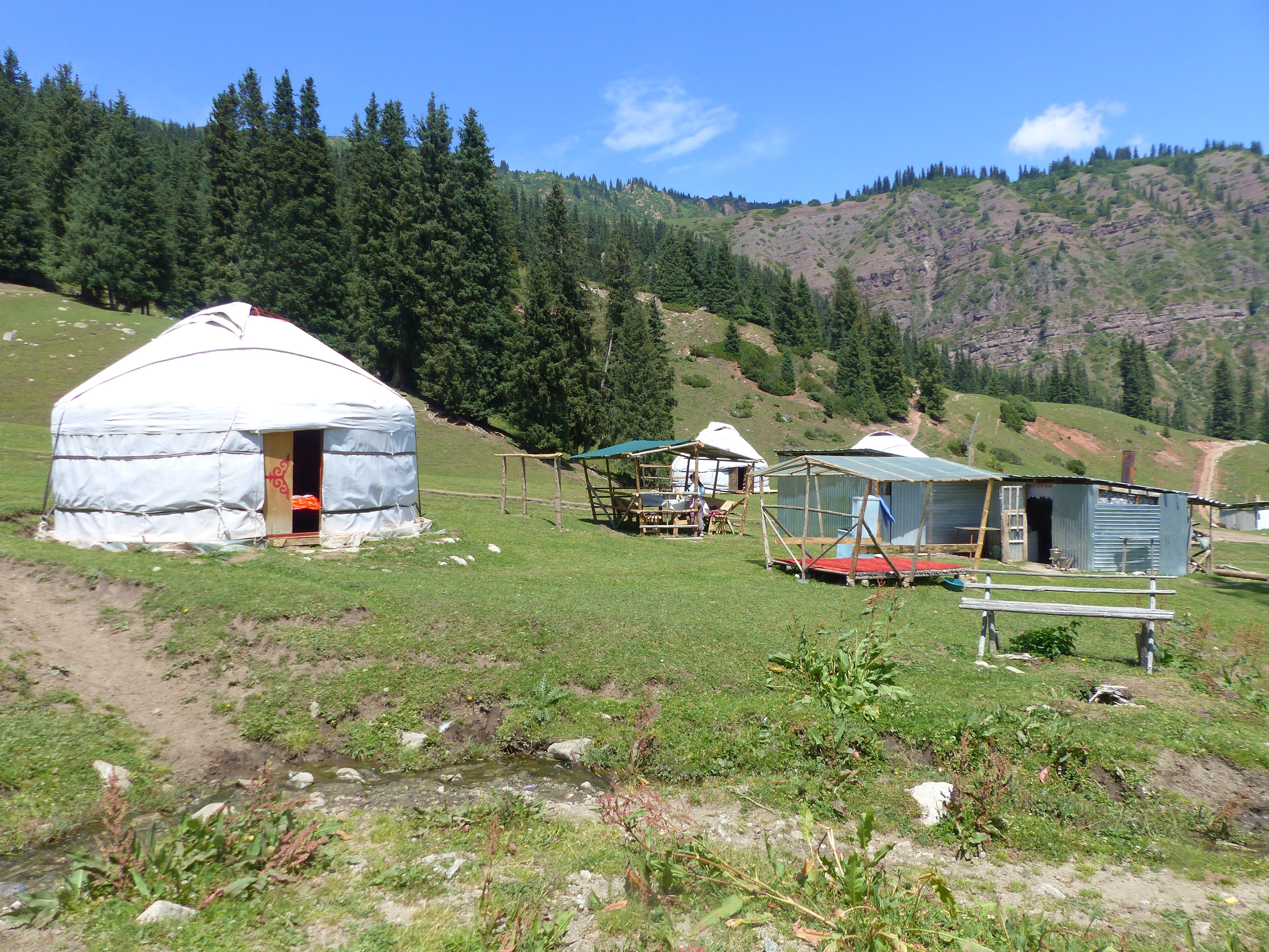 Aujourd’hui, après un petit déj de roi dans notre hôtel de luxe (on rencontre même 2 français en vacances dans le coin car ils ont « de la famille à Bichkek » … comment peut on avoir de la famille à Bichkek???), grande journée de route pour rejoindre par les pistes le lieu de notre campement… Et oui, on s’installe pour 2 nuits en camping sauvage dans une vallée d’altitude (au moins 3000 m).