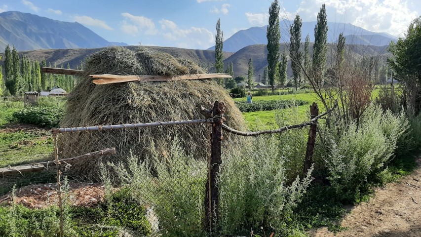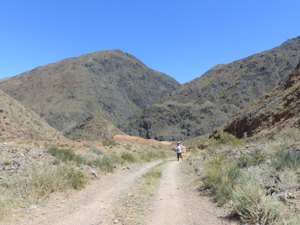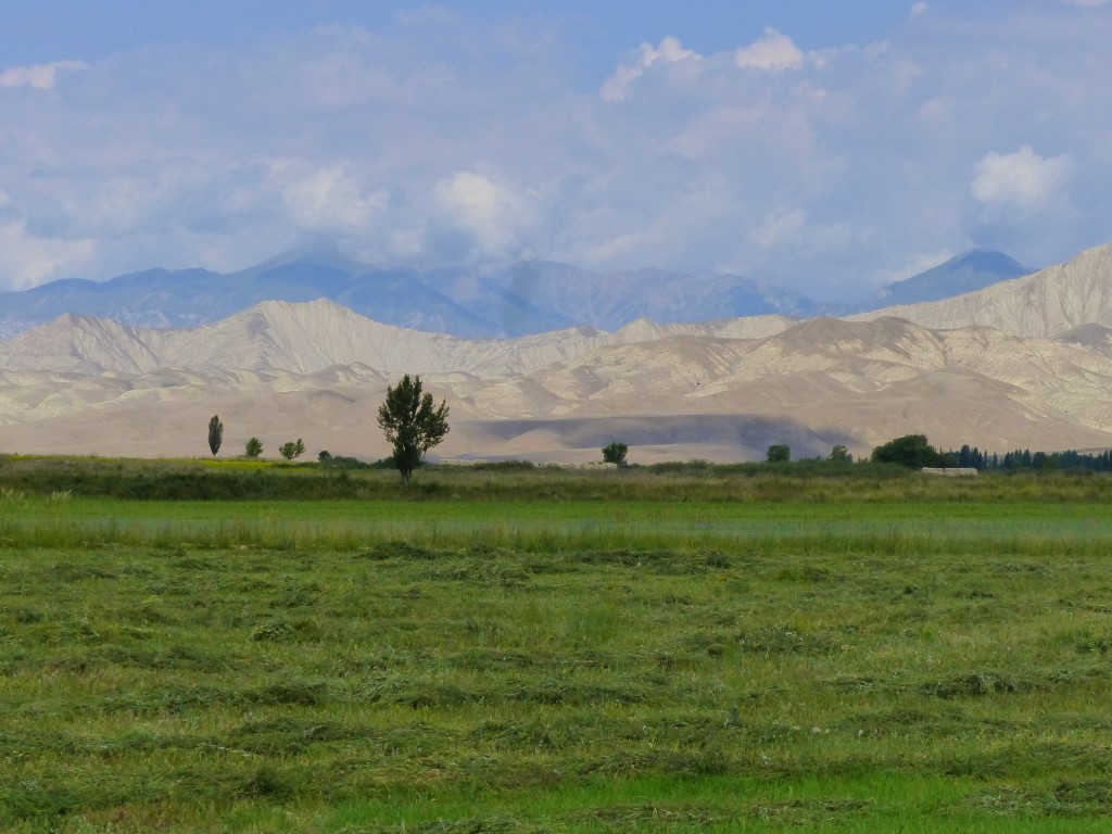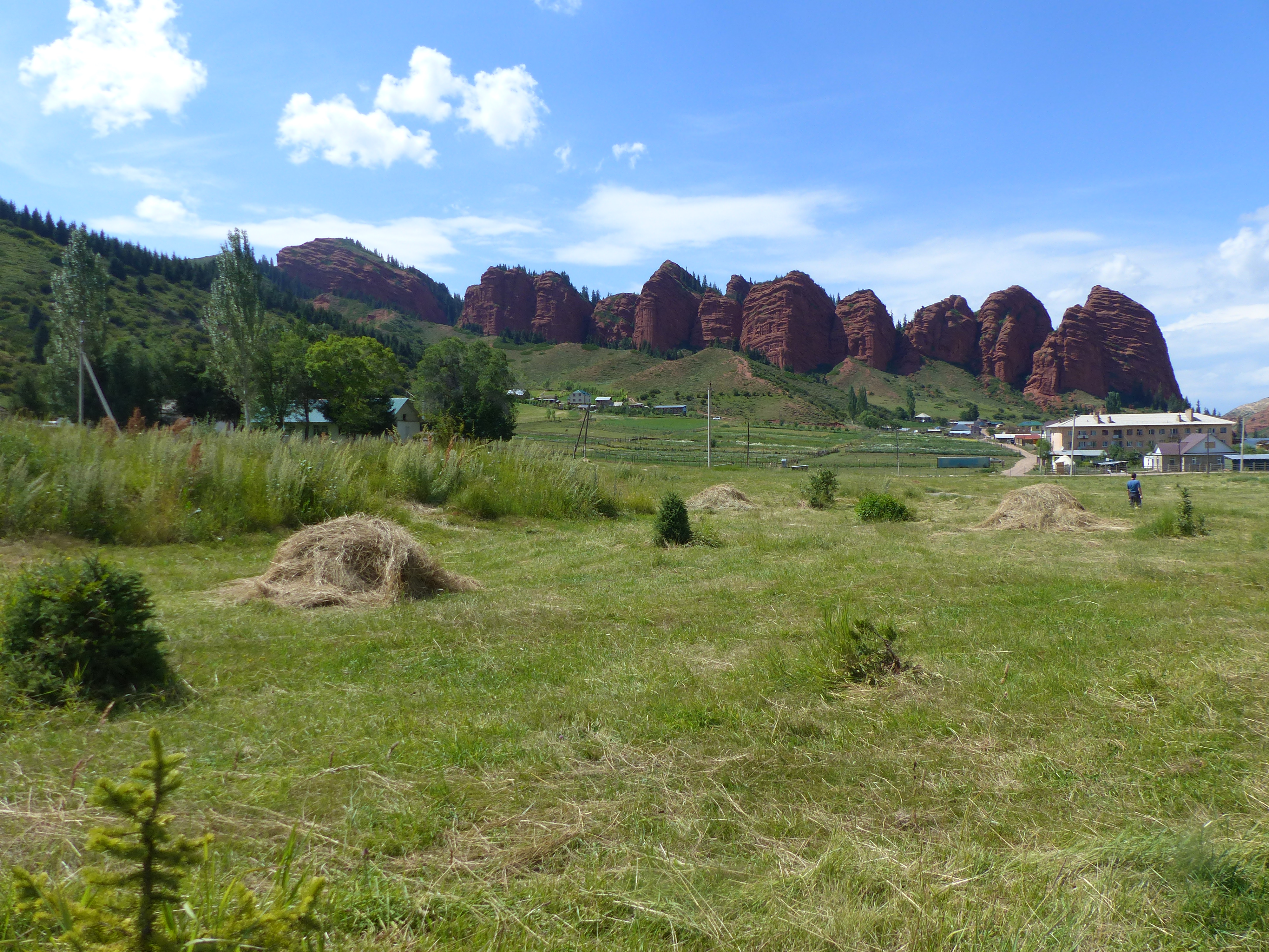 On longe tout d’abord sur une route à peu près carrossable, une large vallée toute occupée aux travaux des champs : on est en plein dans les foins ! (il faut dire que les citadins ont aussi l’occasion de s’occuper à ces saines activités : comme c’est samedi, ils font des corvées d’entretien des fossés de la ville de Naryn, à tour de rôle. Cela doit renforcer le lien social et diminuer les impôts – enfin j’imagine…. En plus c’est bio car tout se fait à la serpette et à l’huile de coude).
