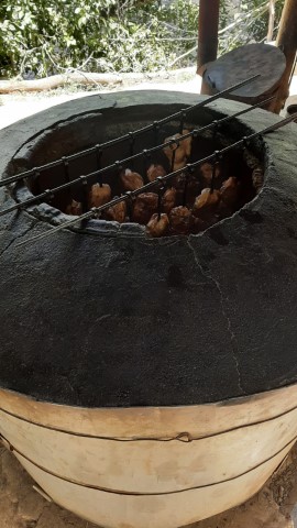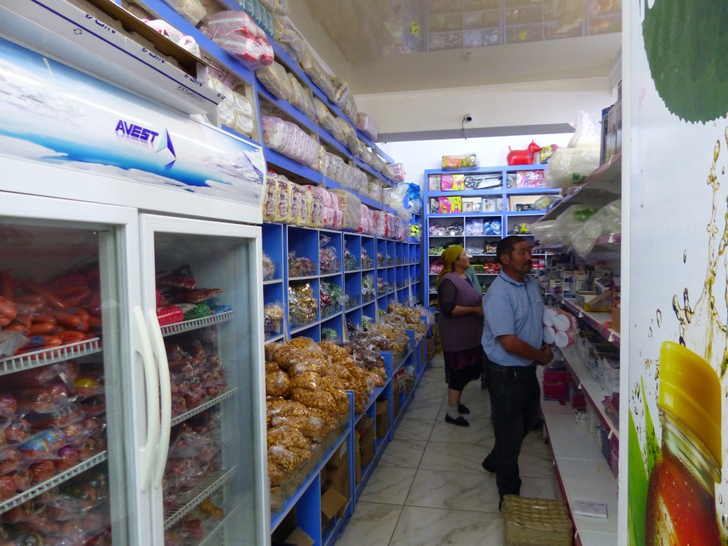 Lorsque la piste retrouve la route, la civilisation se fait aussitôt sentir. Nous nous arrêtons aux commerces pour acheter notre déjeuner. Ce village, Oulan le connait bien, il y a été scolarisé de 7 à 8 ans. Du coup, il connaît un petit parc où l'on peut s'installer. Il y a là des tables de pique nique abritées, comme on en trouvait en Iran (pas de chaise, on mange assit sur le sol). Nous achetons de brochettes de poulet cuites à la braise dans un four comme ceux utilisés localement pour cuire le pain (l'ouverture est en haut et non sur le côté comme un four en France).
