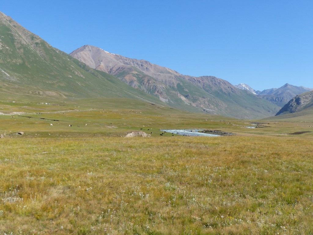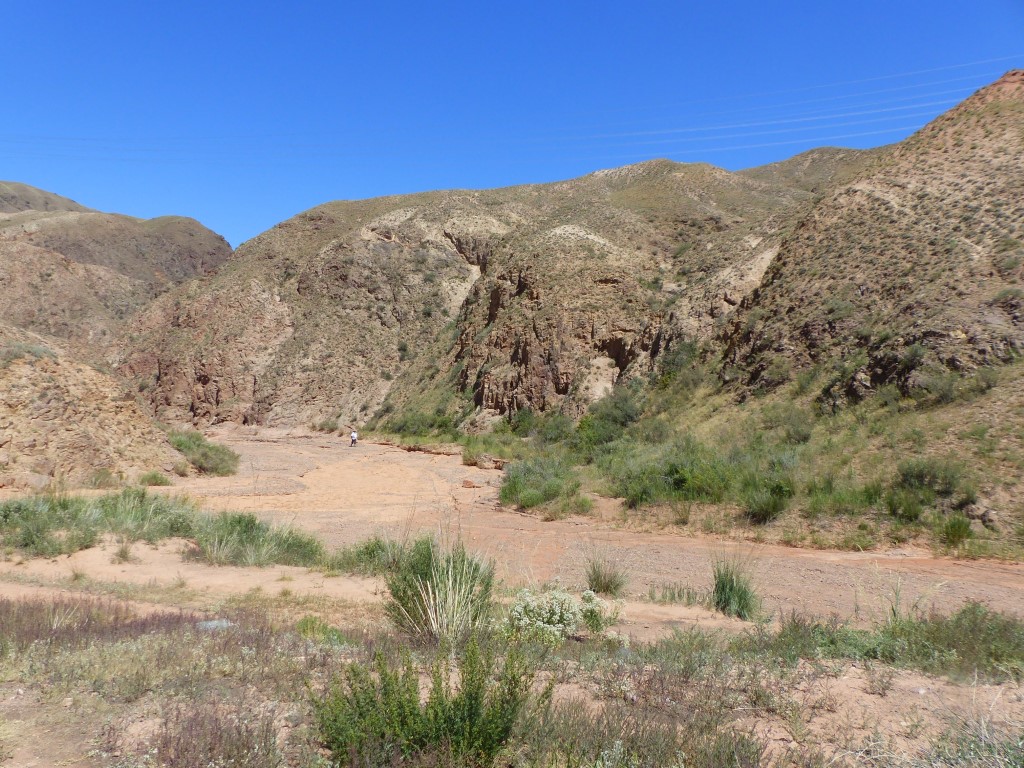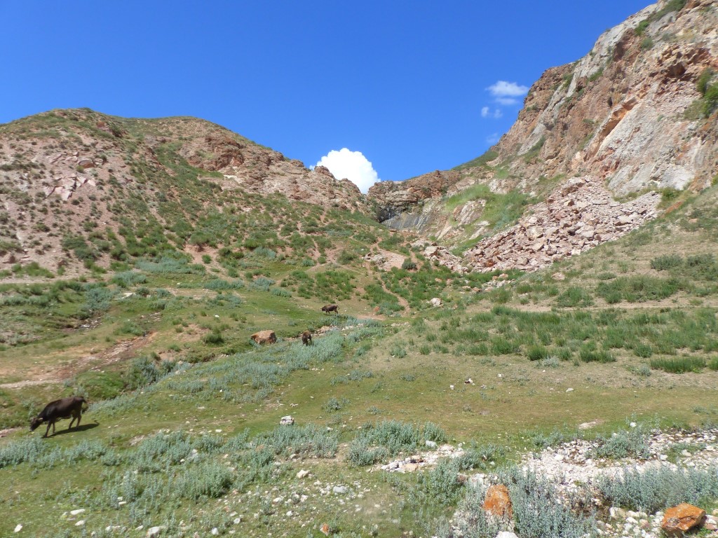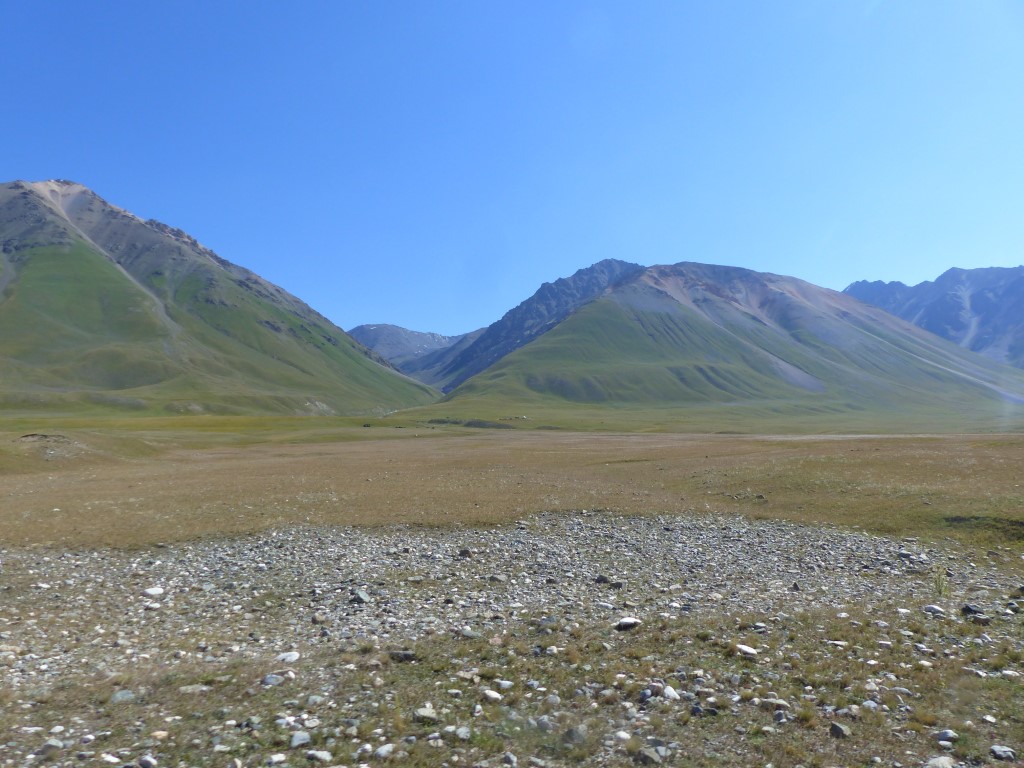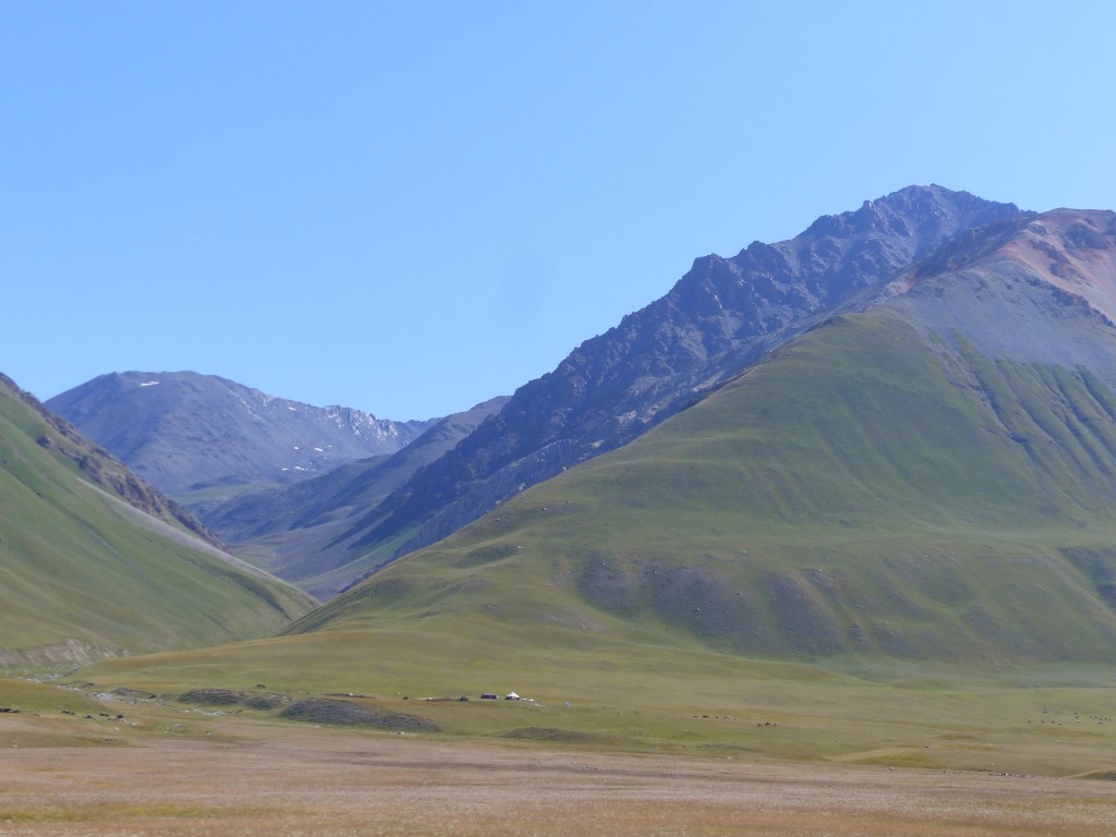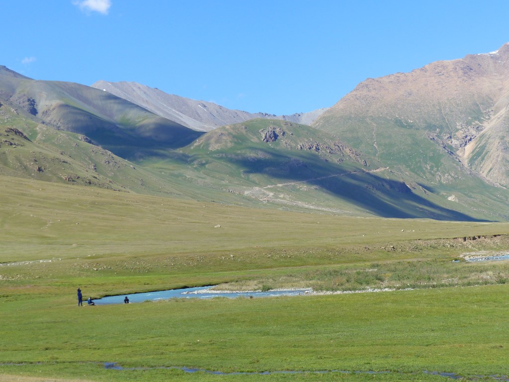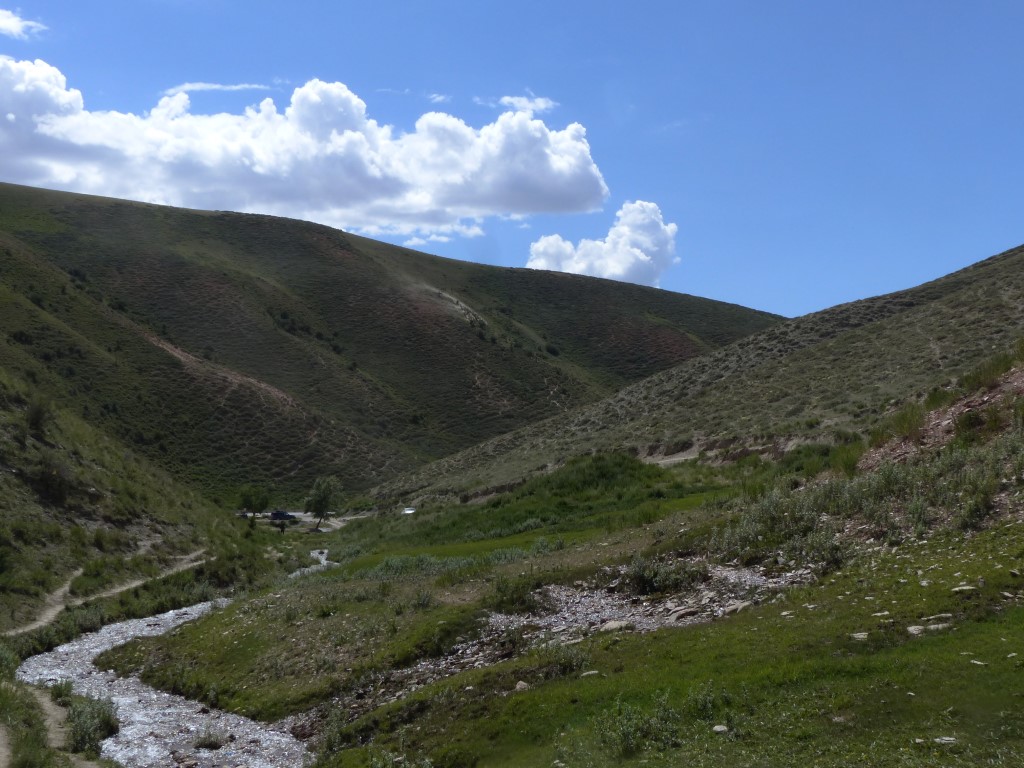 Le programme initial prévoyait une nuit au point A, puis une grande randonnée en montagne avec 700 m de dénivelé pour rejoindre – via le lac Techik kol - le point B (donc un peu plus haut dans la vallée), à l’endroit où Altimbeck nous aurait attendus avec la voiture et les tentes pour dresser le 2ème campement. Vu les capacités sportives du groupe (il est vrai qu’à 3500 m on est encore moins vaillants que d’habitude), Oulan nous propose de nous poser directement au point B pour 2 nuits, et de faire à partir de là une balade à la journée pour rejoindre le lac Techik kol. On accepte tout de suite la proposition, et c’est parti ….