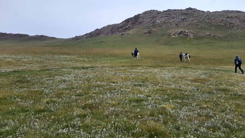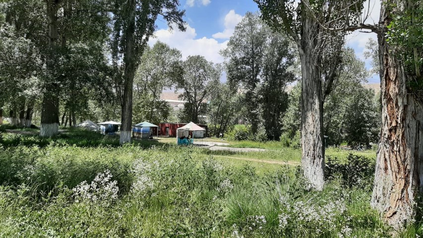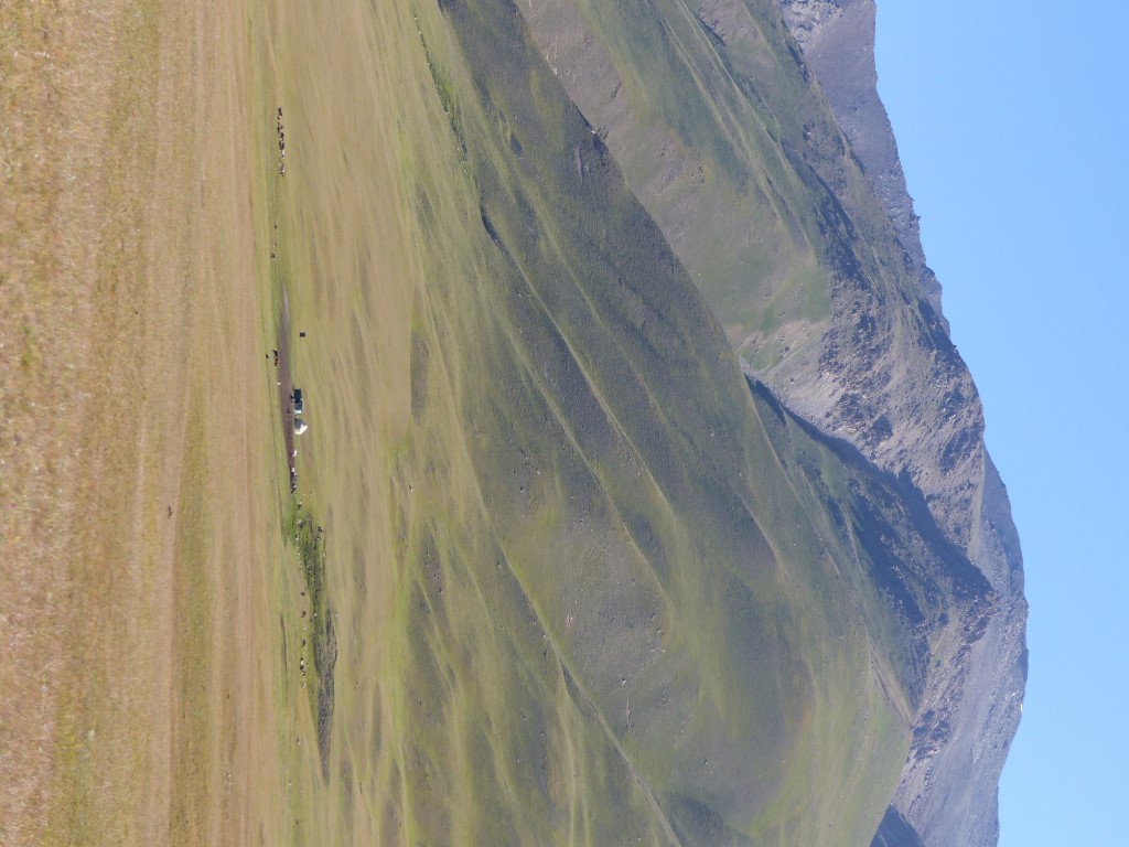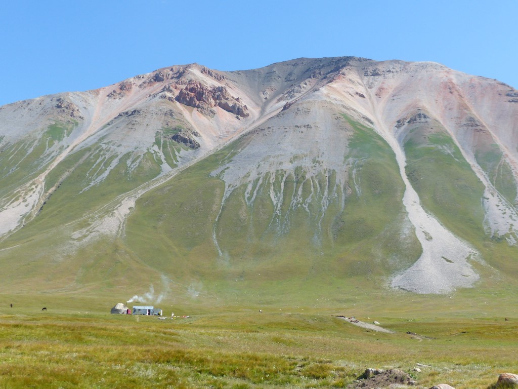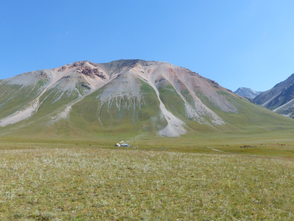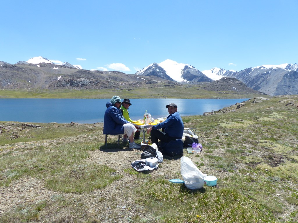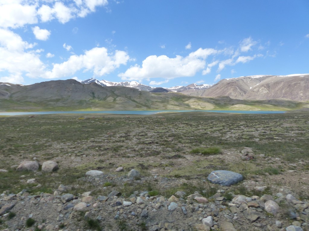Le programme initial prévoyait une nuit au point A, puis une grande randonnée en montagne avec 700 m de dénivelé pour rejoindre – via le lac Techik kol - le point B (donc un peu plus haut dans la vallée), à l’endroit où Altimbeck nous aurait attendus avec la voiture et les tentes pour dresser le 2ème campement. Vu les capacités sportives du groupe (il est vrai qu’à 3500 m on est encore moins vaillants que d’habitude), Oulan nous propose de nous poser directement au point B pour 2 nuits, et de faire à partir de là une balade à la journée pour rejoindre le lac Techik kol. On accepte tout de suite la proposition, et c’est parti ….