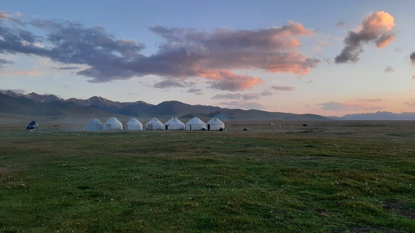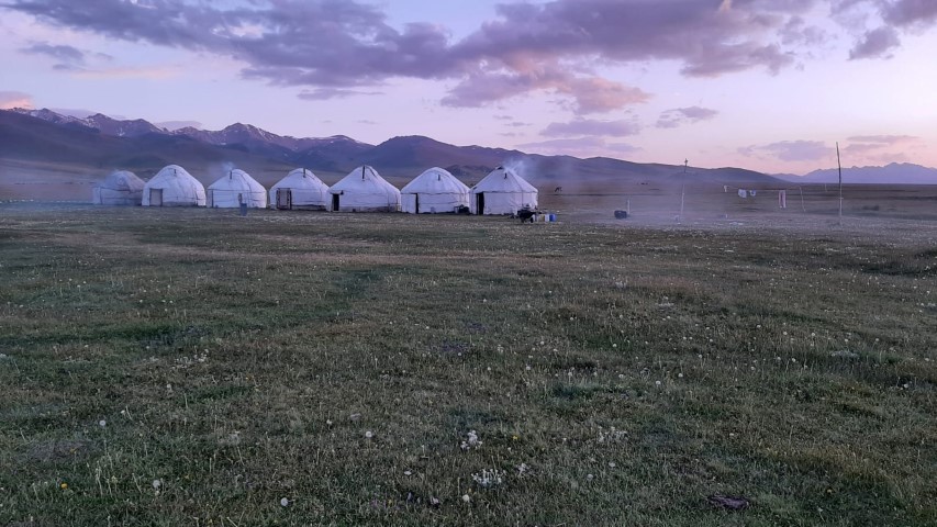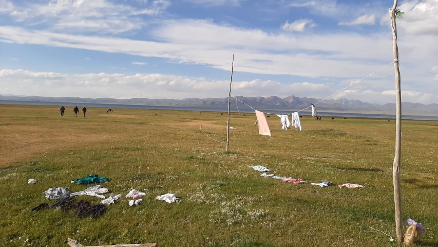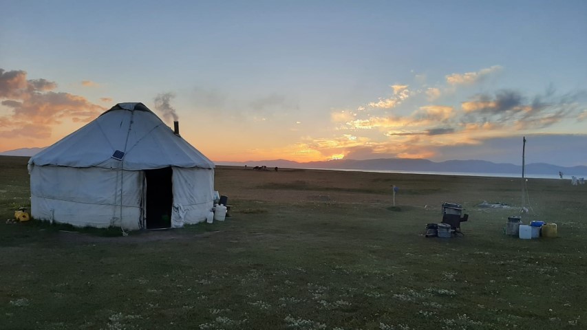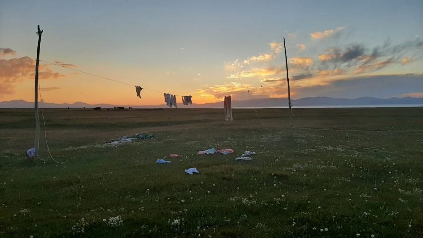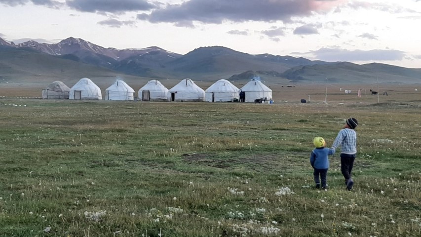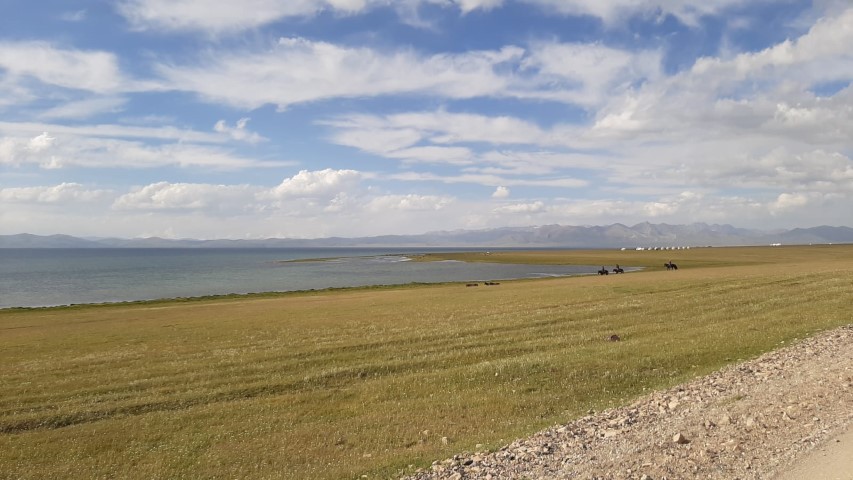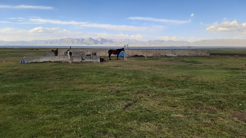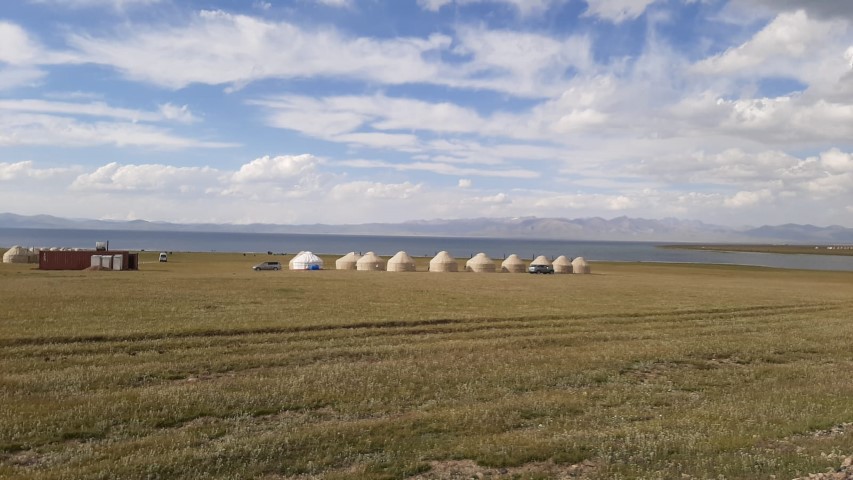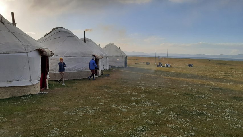 Sur le plateau, grande steppe façon Mongolie (nous n'y sommes jamais allés), nous apercevons les camps de yourtes, les troupes de chevaux, de vaches et de moutons. Le notre est composé de 7 yourtes alignées et tournées dos au vent dominant. La lumière est superbe. Nous sommes aux premières loges du lac Son Kul, le deuxième lac le plus haut en altitude au monde après le Titicaca.