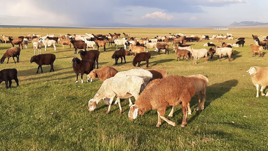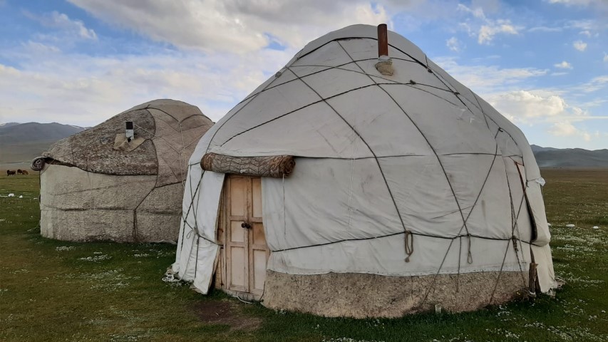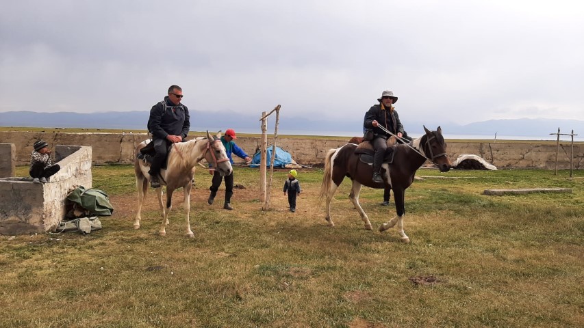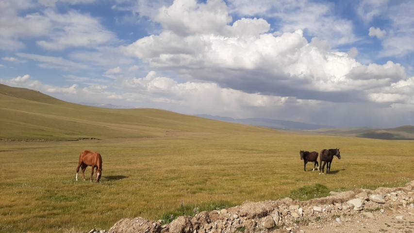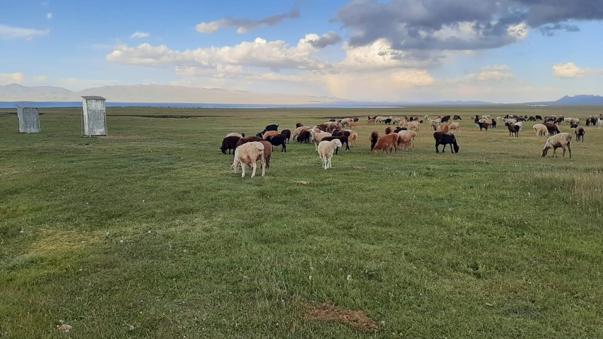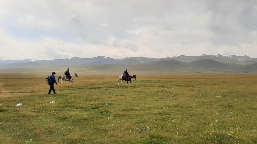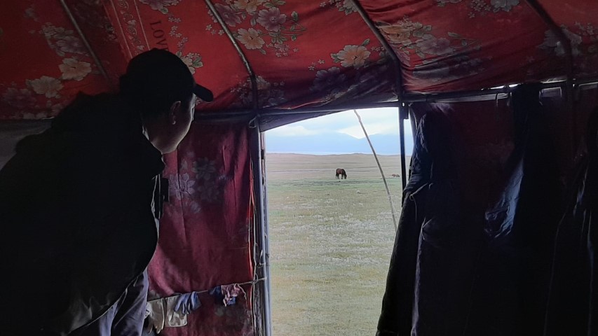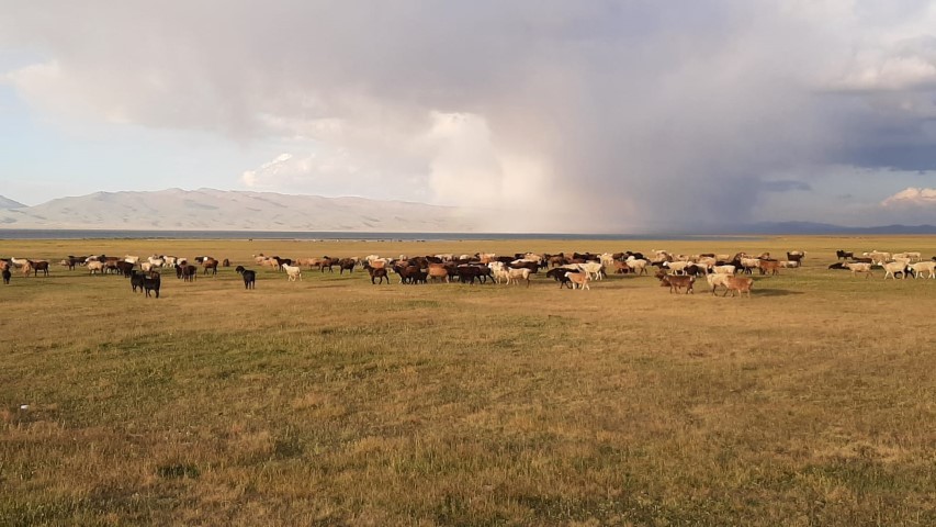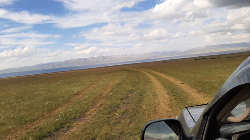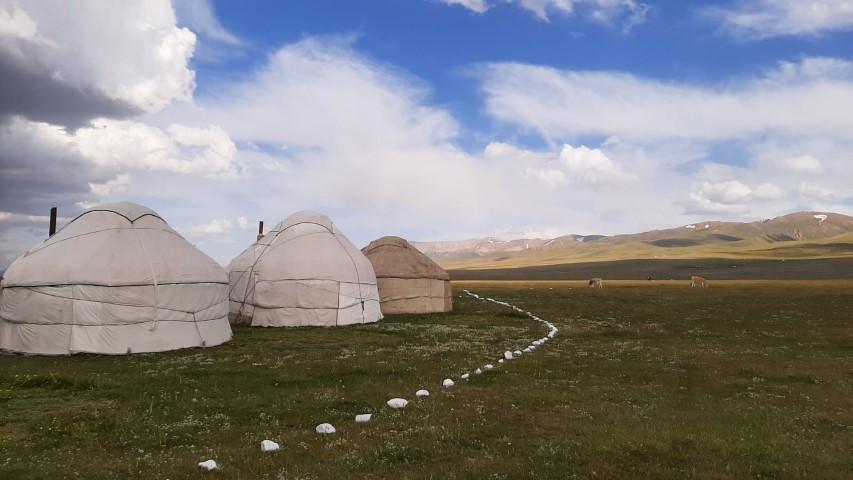 Sur le plateau, grande steppe façon Mongolie (nous n'y sommes jamais allés), nous apercevons les camps de yourtes, les troupes de chevaux, de vaches et de moutons. Le notre est composé de 7 yourtes alignées et tournées dos au vent dominant. La lumière est superbe. Nous sommes aux premières loges du lac Son Kul, le deuxième lac le plus haut en altitude au monde après le Titicaca.
