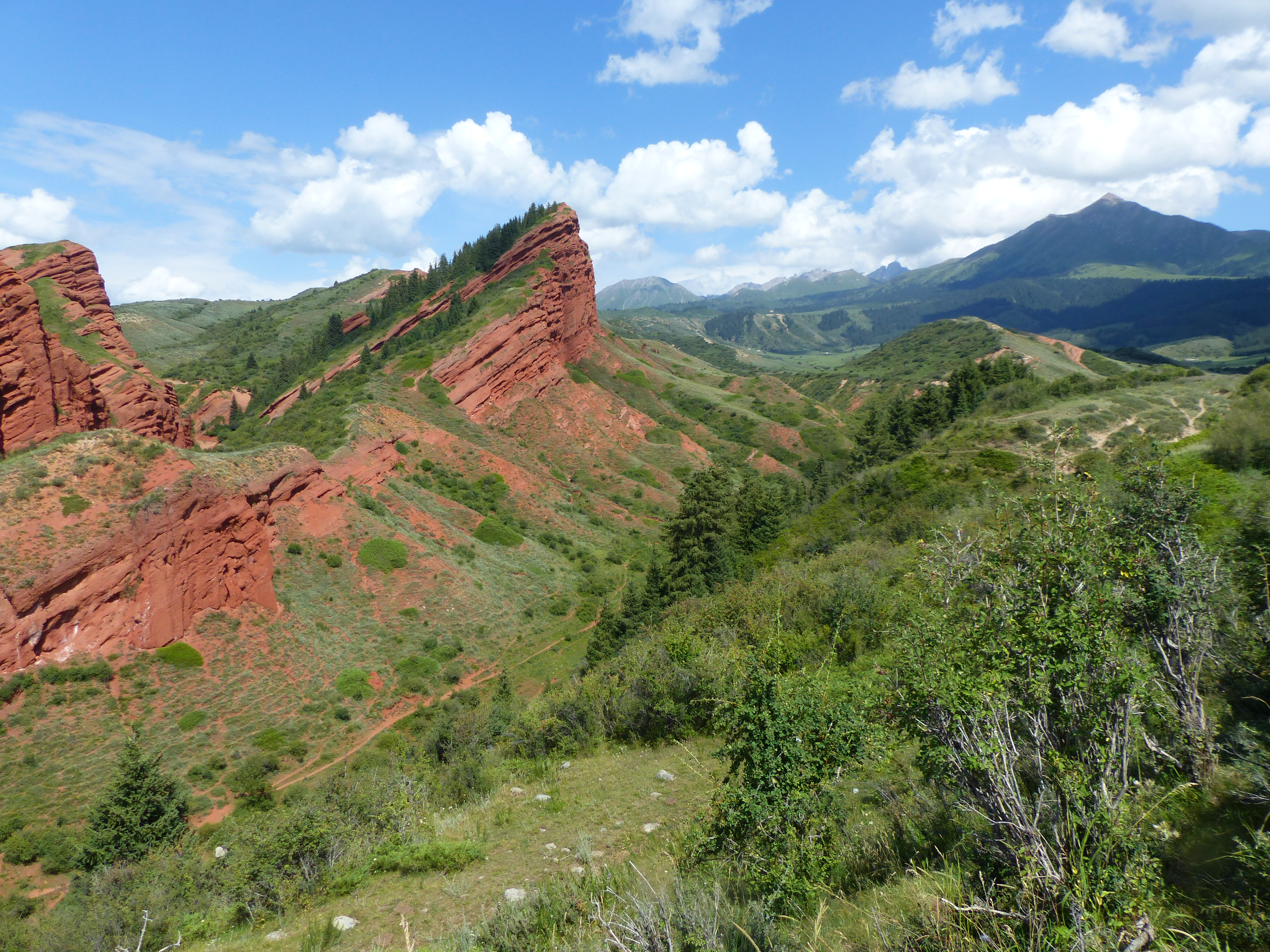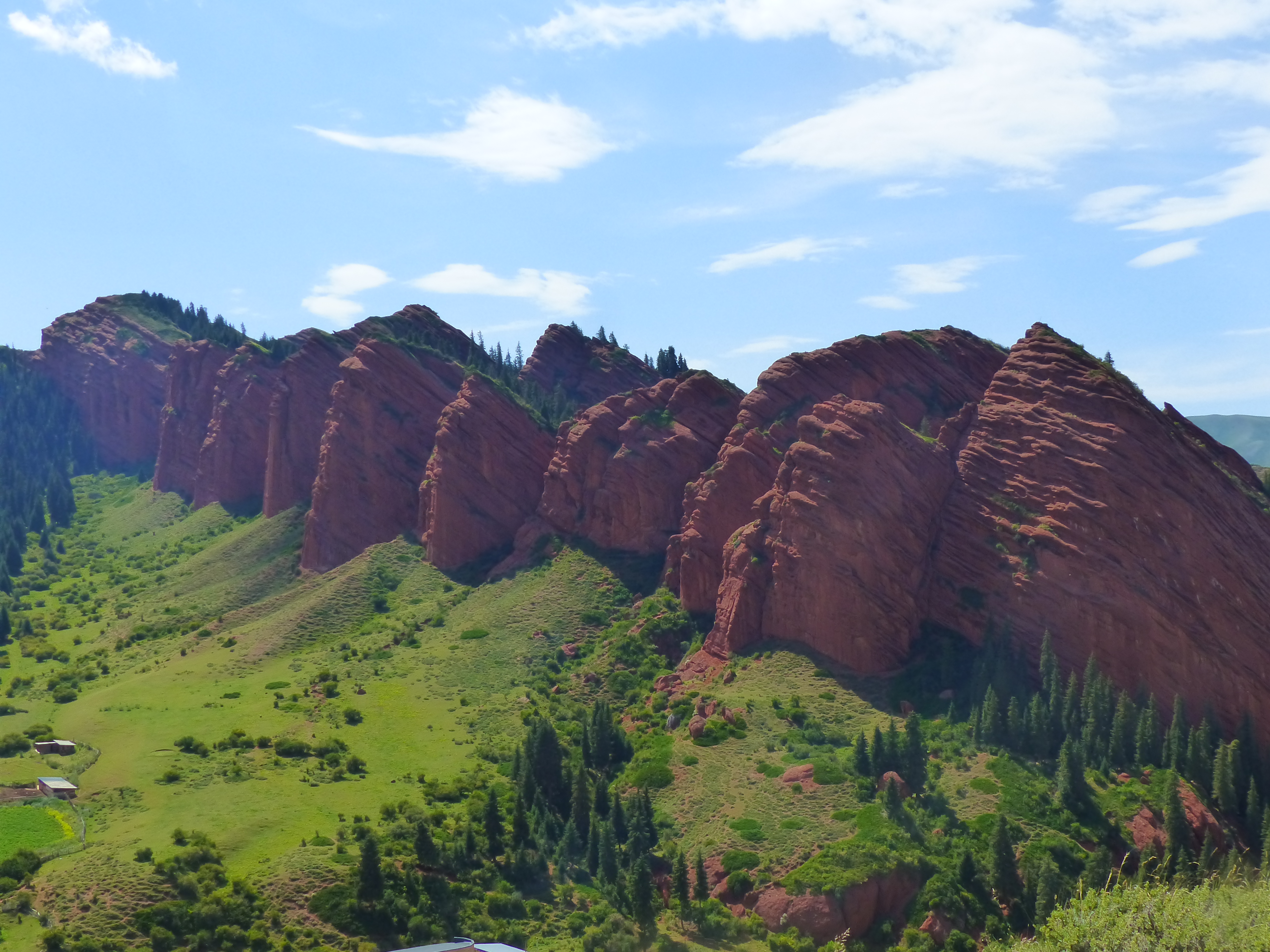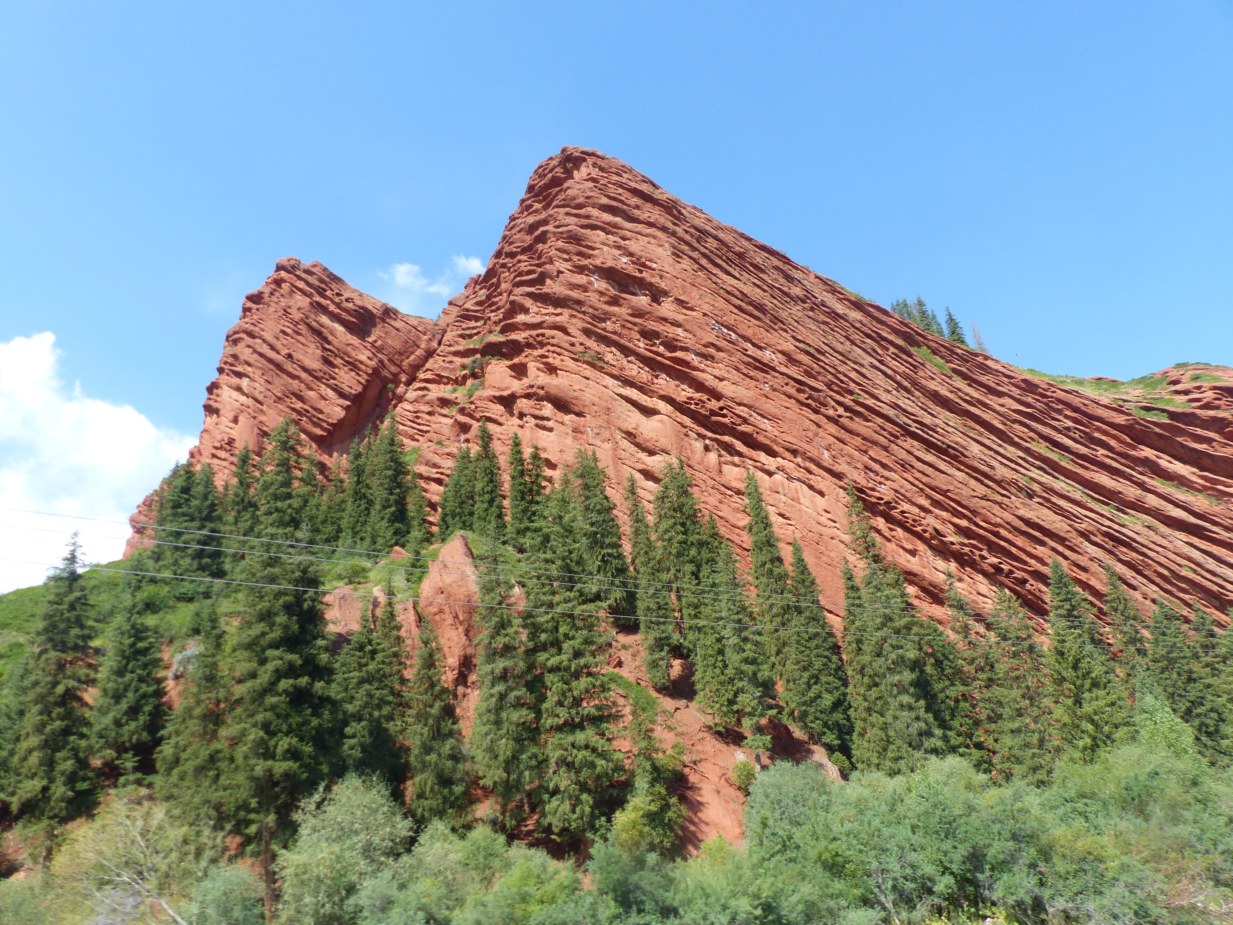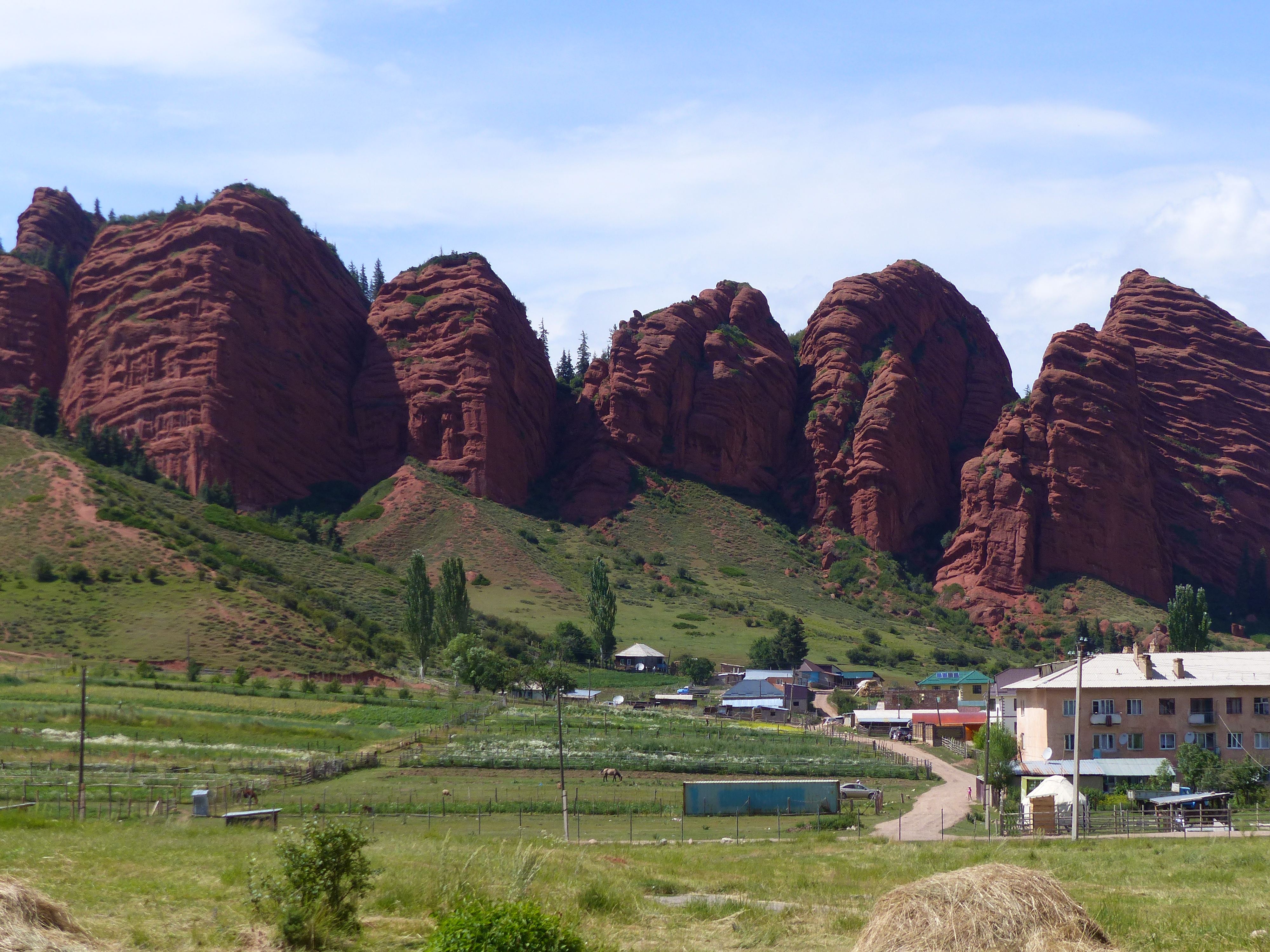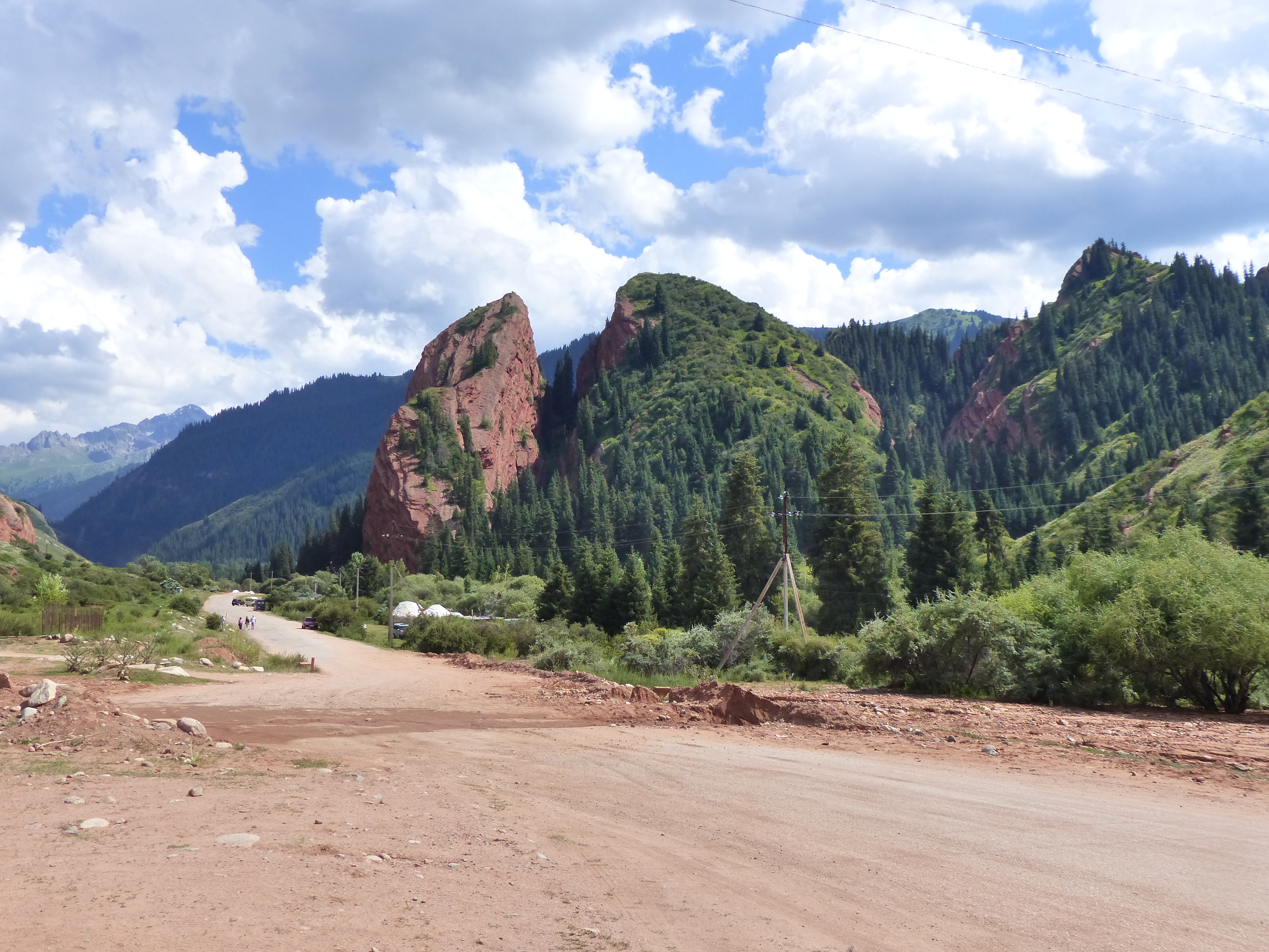 Nous quittons nos hôtes et cette guesthouse ma foi fort agréable (même si elle est encore en travaux), et rejoignons la vallée de Jeti Oguz, par une route plutôt facile qui, au début, longe de très près le lac Issy Kul. La température est hyper agréable, une petite brise agite les branches des millions d’abricotiers que l’on longe (d’ailleurs on passe à côté de « centres d’embauche au c … du camion » car on est en pleine récolte des abricots), le lac bleu scintille sous le soleil …. on se croirait vraiment au bord de la mer !