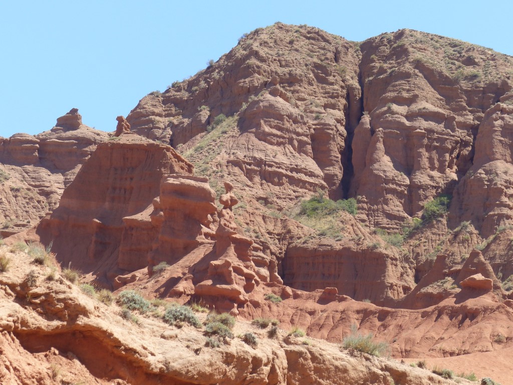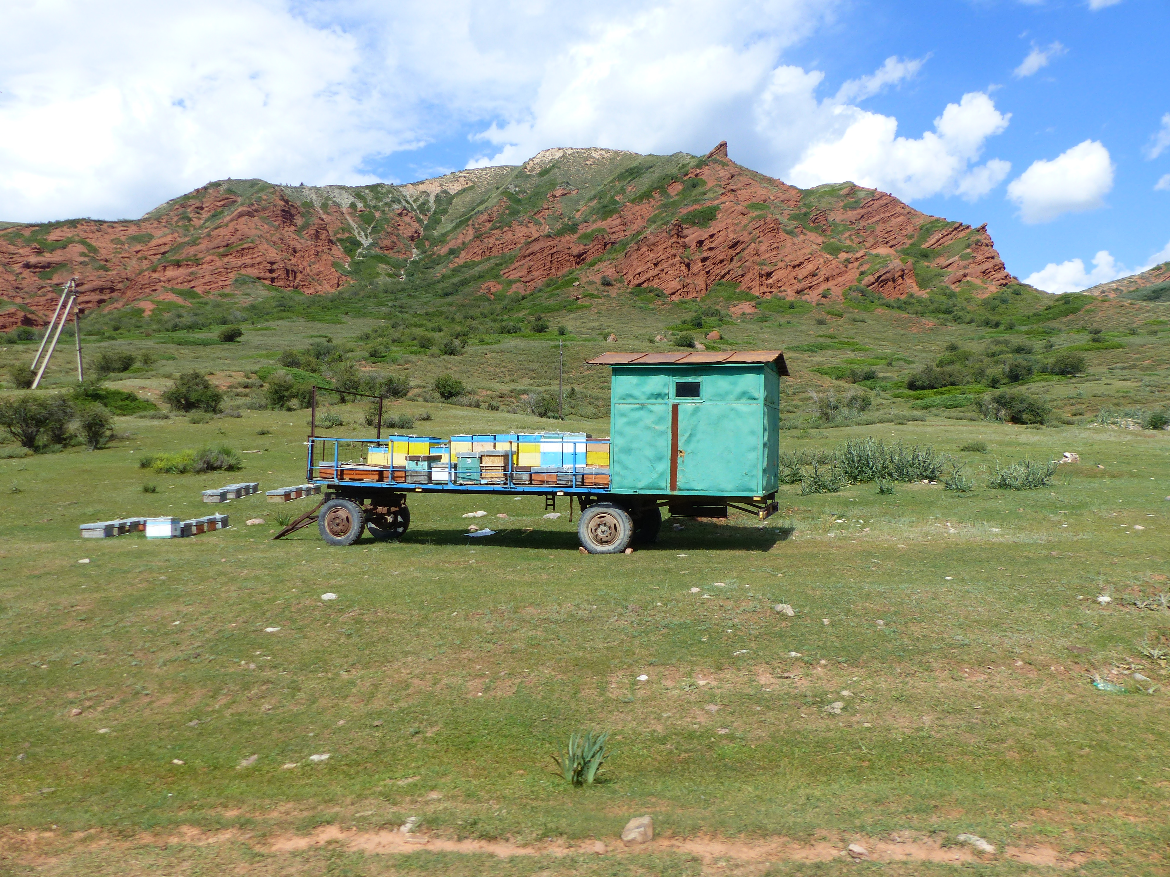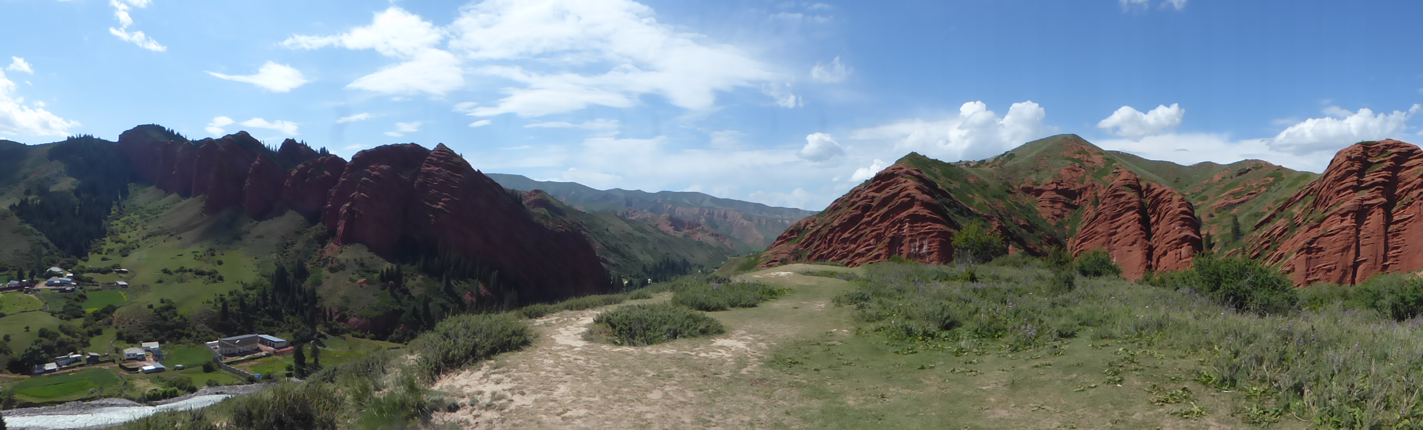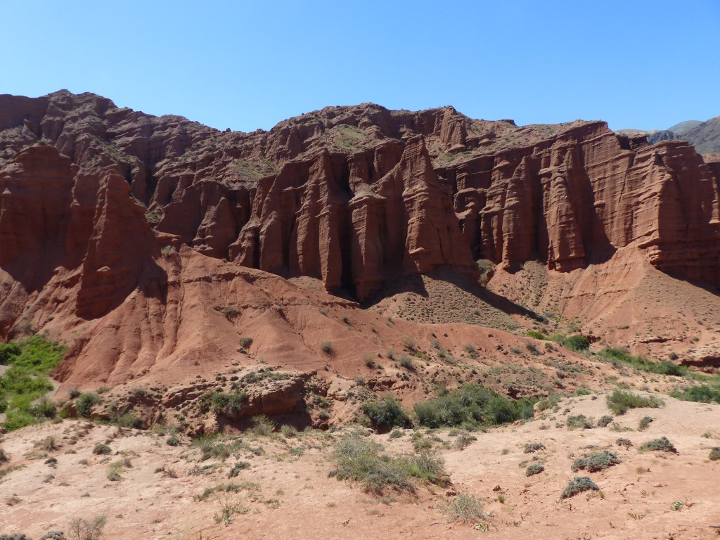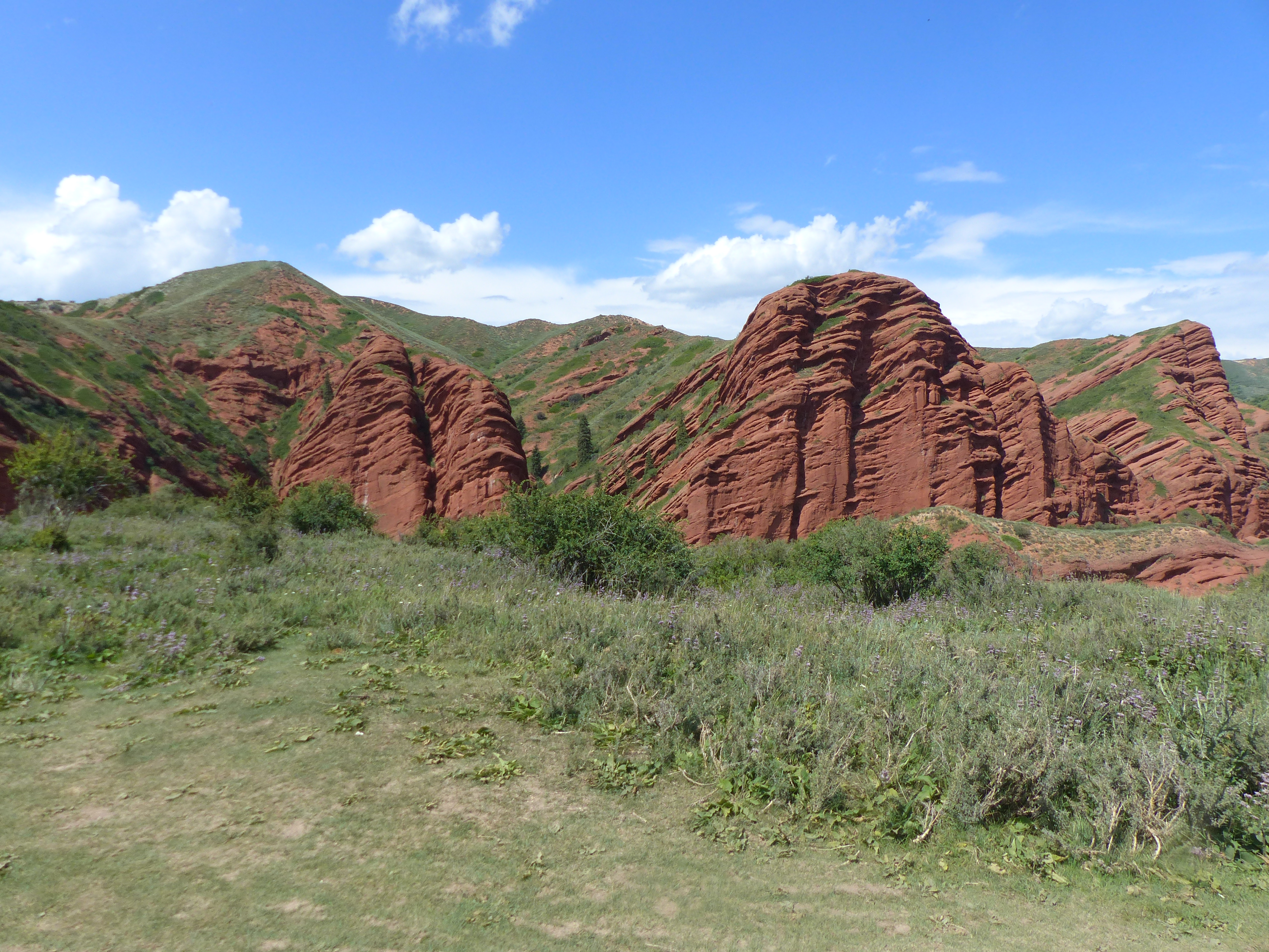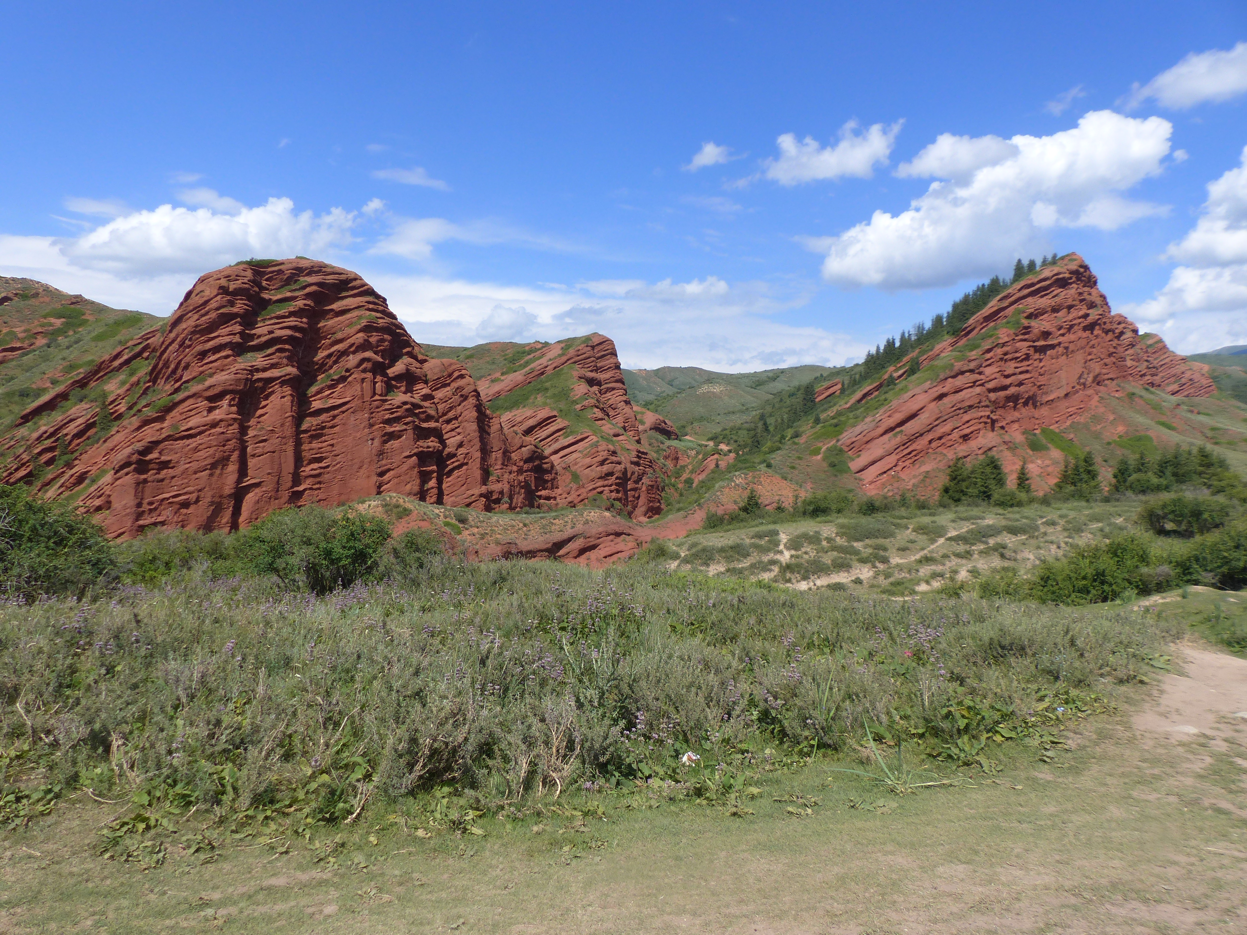 Nous quittons nos hôtes et cette guesthouse ma foi fort agréable (même si elle est encore en travaux), et rejoignons la vallée de Jeti Oguz, par une route plutôt facile qui, au début, longe de très près le lac Issy Kul. La température est hyper agréable, une petite brise agite les branches des millions d’abricotiers que l’on longe (d’ailleurs on passe à côté de « centres d’embauche au c … du camion » car on est en pleine récolte des abricots), le lac bleu scintille sous le soleil …. on se croirait vraiment au bord de la mer !