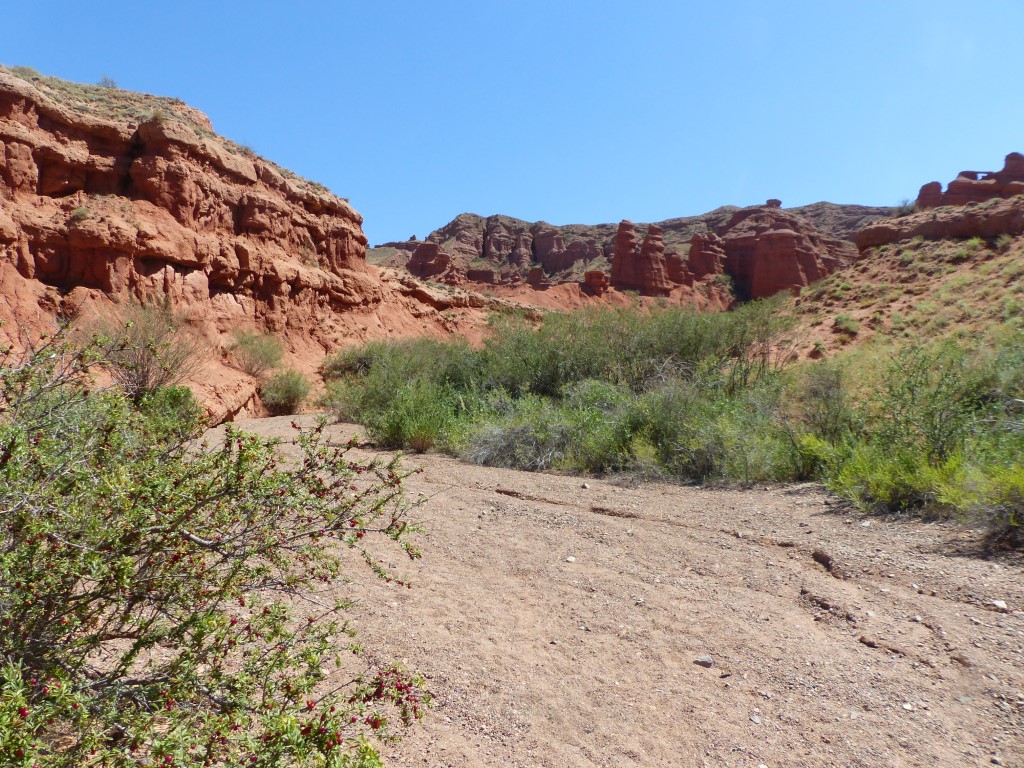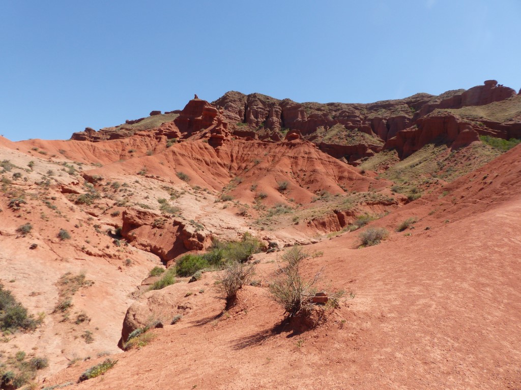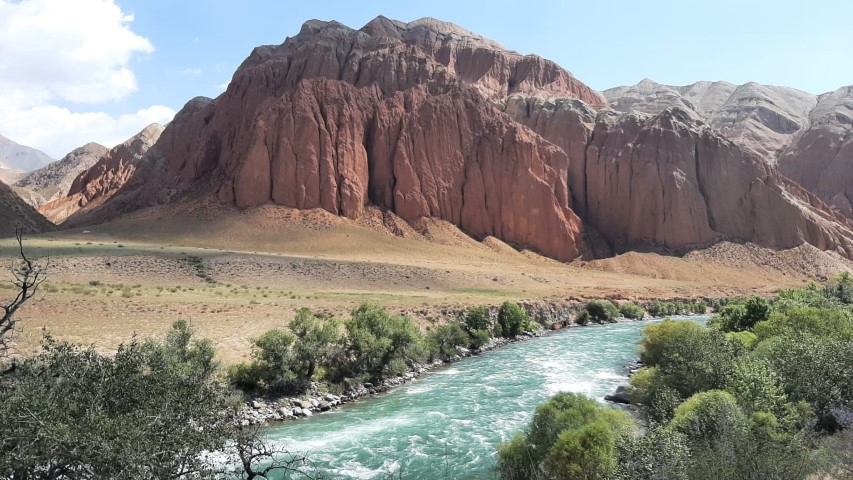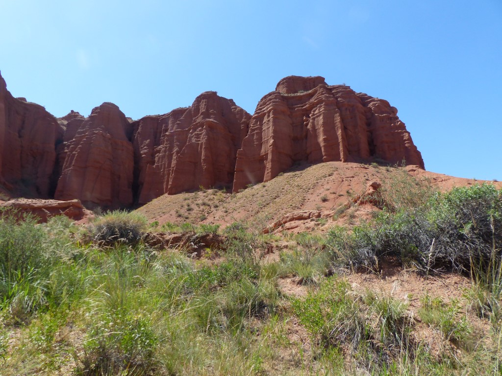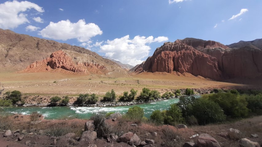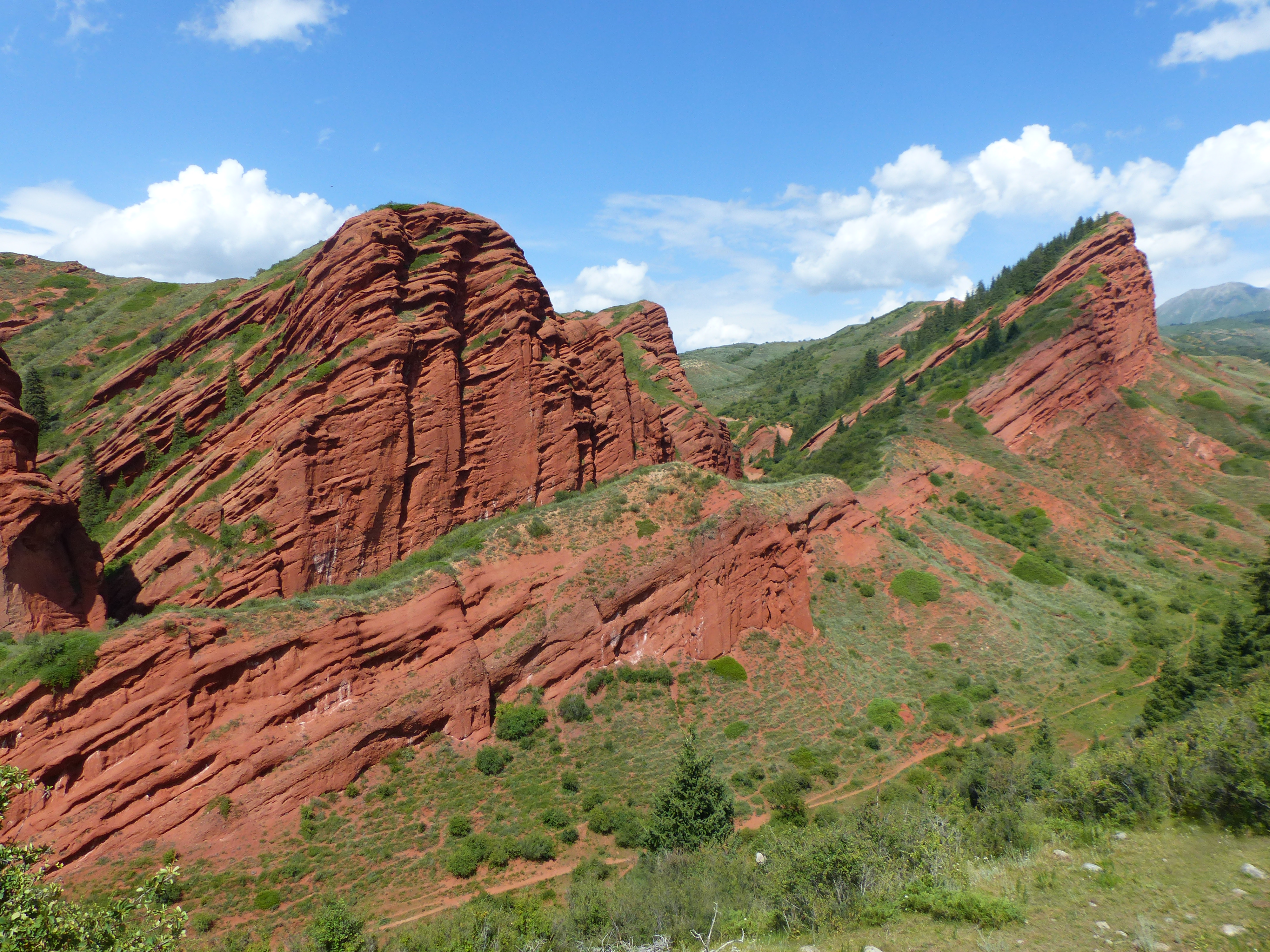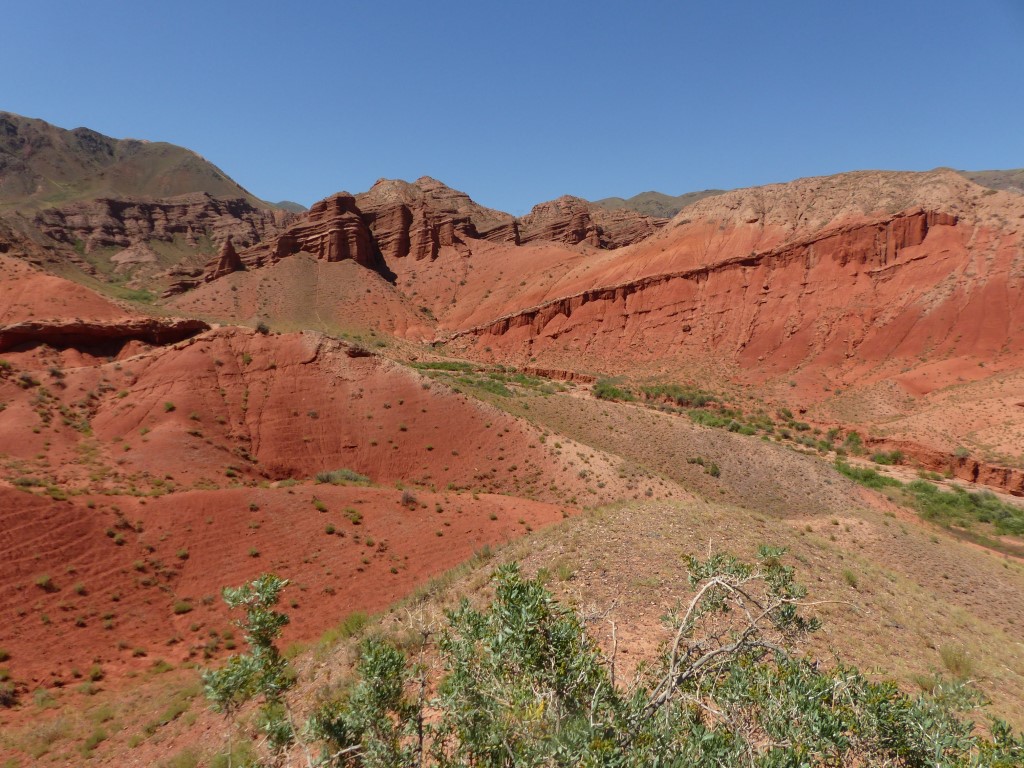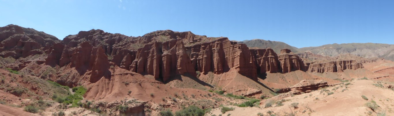 Nous quittons nos hôtes et cette guesthouse ma foi fort agréable (même si elle est encore en travaux), et rejoignons la vallée de Jeti Oguz, par une route plutôt facile qui, au début, longe de très près le lac Issy Kul. La température est hyper agréable, une petite brise agite les branches des millions d’abricotiers que l’on longe (d’ailleurs on passe à côté de « centres d’embauche au c … du camion » car on est en pleine récolte des abricots), le lac bleu scintille sous le soleil …. on se croirait vraiment au bord de la mer !