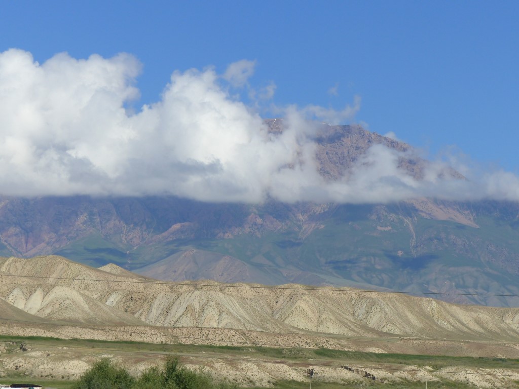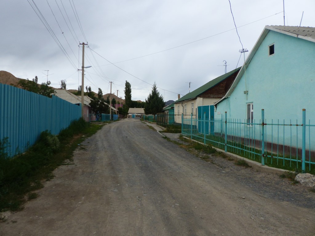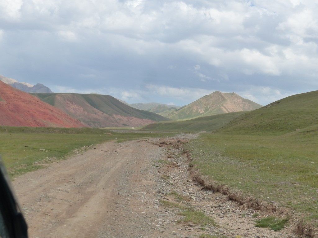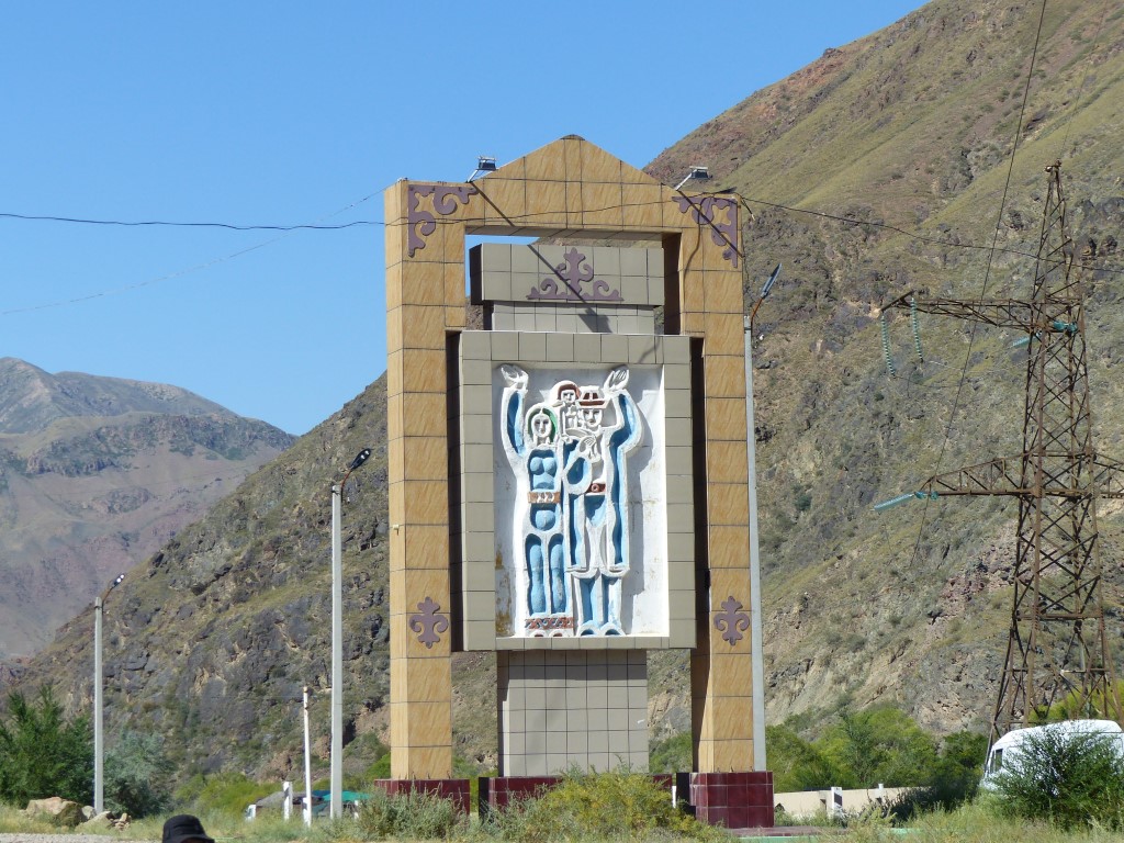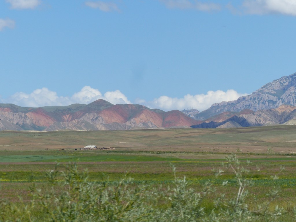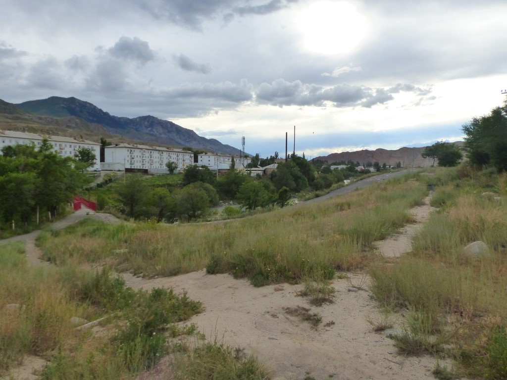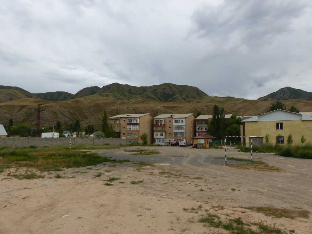 La route principale, que nous prenons ensuite plein Est, est beaucoup plus confortable que la piste. Nous longeons des chaînes de montagnes de part et d’autre, très hautes sur la droite, plutôt des « badlands » sur la gauche. Nous traversons la « rivière de Naryn », qui se jette dans le Syr Daria, lui même se jetant dans la Volga (j’en oublie peut être quelques uns au passage, mais je crois que l’essentiel y est), puis nous arrêtons près d’un tombeau (de qui ? j’ai oublié ….certainement d’un héros local….), et rejoignons la petite ville de Bateov où nous faisons les courses pour le pique nique. Didier, qui comate dans la voiture depuis le matin, accepte non sans mal de se faire examiner à l’hôpital local. La doctoresse qui lui prend la tension, déduit des explications apportées par Oulan sur les symptômes, que ce n’est pas le mal des montagnes mais la tourista. Ordonnance : éviter de manger des fruits et des légumes… Sur ces bonnes paroles, on continue notre route en remontant une vallée – après avoir fait le plain de gaz - pour atteindre un vert paturâge au bord d’une rivière (dans un parc naturel – donc dépôt d’ordures théoriquement interdit, contrairement au reste du pays où cela constitue une espèce de sport national). Le coin est charmant, mais comme très souvent quand on sort la table de pique nique, le temps change et le tonnerre se met à retentir. Cette fois ci on s’en sort sans gouttes, mais également sans sieste. On fait demi tour le long de notre vallée, puis on rejoint la route principale qui nous amène en une vingtaine de kilomètres à Naryn, petite ville (40 000 habitants environ) située à 2200 m. On s’installe dans notre maison d’hôtes puis après la petite sieste tant attendue, on sort faire un petit tour dans le quartier. Les environs de la ville semblent très beaux, de partout on aperçoit des « badlands » de toutes les couleurs. Ça donne envie d’aller d’y promener (ça tombe bien j’ai repéré une piste « les collines rouges », que je souhaite que l’on explore demain, même si ce n’est pas prévu au programme…). Pour l’heure, c’est dans la ville (quartiers résidentiels + rue Lénine, la rue principale), que nous déambulons en attendant l’heure du dîner. Etant donné l’état des troupes, Oulan a du juger bon de nous permettre de faire une petite incursion en gastronomie européenne : ce sera pizza dans un restau au look et à la clientèle partiellement européenne ! (enfin pizza pour ceux qui veulent car pour les irréductibles, les plats kirghizes figurent quand même à la carte).