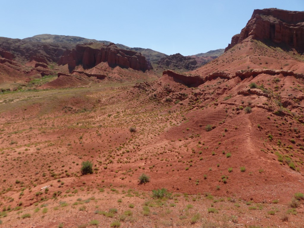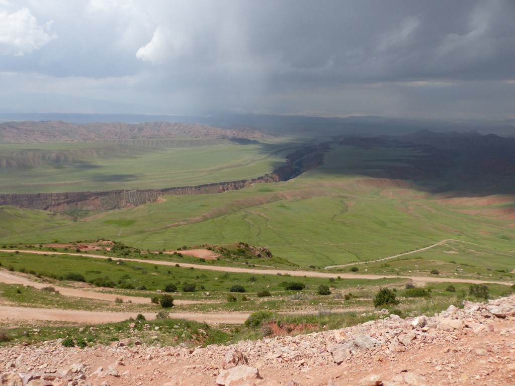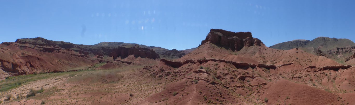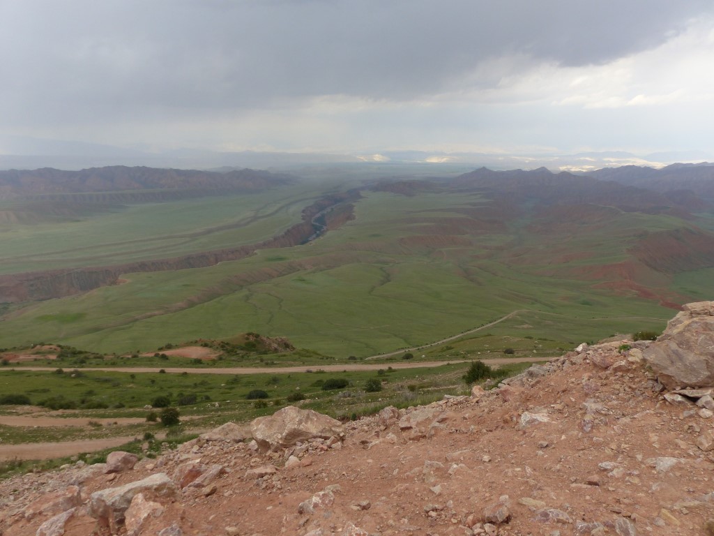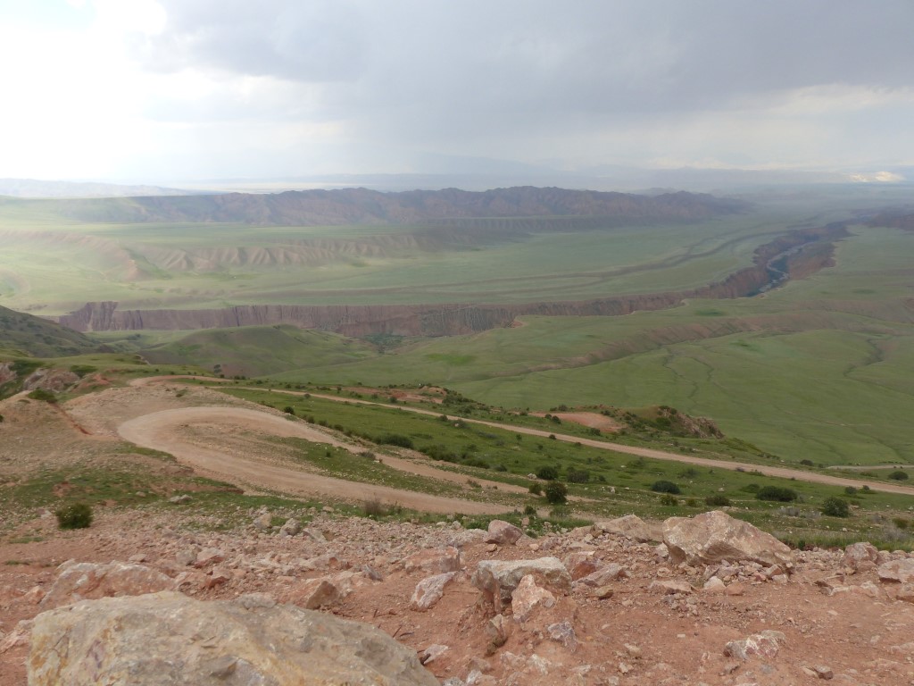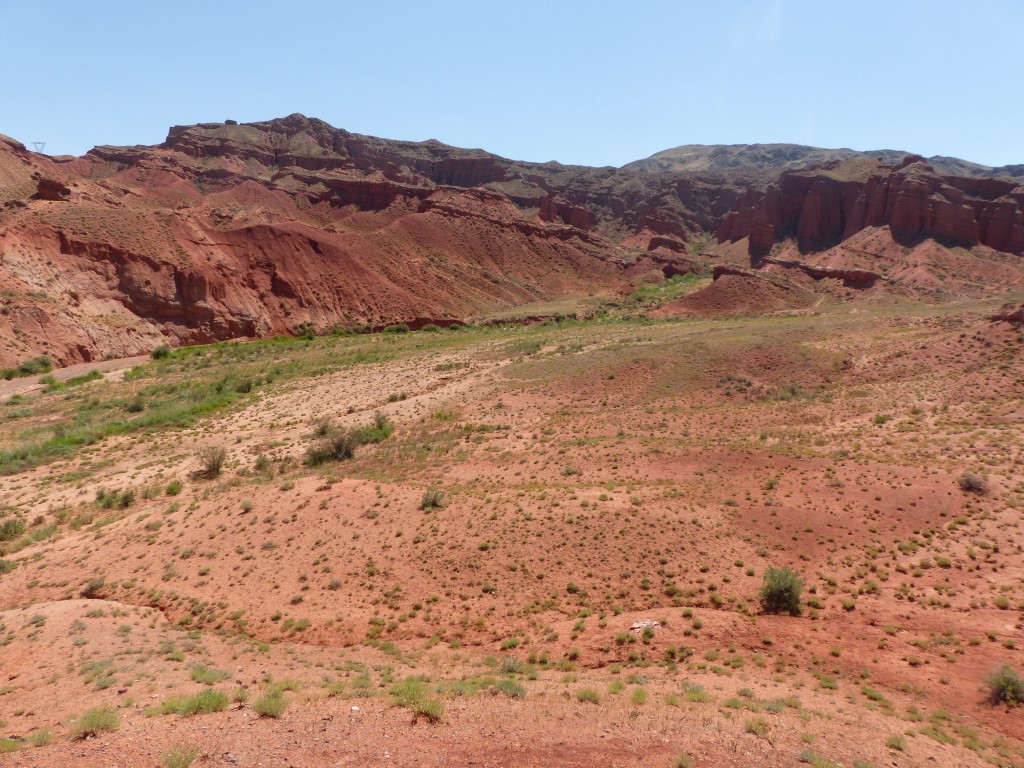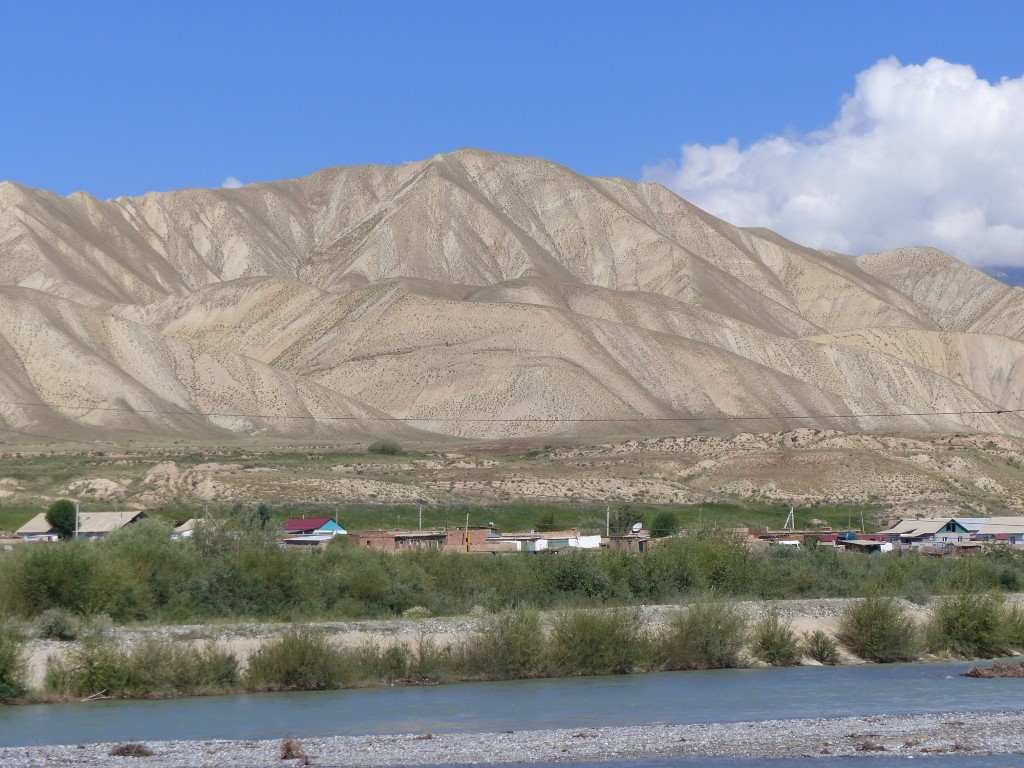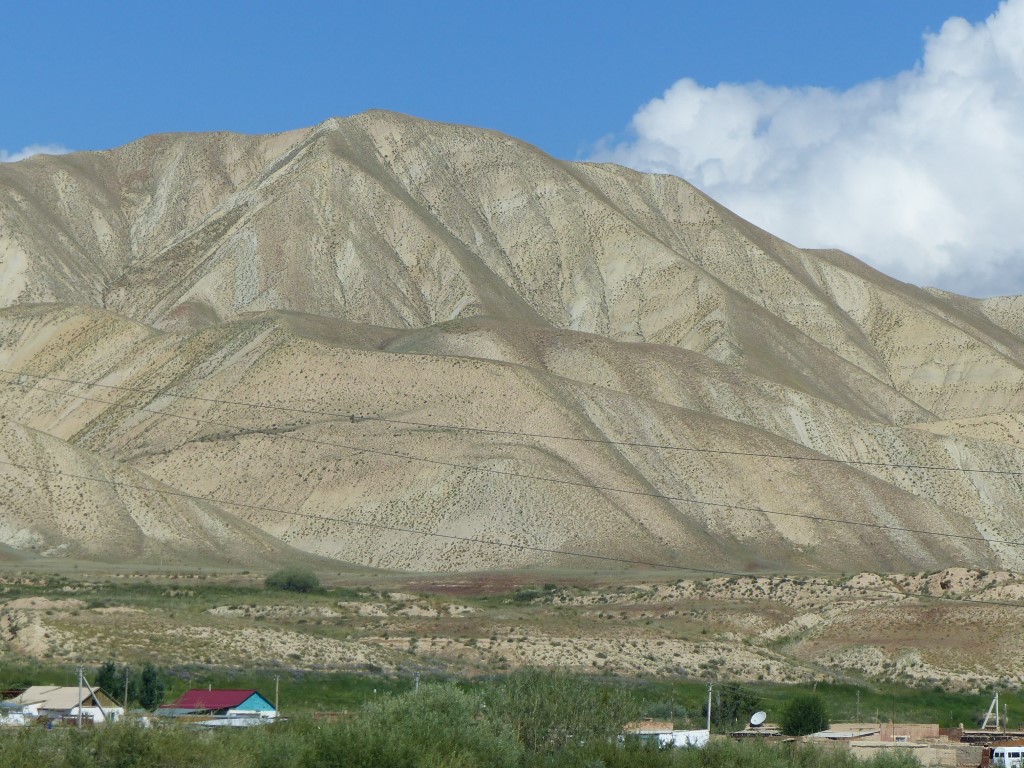 La route principale, que nous prenons ensuite plein Est, est beaucoup plus confortable que la piste. Nous longeons des chaînes de montagnes de part et d’autre, très hautes sur la droite, plutôt des « badlands » sur la gauche. Nous traversons la « rivière de Naryn », qui se jette dans le Syr Daria, lui même se jetant dans la Volga (j’en oublie peut être quelques uns au passage, mais je crois que l’essentiel y est), puis nous arrêtons près d’un tombeau (de qui ? j’ai oublié ….certainement d’un héros local….), et rejoignons la petite ville de Bateov où nous faisons les courses pour le pique nique. Didier, qui comate dans la voiture depuis le matin, accepte non sans mal de se faire examiner à l’hôpital local. La doctoresse qui lui prend la tension, déduit des explications apportées par Oulan sur les symptômes, que ce n’est pas le mal des montagnes mais la tourista. Ordonnance : éviter de manger des fruits et des légumes… Sur ces bonnes paroles, on continue notre route en remontant une vallée – après avoir fait le plain de gaz - pour atteindre un vert paturâge au bord d’une rivière (dans un parc naturel – donc dépôt d’ordures théoriquement interdit, contrairement au reste du pays où cela constitue une espèce de sport national). Le coin est charmant, mais comme très souvent quand on sort la table de pique nique, le temps change et le tonnerre se met à retentir. Cette fois ci on s’en sort sans gouttes, mais également sans sieste. On fait demi tour le long de notre vallée, puis on rejoint la route principale qui nous amène en une vingtaine de kilomètres à Naryn, petite ville (40 000 habitants environ) située à 2200 m. On s’installe dans notre maison d’hôtes puis après la petite sieste tant attendue, on sort faire un petit tour dans le quartier. Les environs de la ville semblent très beaux, de partout on aperçoit des « badlands » de toutes les couleurs. Ça donne envie d’aller d’y promener (ça tombe bien j’ai repéré une piste « les collines rouges », que je souhaite que l’on explore demain, même si ce n’est pas prévu au programme…). Pour l’heure, c’est dans la ville (quartiers résidentiels + rue Lénine, la rue principale), que nous déambulons en attendant l’heure du dîner. Etant donné l’état des troupes, Oulan a du juger bon de nous permettre de faire une petite incursion en gastronomie européenne : ce sera pizza dans un restau au look et à la clientèle partiellement européenne ! (enfin pizza pour ceux qui veulent car pour les irréductibles, les plats kirghizes figurent quand même à la carte).