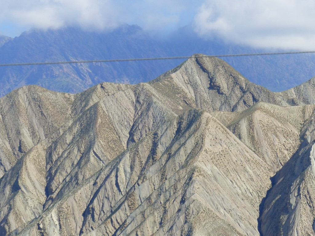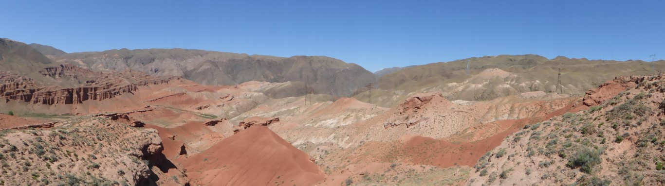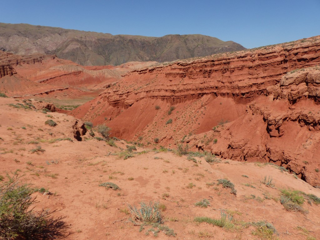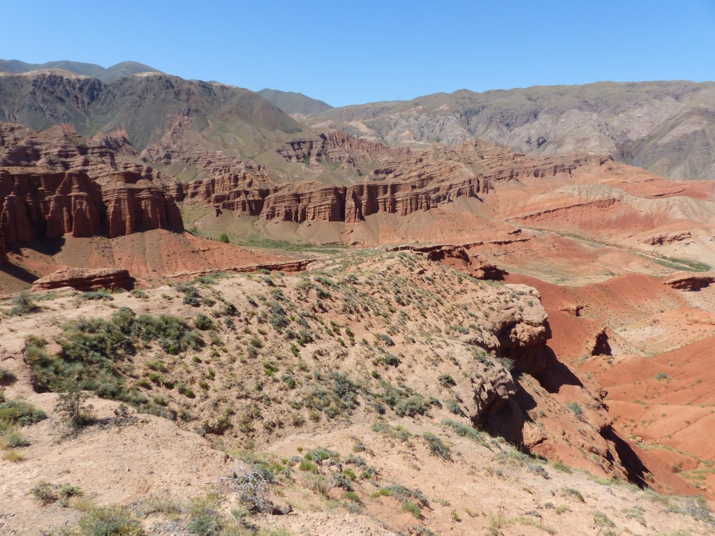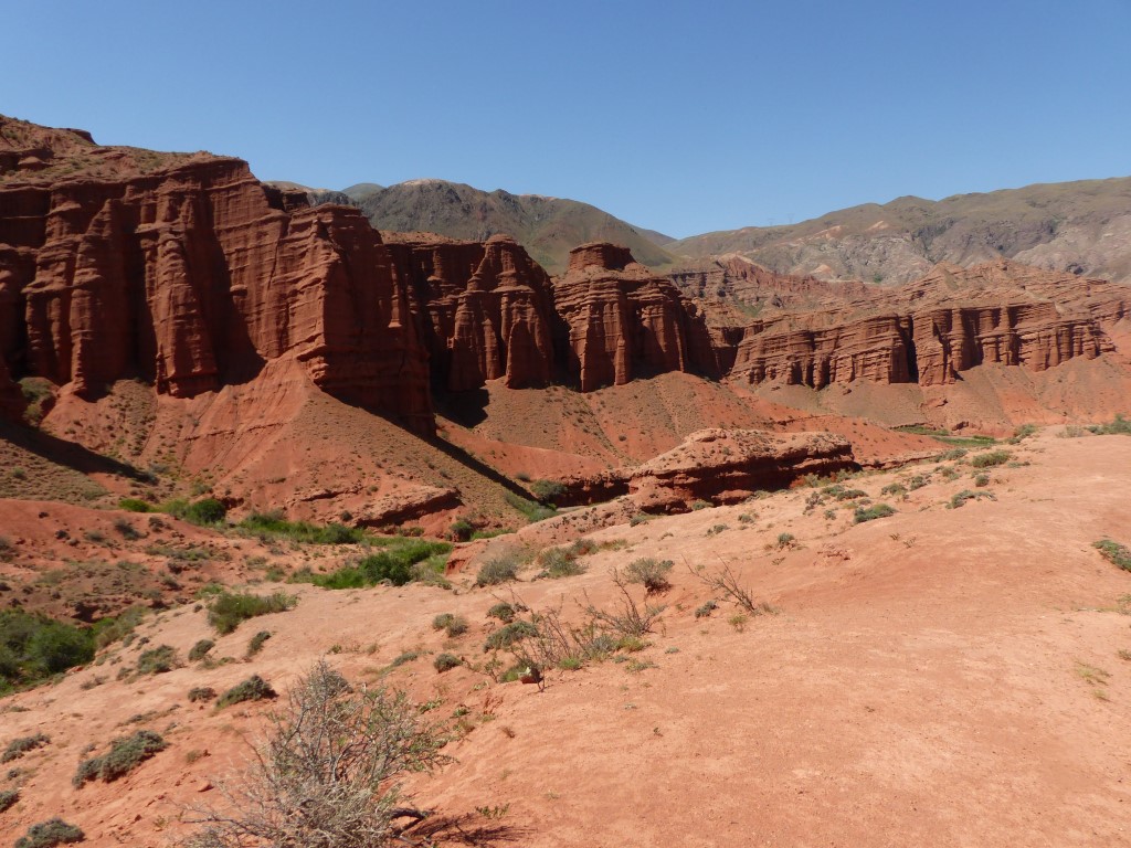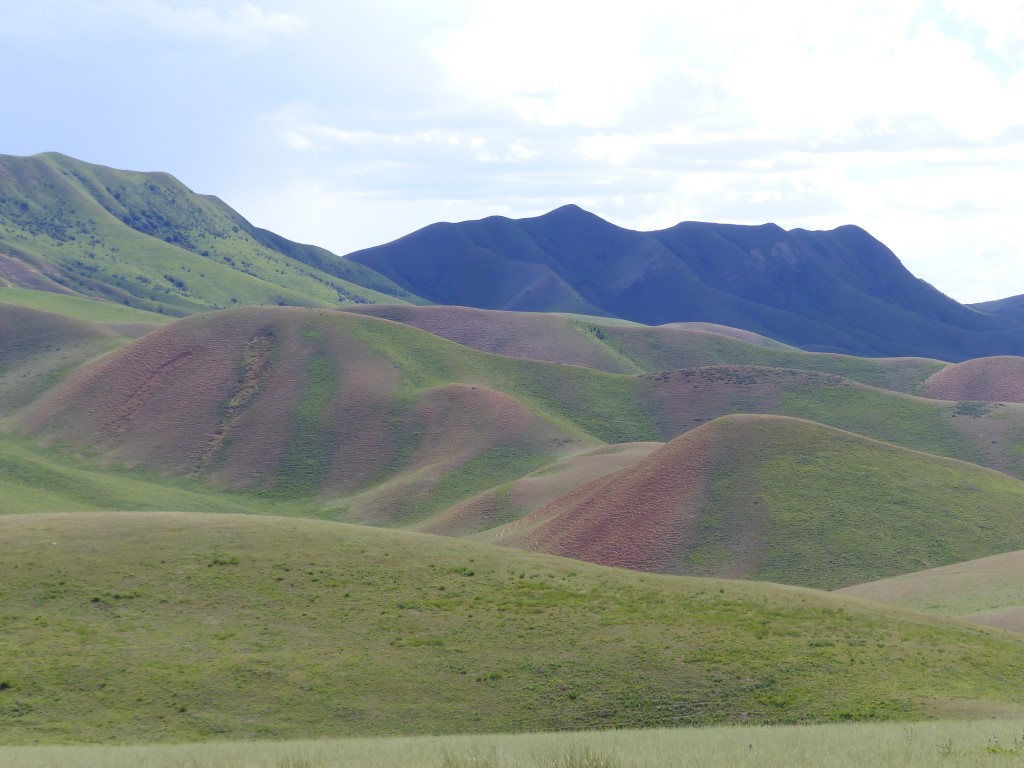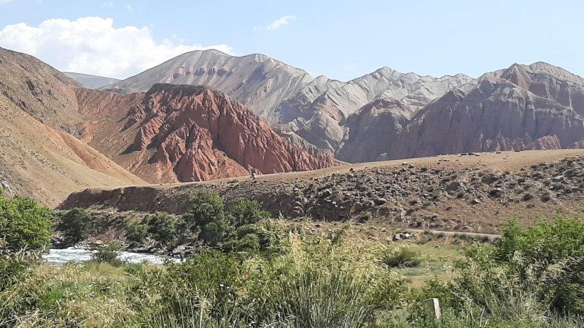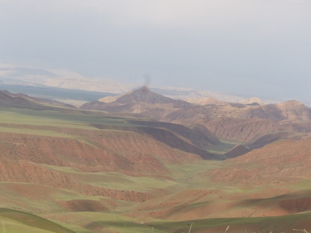 La route principale, que nous prenons ensuite plein Est, est beaucoup plus confortable que la piste. Nous longeons des chaînes de montagnes de part et d’autre, très hautes sur la droite, plutôt des « badlands » sur la gauche. Nous traversons la « rivière de Naryn », qui se jette dans le Syr Daria, lui même se jetant dans la Volga (j’en oublie peut être quelques uns au passage, mais je crois que l’essentiel y est), puis nous arrêtons près d’un tombeau (de qui ? j’ai oublié ….certainement d’un héros local….), et rejoignons la petite ville de Bateov où nous faisons les courses pour le pique nique. Didier, qui comate dans la voiture depuis le matin, accepte non sans mal de se faire examiner à l’hôpital local. La doctoresse qui lui prend la tension, déduit des explications apportées par Oulan sur les symptômes, que ce n’est pas le mal des montagnes mais la tourista. Ordonnance : éviter de manger des fruits et des légumes… Sur ces bonnes paroles, on continue notre route en remontant une vallée – après avoir fait le plain de gaz - pour atteindre un vert paturâge au bord d’une rivière (dans un parc naturel – donc dépôt d’ordures théoriquement interdit, contrairement au reste du pays où cela constitue une espèce de sport national). Le coin est charmant, mais comme très souvent quand on sort la table de pique nique, le temps change et le tonnerre se met à retentir. Cette fois ci on s’en sort sans gouttes, mais également sans sieste. On fait demi tour le long de notre vallée, puis on rejoint la route principale qui nous amène en une vingtaine de kilomètres à Naryn, petite ville (40 000 habitants environ) située à 2200 m. On s’installe dans notre maison d’hôtes puis après la petite sieste tant attendue, on sort faire un petit tour dans le quartier. Les environs de la ville semblent très beaux, de partout on aperçoit des « badlands » de toutes les couleurs. Ça donne envie d’aller d’y promener (ça tombe bien j’ai repéré une piste « les collines rouges », que je souhaite que l’on explore demain, même si ce n’est pas prévu au programme…). Pour l’heure, c’est dans la ville (quartiers résidentiels + rue Lénine, la rue principale), que nous déambulons en attendant l’heure du dîner. Etant donné l’état des troupes, Oulan a du juger bon de nous permettre de faire une petite incursion en gastronomie européenne : ce sera pizza dans un restau au look et à la clientèle partiellement européenne ! (enfin pizza pour ceux qui veulent car pour les irréductibles, les plats kirghizes figurent quand même à la carte).