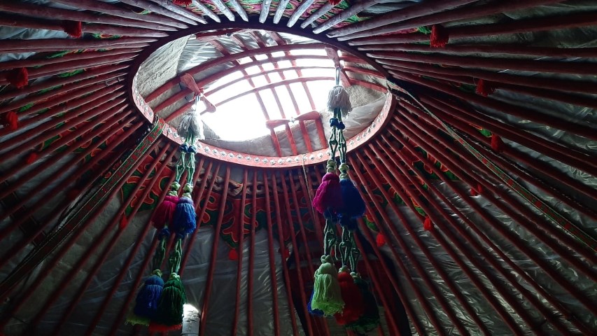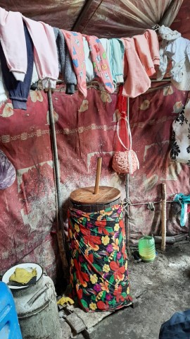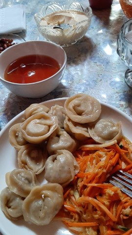 Une yourte est réservée aux repas, enfin les nôtres, ceux des touristes. Le repas est la plupart du temps servi en une fois; une entrée concombre-tomates, un plat unique à base de viande accompagnée de pommes de terre ou insérée dans une pâte (genre raviolis). Le pain est toujours présent, ainsi que le thé qui est la seule boisson servie à table (pas d'eau).