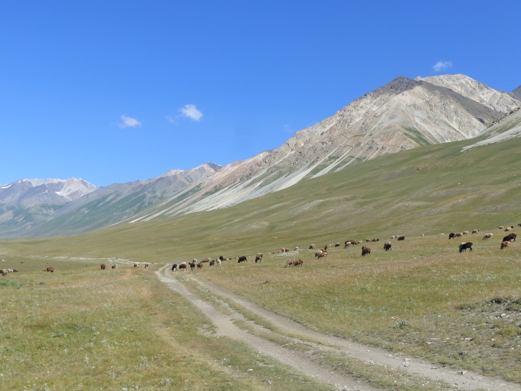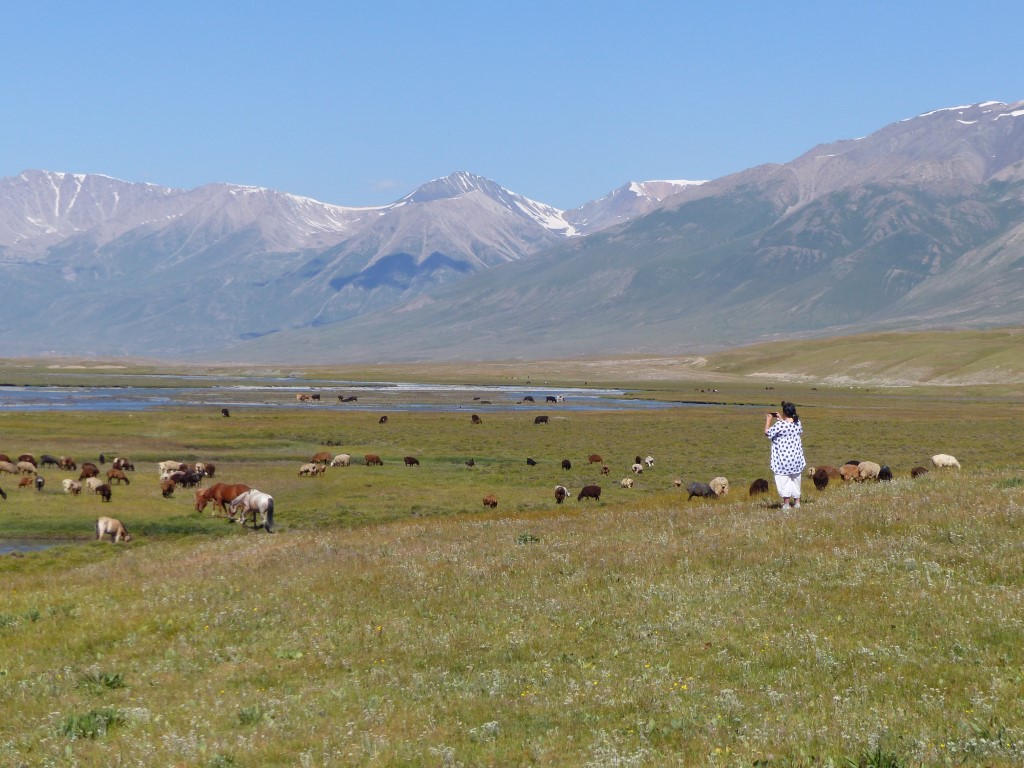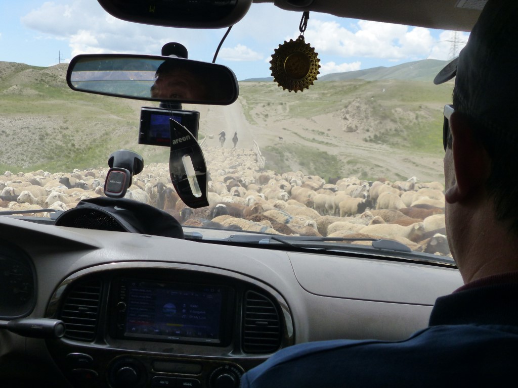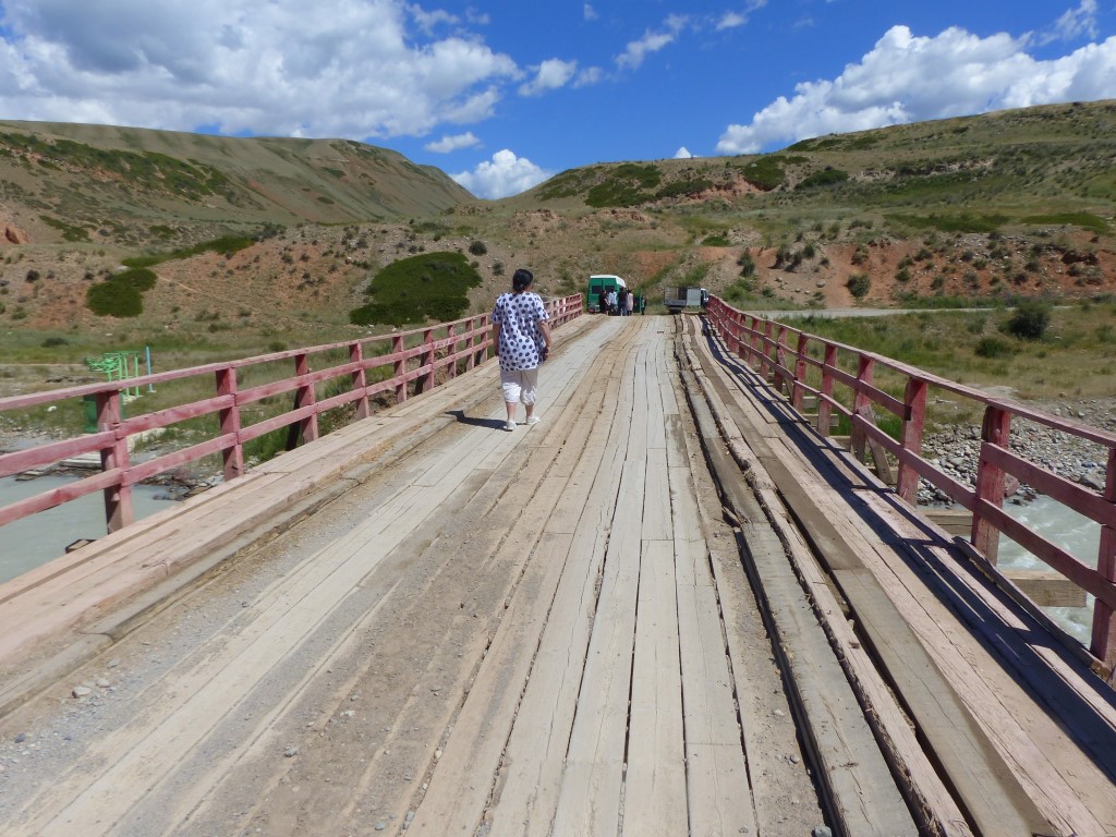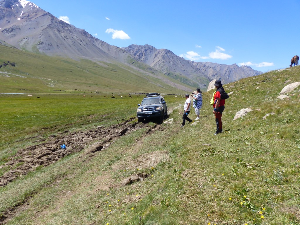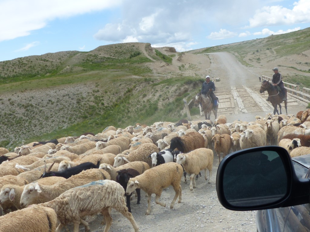 Mais revenons à notre road trip du jour … à la fin de cette vallée civilisée, on rejoint une piste (la piste N°13 du bouquin Kirghistan off road, pour ceux qui auraient envie de la refaire une jour), on traverse un « petit pont de bois » (private joke) légèrement branlant – on s’est quand même assurés qu’une famille de 20 personnes dans leur mini bus perso, en route pour un pique nique montagnard – passait sans encombre ; et pour faire bonne mesure on a confirmé l’info avec le passage d’un troupeau de vaches. Ces vérifications faites, on cherche notre chauffeur Altimbeck, qui a pris de la hauteur pour capter le réseau téléphonique. C’est alors qu’on apprend que depuis le milieu de la nuit, il n’a pas dormi, étant en lien permanent avec son village et sa ferme : en effet, son fils de 15 ans, certainement occupé à gagner des vies sur un jeu vidéo, n’a rien trouvé de mieux que de laisser d’échapper le troupeau de 50 moutons dont il avait la garde. Et d’après Oulan, c’était des moutons très beaux et très chers (au total pour le troupeau 1000000 soms soit environ 10000 euros, une fortune quand on sait que le salaire mensuel moyen est de 250 euros). Bref, c’était la panique chez Altimbeck (je n’imagine pas ce que le gamin a du entendre ….), il a mobilisé tout le village une partie de la nuit et de la matinée, les uns et les autres communiquant par whatsapp pour s’informer de l’avancée des recherches, et enfin vers 10H du matin, Hourrah Halleluya (ou plutôt Bismillah), les moutons ont été retrouvés à 10 km de là, au complet et certainement très ravis de leur petite escapade. Du coup Altimbeck est soulagé mais plutôt dans le coaltar ce matin ( plusieurs fois, au volant de son bolide, je l’avais vu se frotter les yeux et je m’étais dit « tiens, c’est comme moi quand je suis hyper fatiguée », mais ça s’était avant que je ne connaisse l’histoire de moutons vadrouilleurs).