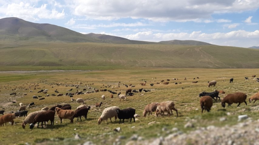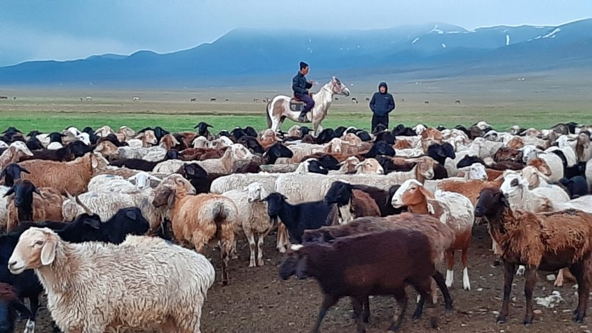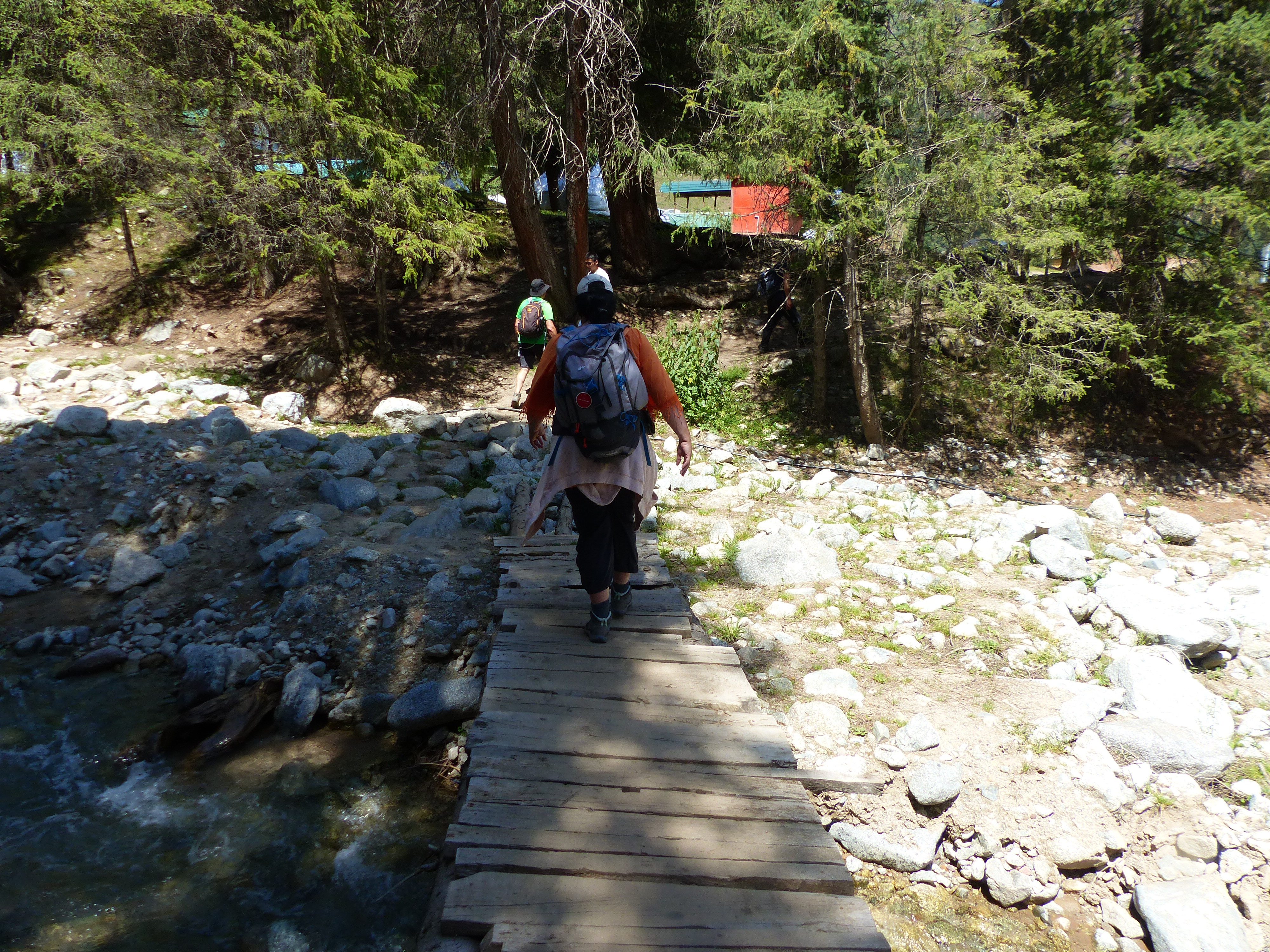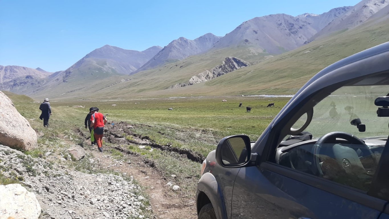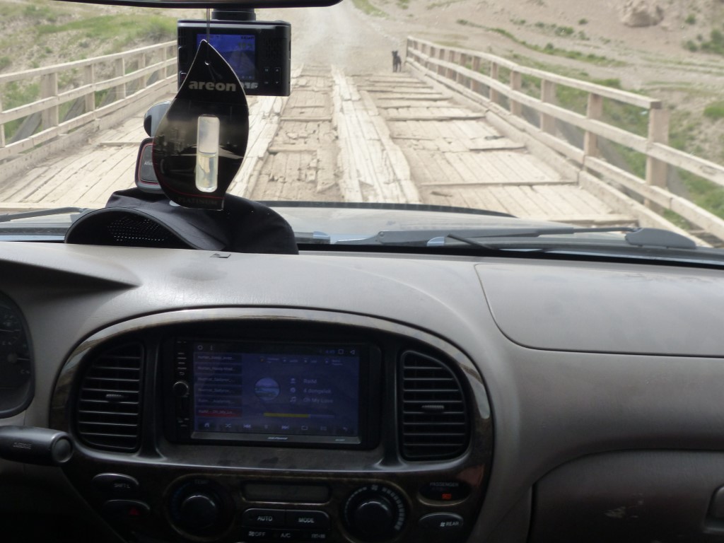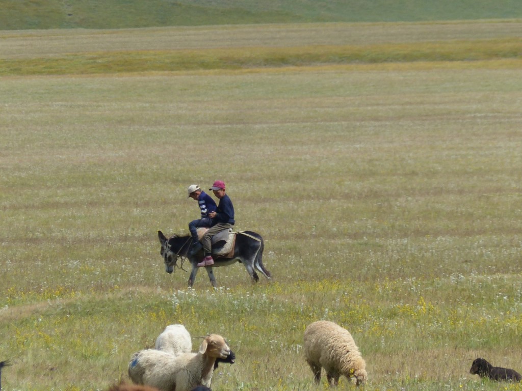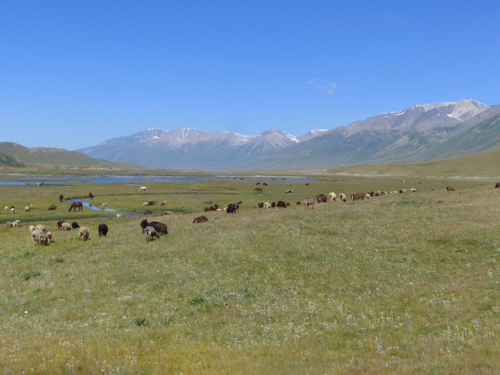 Mais revenons à notre road trip du jour … à la fin de cette vallée civilisée, on rejoint une piste (la piste N°13 du bouquin Kirghistan off road, pour ceux qui auraient envie de la refaire une jour), on traverse un « petit pont de bois » (private joke) légèrement branlant – on s’est quand même assurés qu’une famille de 20 personnes dans leur mini bus perso, en route pour un pique nique montagnard – passait sans encombre ; et pour faire bonne mesure on a confirmé l’info avec le passage d’un troupeau de vaches. Ces vérifications faites, on cherche notre chauffeur Altimbeck, qui a pris de la hauteur pour capter le réseau téléphonique. C’est alors qu’on apprend que depuis le milieu de la nuit, il n’a pas dormi, étant en lien permanent avec son village et sa ferme : en effet, son fils de 15 ans, certainement occupé à gagner des vies sur un jeu vidéo, n’a rien trouvé de mieux que de laisser d’échapper le troupeau de 50 moutons dont il avait la garde. Et d’après Oulan, c’était des moutons très beaux et très chers (au total pour le troupeau 1000000 soms soit environ 10000 euros, une fortune quand on sait que le salaire mensuel moyen est de 250 euros). Bref, c’était la panique chez Altimbeck (je n’imagine pas ce que le gamin a du entendre ….), il a mobilisé tout le village une partie de la nuit et de la matinée, les uns et les autres communiquant par whatsapp pour s’informer de l’avancée des recherches, et enfin vers 10H du matin, Hourrah Halleluya (ou plutôt Bismillah), les moutons ont été retrouvés à 10 km de là, au complet et certainement très ravis de leur petite escapade. Du coup Altimbeck est soulagé mais plutôt dans le coaltar ce matin ( plusieurs fois, au volant de son bolide, je l’avais vu se frotter les yeux et je m’étais dit « tiens, c’est comme moi quand je suis hyper fatiguée », mais ça s’était avant que je ne connaisse l’histoire de moutons vadrouilleurs).