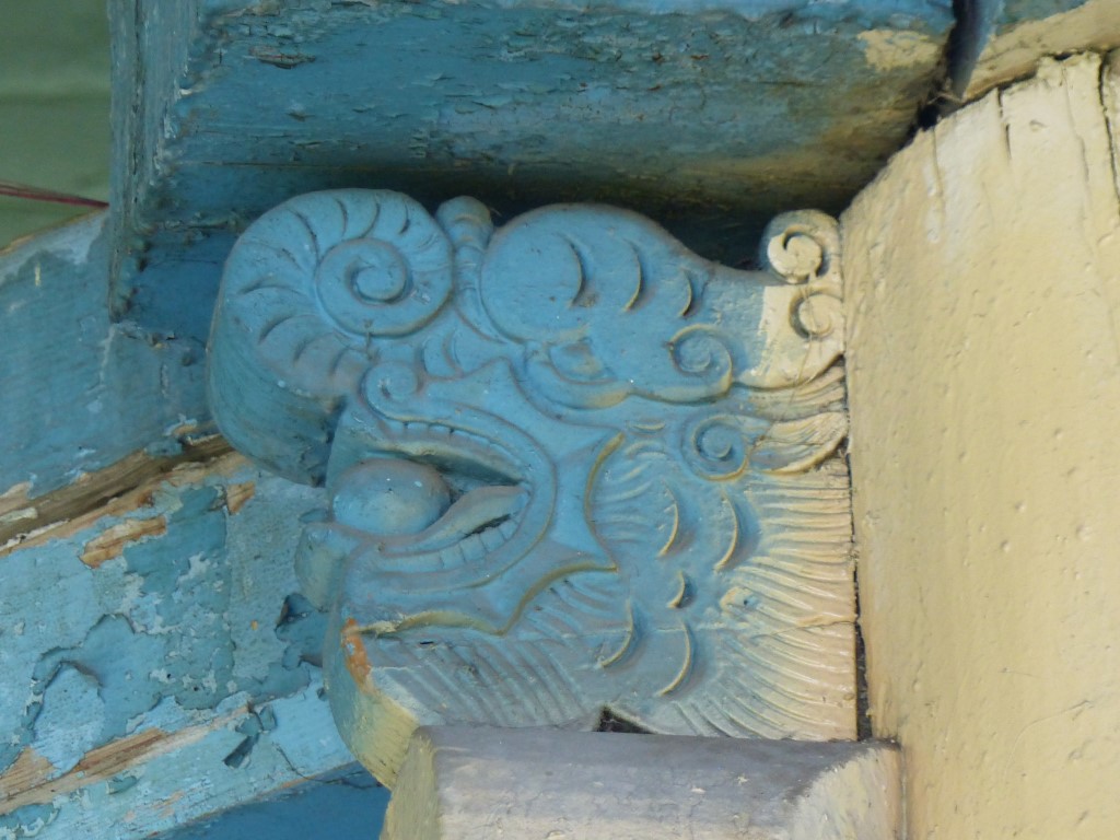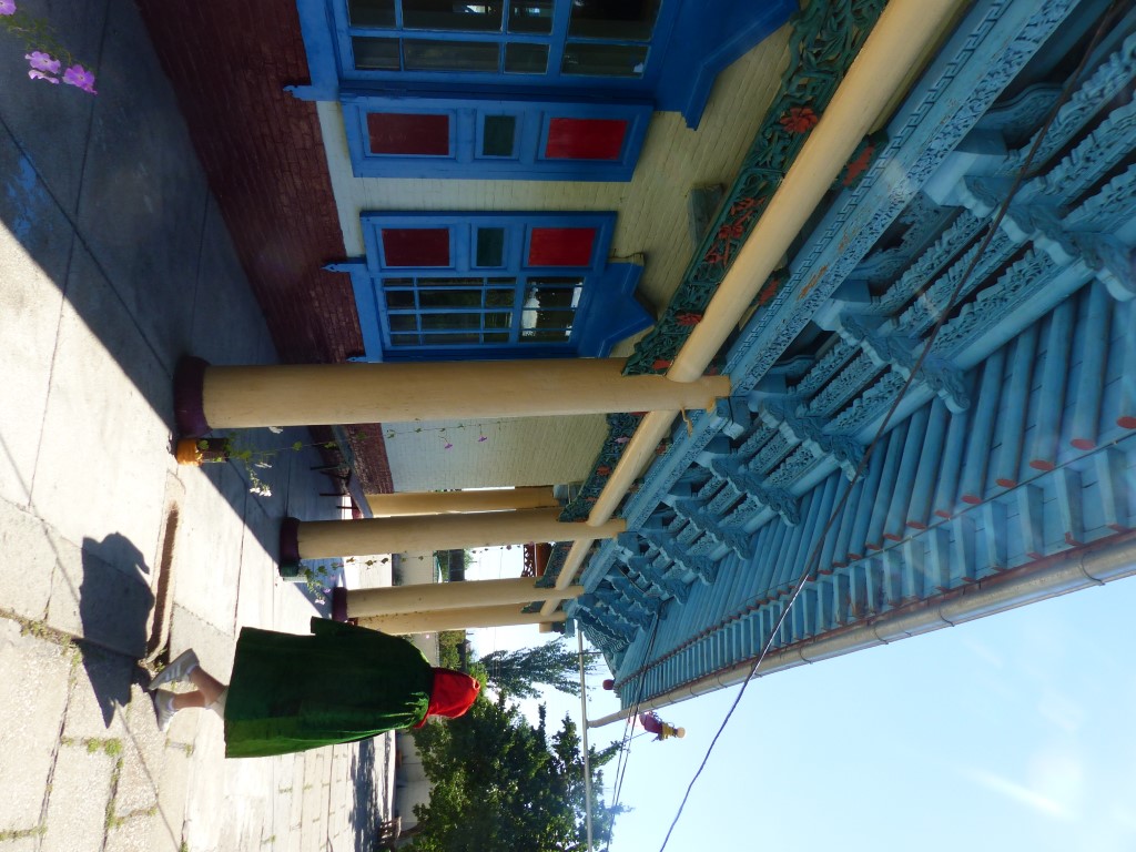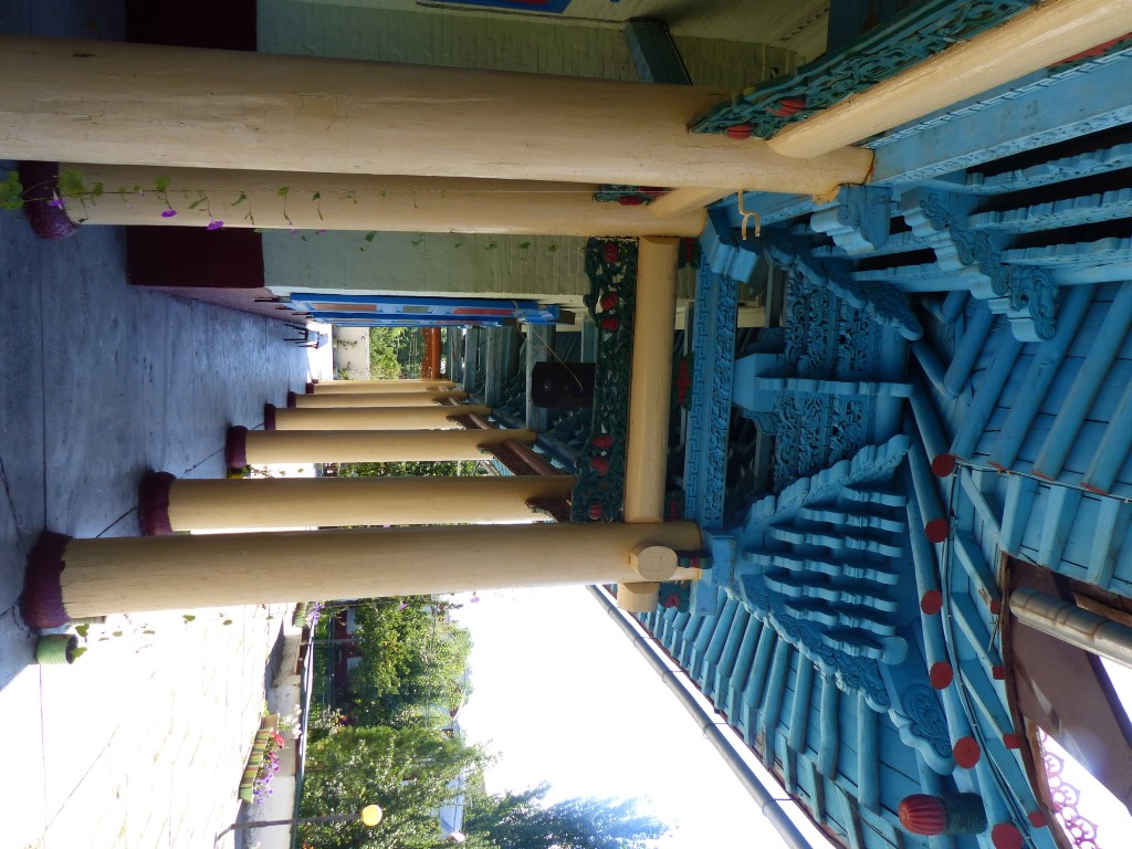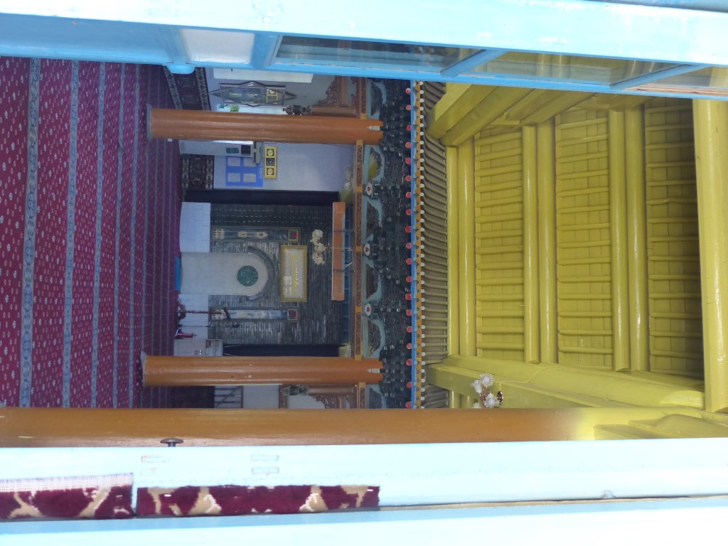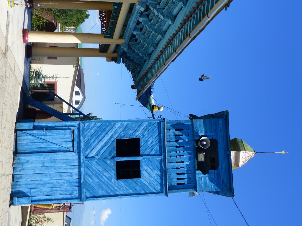 Direction ensuite la mosquée, également tout en bois (apparemment sans clou ni vis), dont l’extérieur est peint dans des couleurs très très vives. A côté, le minaret en bois bleu.