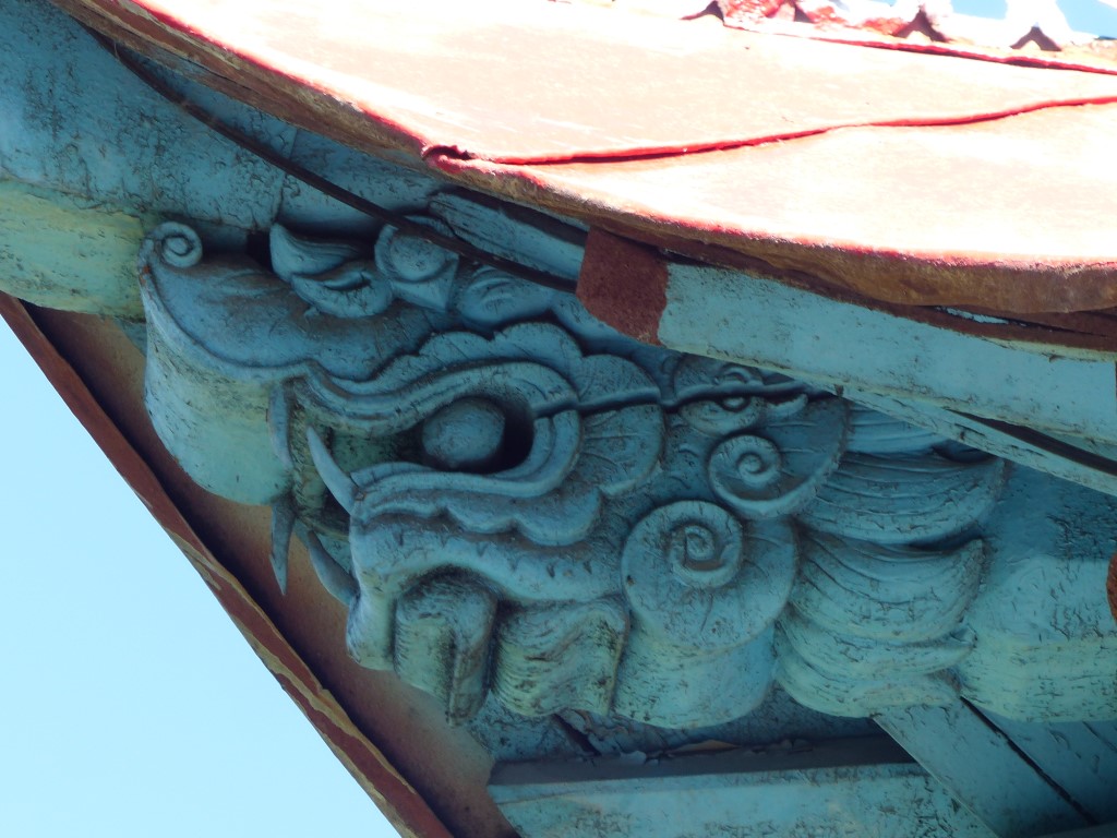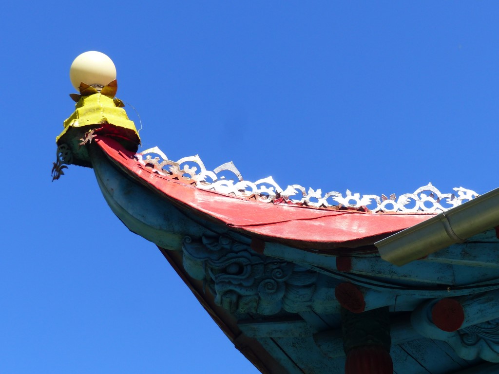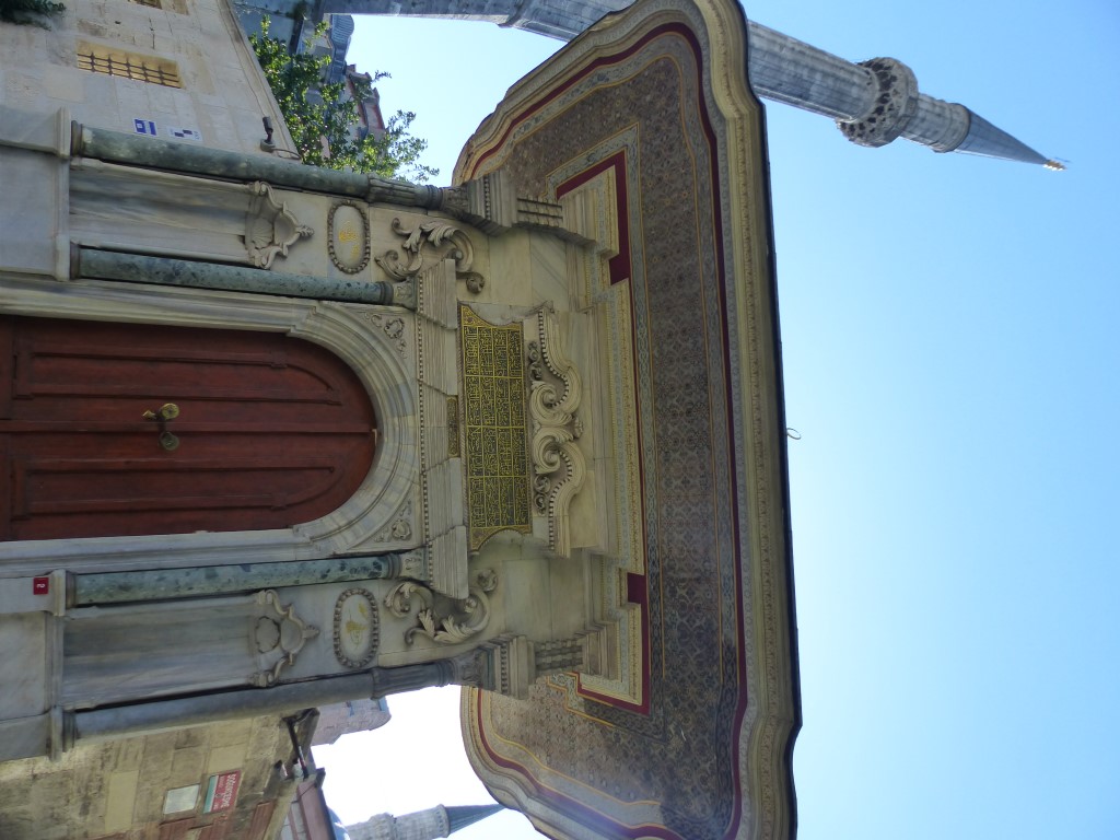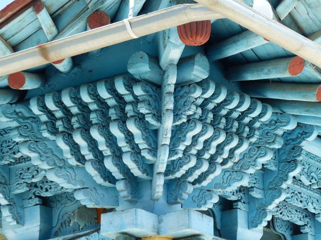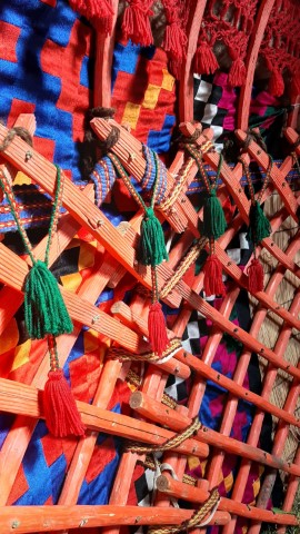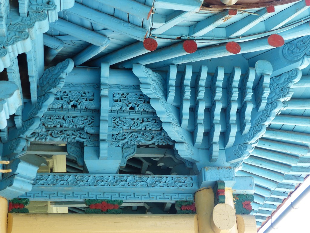 Direction ensuite la mosquée, également tout en bois (apparemment sans clou ni vis), dont l’extérieur est peint dans des couleurs très très vives. A côté, le minaret en bois bleu.