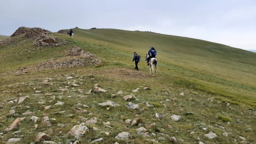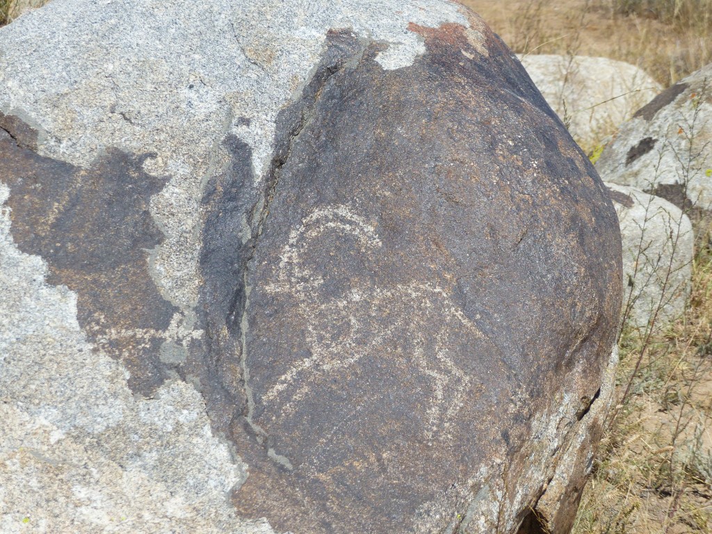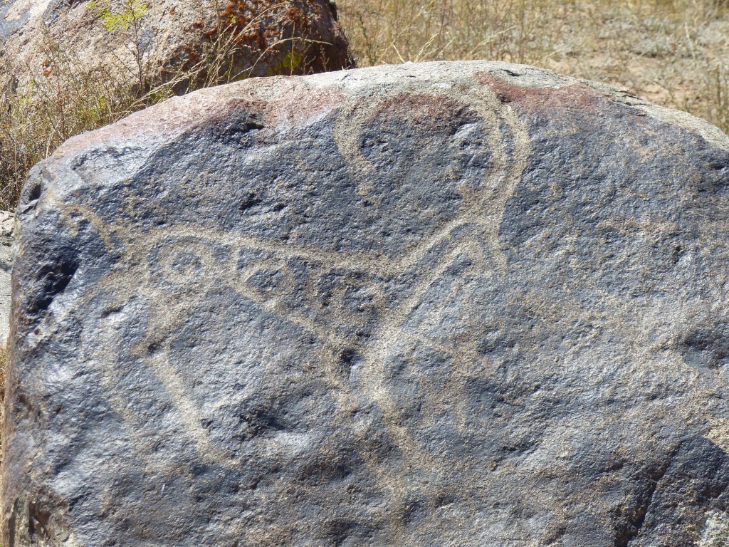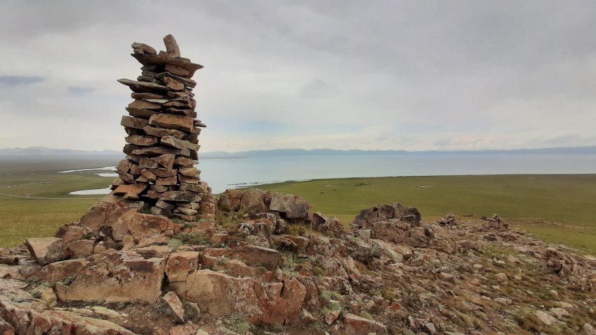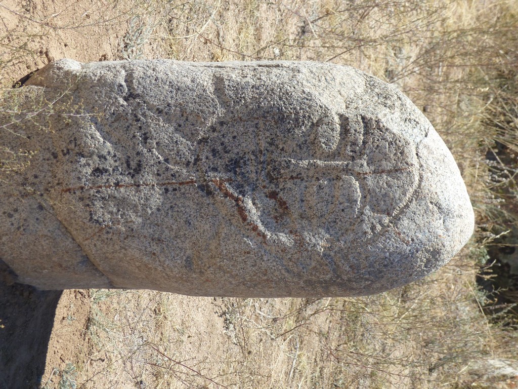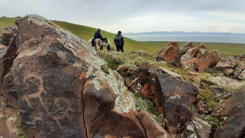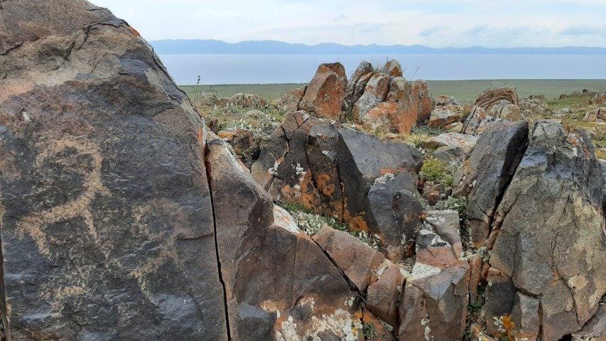La pluie ayant cessée, nous remontons sur nos chevaux, notre tapis de selle a été gentiment retourné par notre hôte. Les 3 pétroglyphes, qui représentent des bouquetins, sont au sommet d'une petite colline où nous avons une vue dégagée sur le lac. Retour sans encombre si ce n'est une petite perte de contrôle de mon cheval au passage d'un troupeaux de moutons. J'ai voulu attendre nos marcheurs, mais le cheval n'était pas du même avis. Il avançait bien plus droit à l'approche de la yourte...