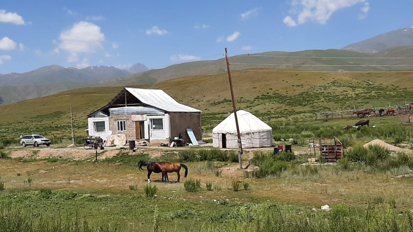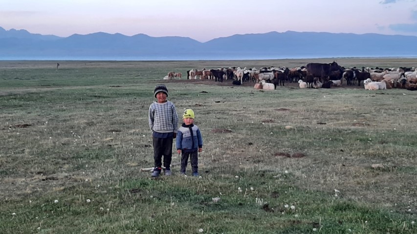 Les enfants, dont Karamet, agée de 11 ans et sont petit frère Ali, 7 ans) jouent dehors dans une aire qui intègre les yourtes. Elle est matérialisée par des pierres peintes en blanc et posées en cercle au sol. Cet espace est interdit aux animaux (vaches, moutons et chevaux). Ainsi elle reste propre de toutes déjections. Le soir venu, les vaches sont rassemblées dans un enclos fermé en béton. Les moutons sont rassemblés à proximité ainsi que les chevaux. Les chiens montent alors la garde.