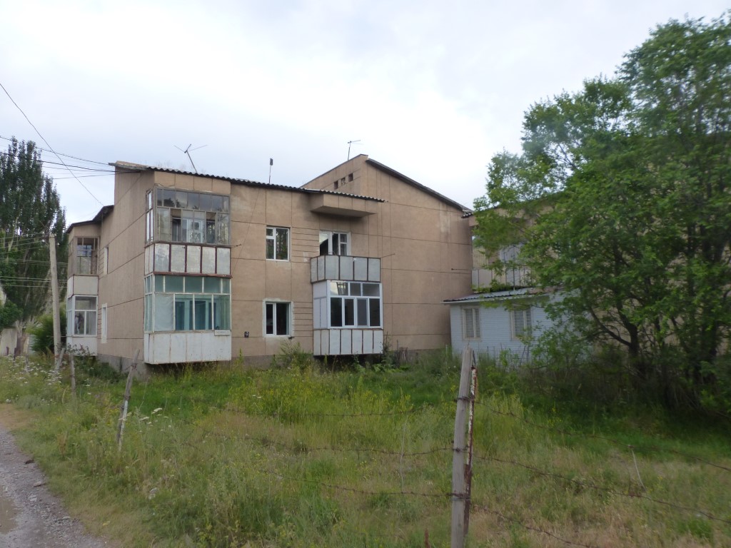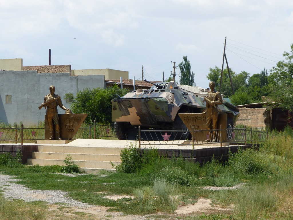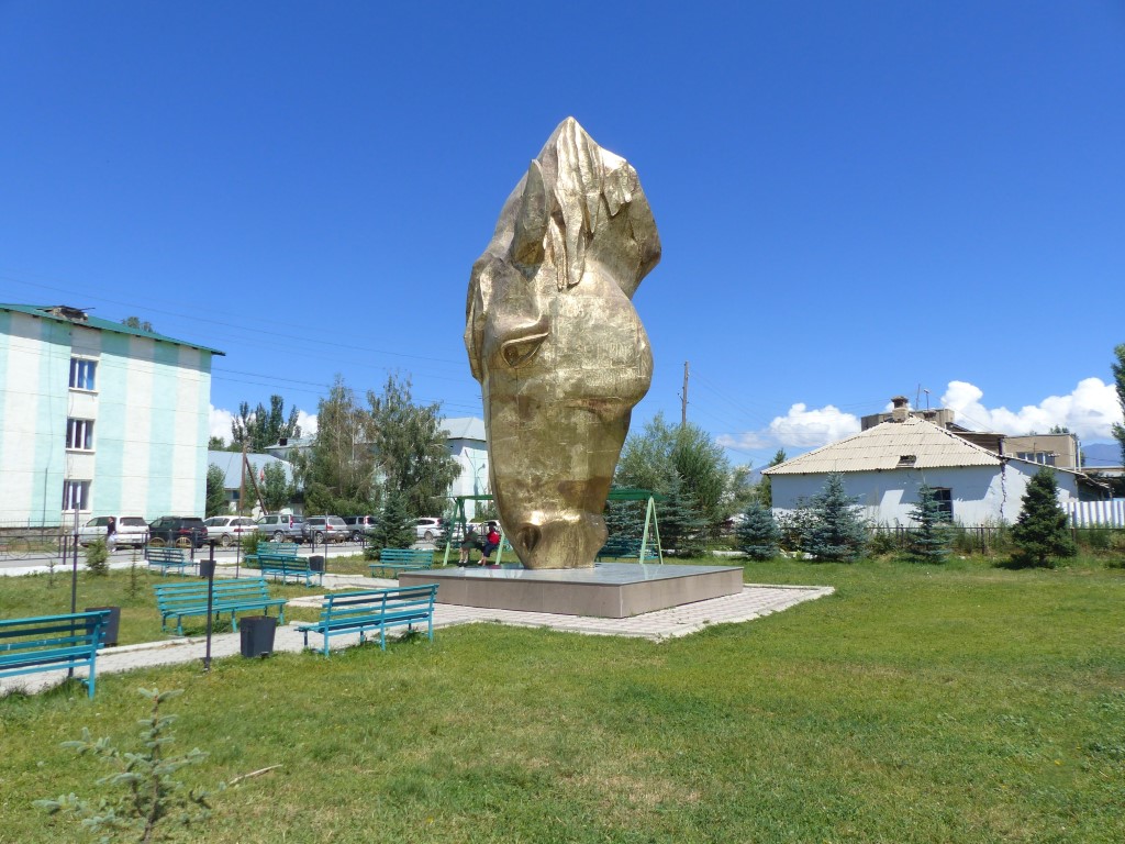 Visite (cette fois ci accompagnée d’Oulan) de la ville de Naryn, visite qui consiste à déambuler le long de l’avenue Lénine, à admirer la « maison des mariages », la statue du secrétaire local (ça doit être une sorte de député), à acheter des cartes postales à l’office du tourisme, à passer à La Poste pour acheter des timbres (mais ce n’est pas possible, ici il faut d’abord écrire ses cartes puis les donner à la guichetière qui y mettra les timbres avant de les envoyer … bon on écrit 2 cartes en vitesse, les autres ce sera pour la prochaine visite à La Poste, certainement à Karakol), et enfin à faire les courses quotidiennes (au supermarché : eau, coca – très important, saucisson – encore plus important ; et au marché : pastèques et bananes).