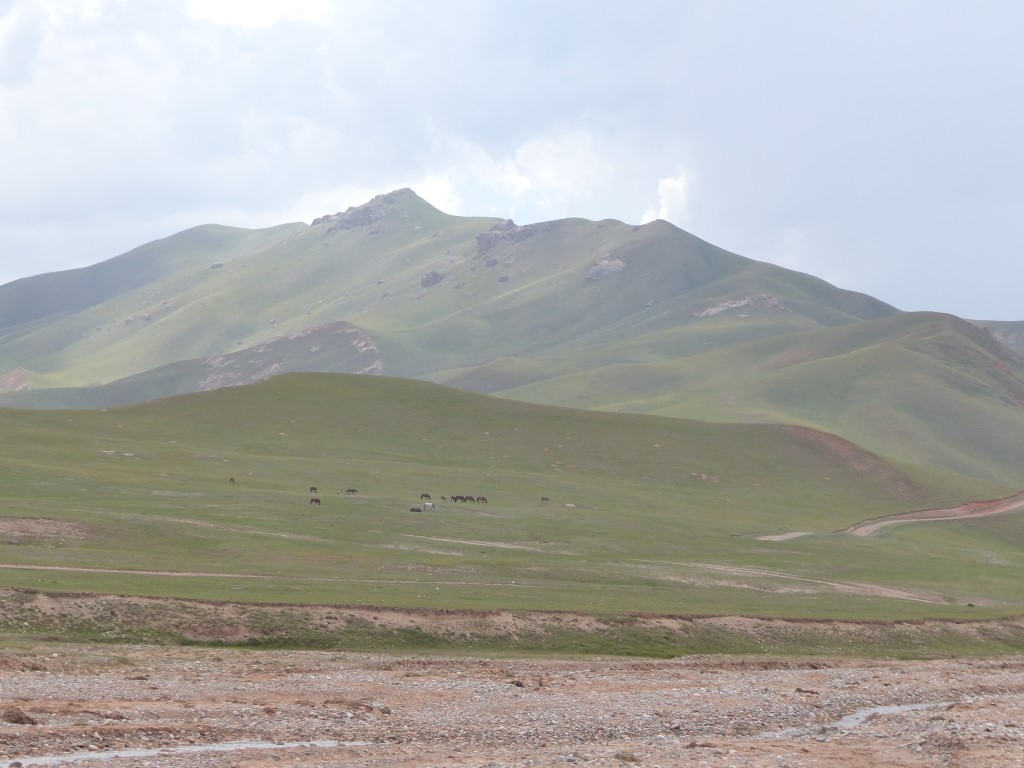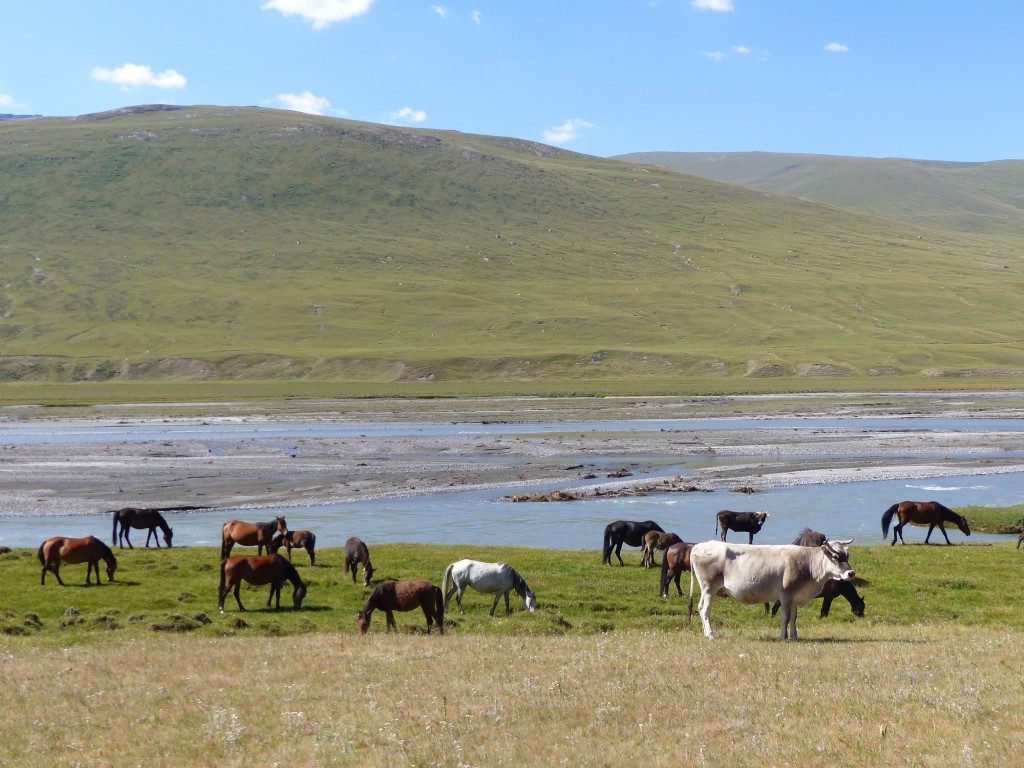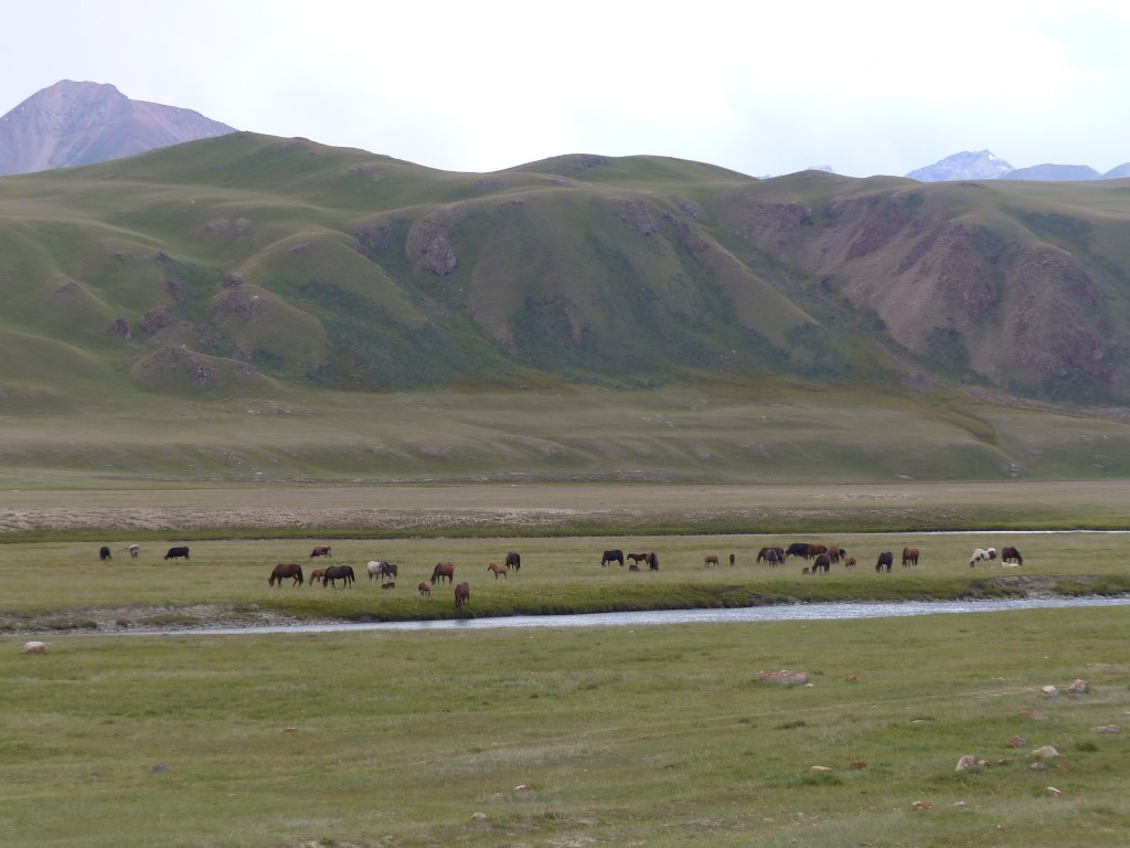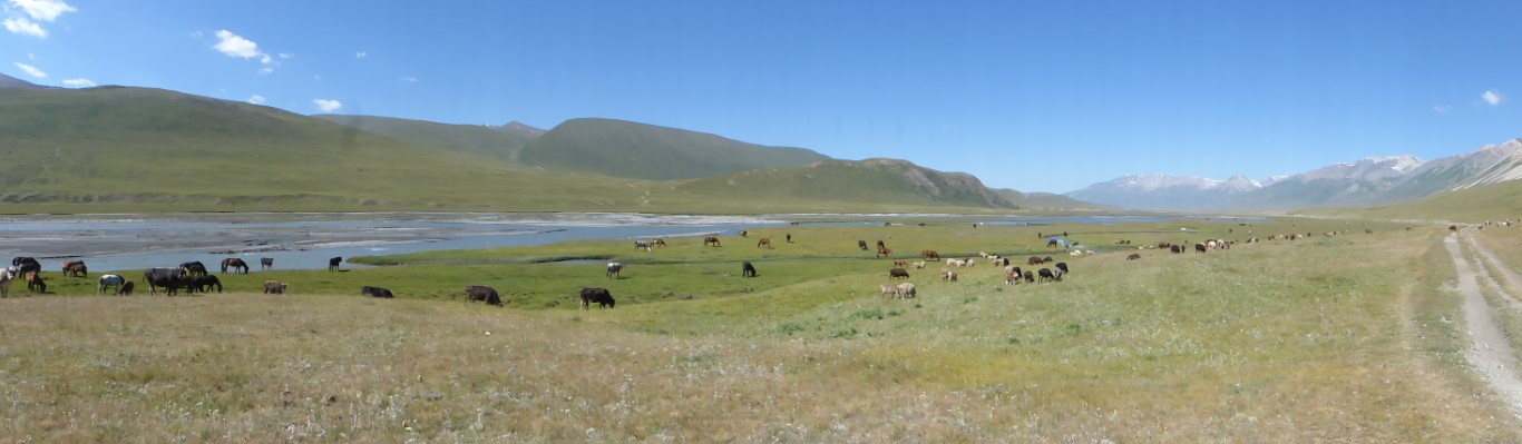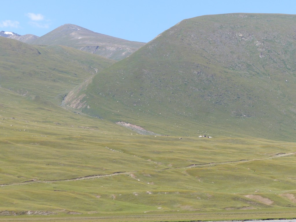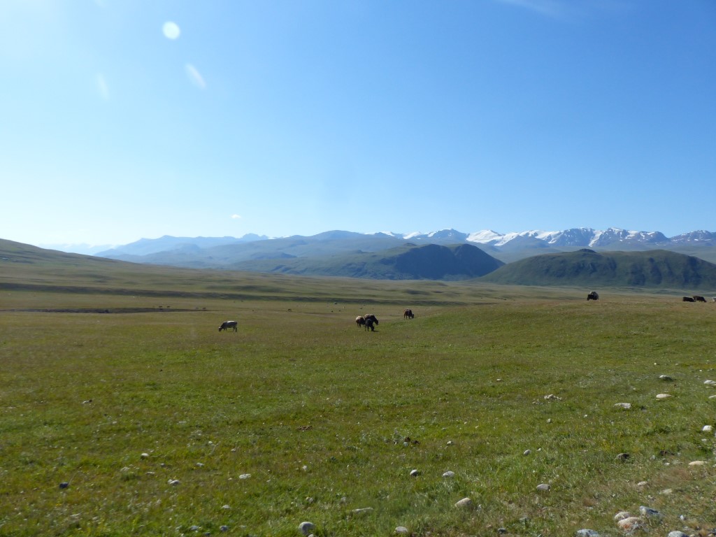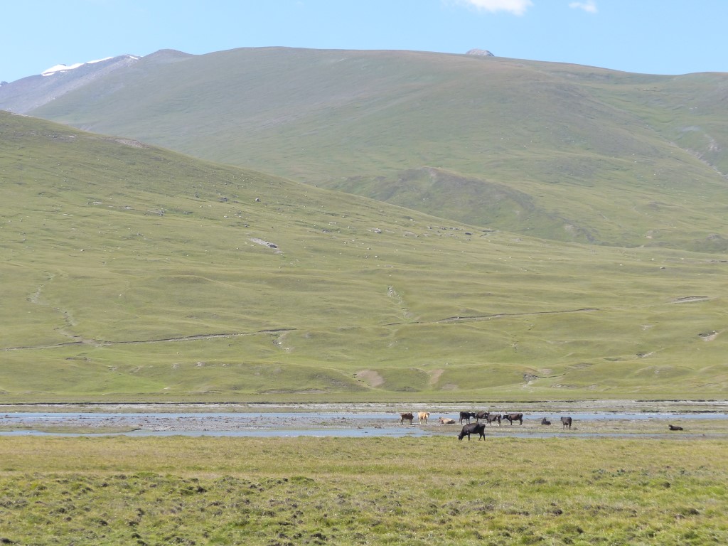 Après le col, le plateau nous offre un espace de verdure où les troupes de vaches et de chevaux déambulent à la bonne volonté ; pas de clôture ici. Parfois, ils sont sur la route et ils ne s'effraient pas plus que de cela des véhicules. Les propriétaires sont installés sur le bord de la route, souvent dans une yourte et une remorque de tôle. Ils sont installés là à l'année, même si l'hiver ils regroupent le bétail un peu plus bas pour passer la période des -15°C (il ya quelques années, c'était plutôt -30°C, mais ce n' est plus le cas à présent).