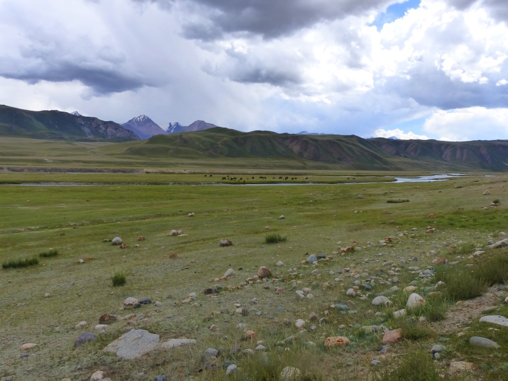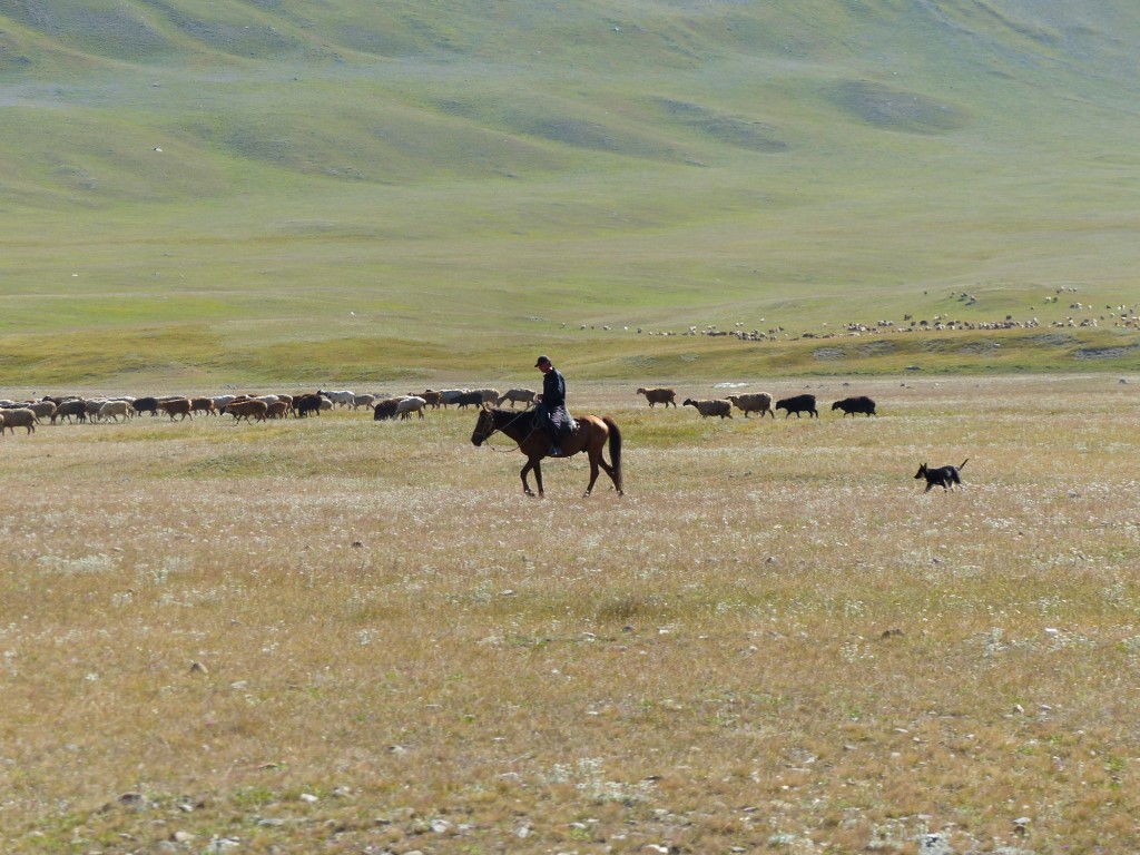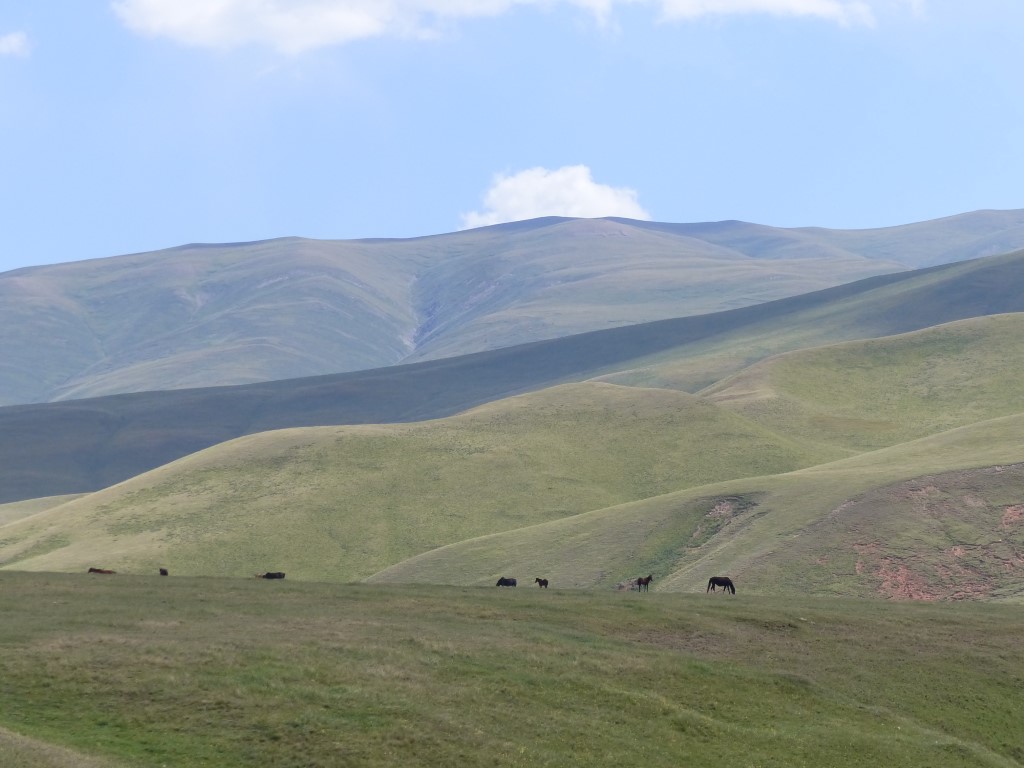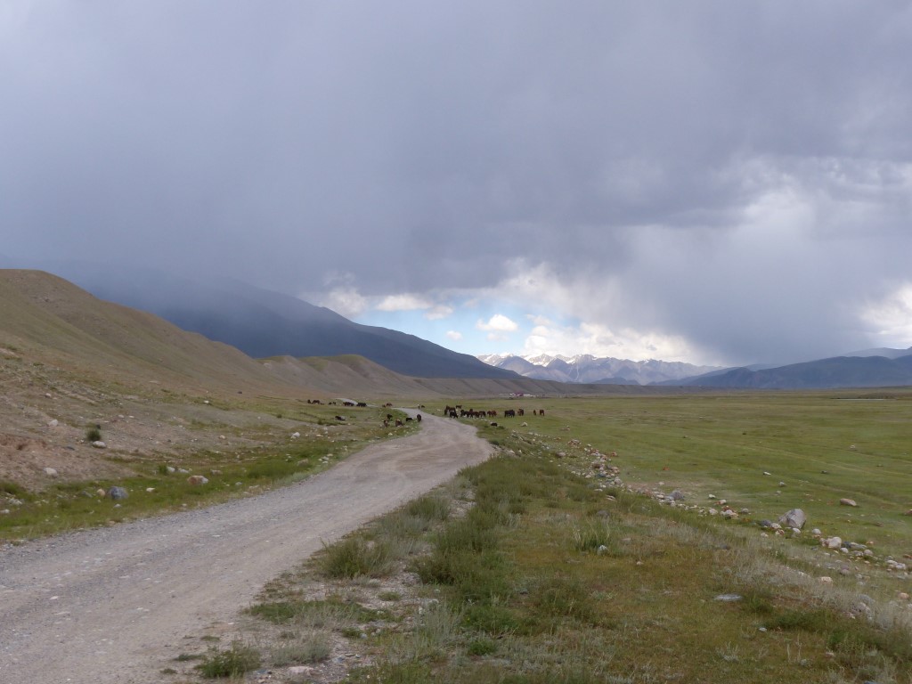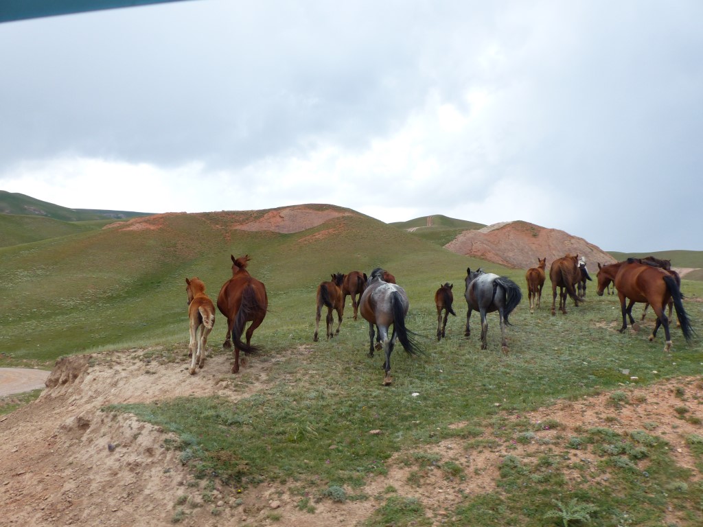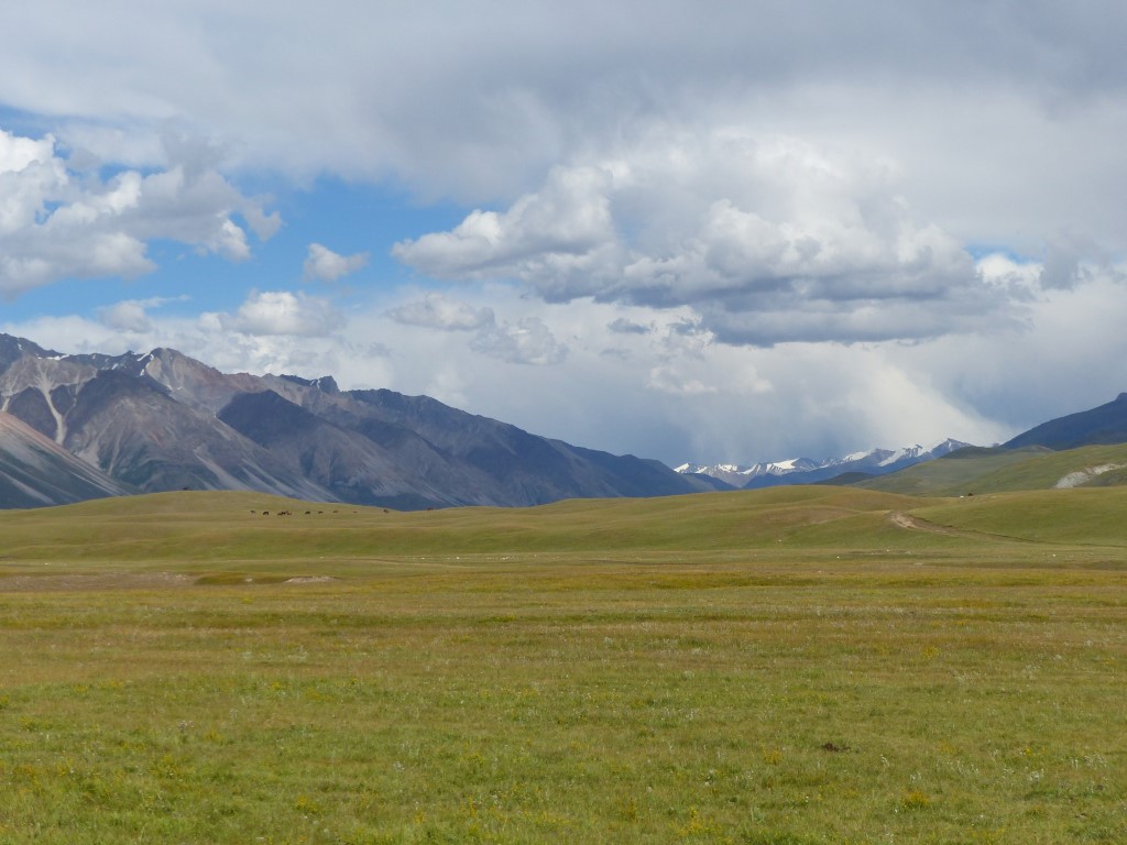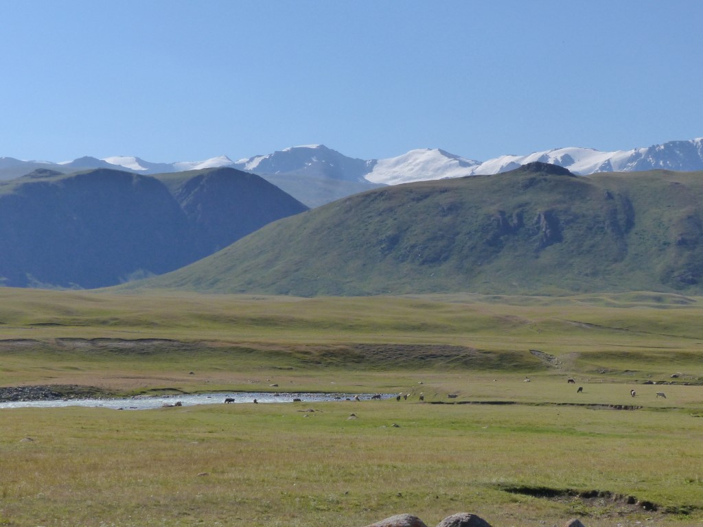 Après le col, le plateau nous offre un espace de verdure où les troupes de vaches et de chevaux déambulent à la bonne volonté ; pas de clôture ici. Parfois, ils sont sur la route et ils ne s'effraient pas plus que de cela des véhicules. Les propriétaires sont installés sur le bord de la route, souvent dans une yourte et une remorque de tôle. Ils sont installés là à l'année, même si l'hiver ils regroupent le bétail un peu plus bas pour passer la période des -15°C (il ya quelques années, c'était plutôt -30°C, mais ce n' est plus le cas à présent).