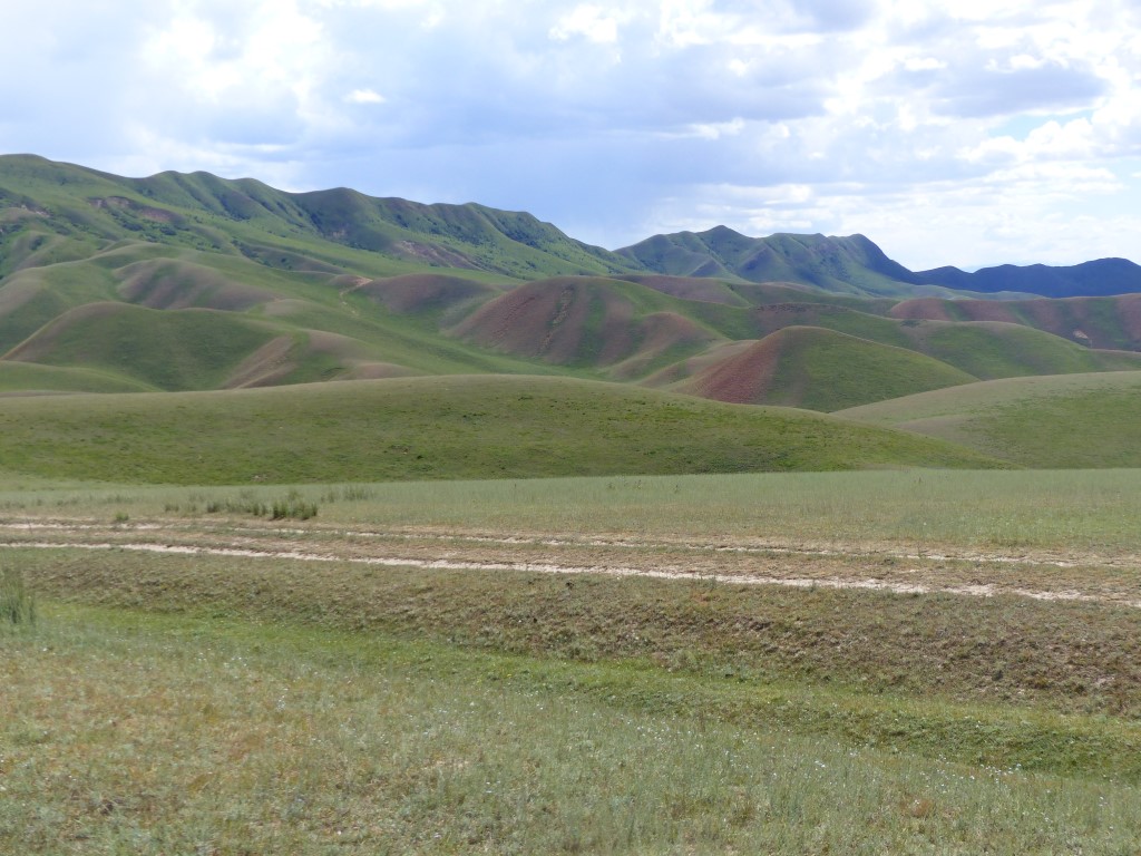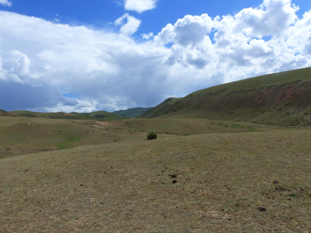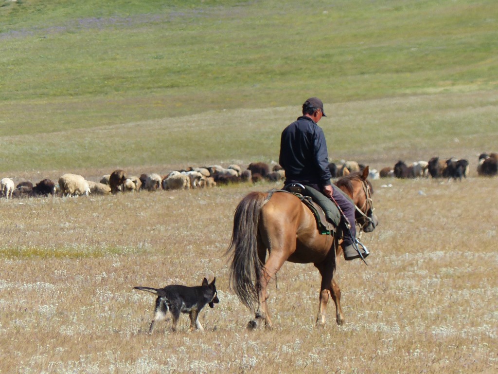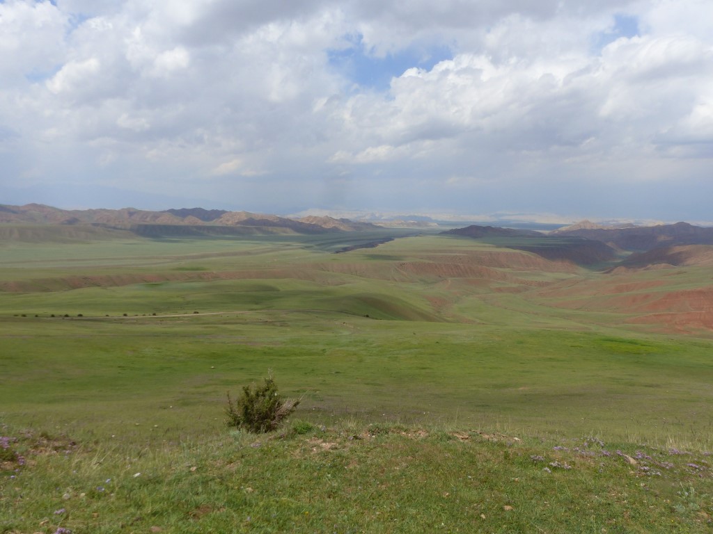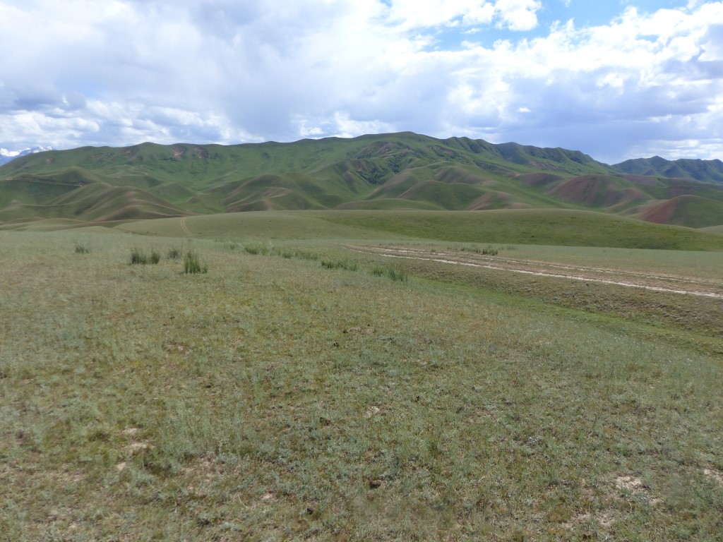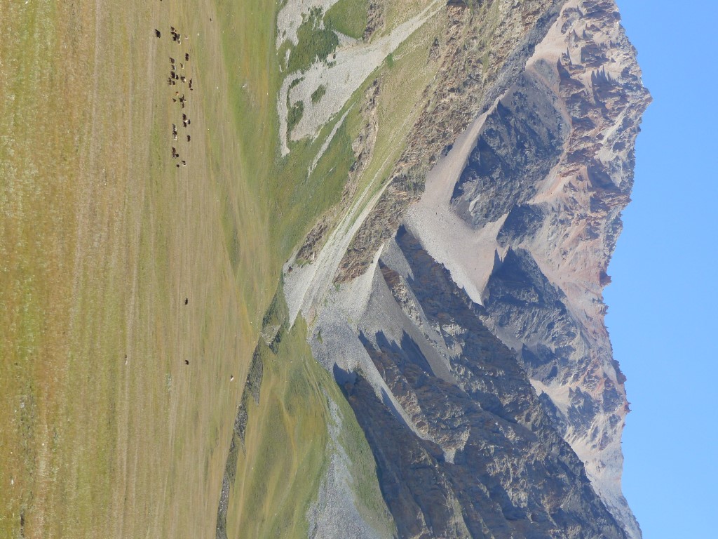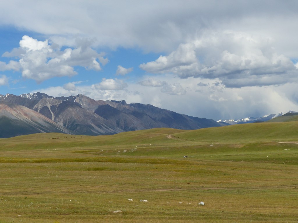 Après le col, le plateau nous offre un espace de verdure où les troupes de vaches et de chevaux déambulent à la bonne volonté ; pas de clôture ici. Parfois, ils sont sur la route et ils ne s'effraient pas plus que de cela des véhicules. Les propriétaires sont installés sur le bord de la route, souvent dans une yourte et une remorque de tôle. Ils sont installés là à l'année, même si l'hiver ils regroupent le bétail un peu plus bas pour passer la période des -15°C (il ya quelques années, c'était plutôt -30°C, mais ce n' est plus le cas à présent).