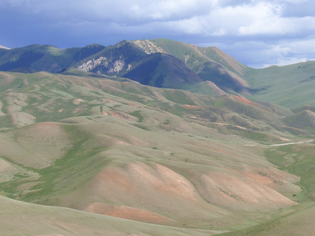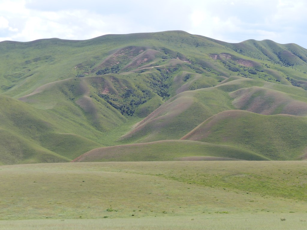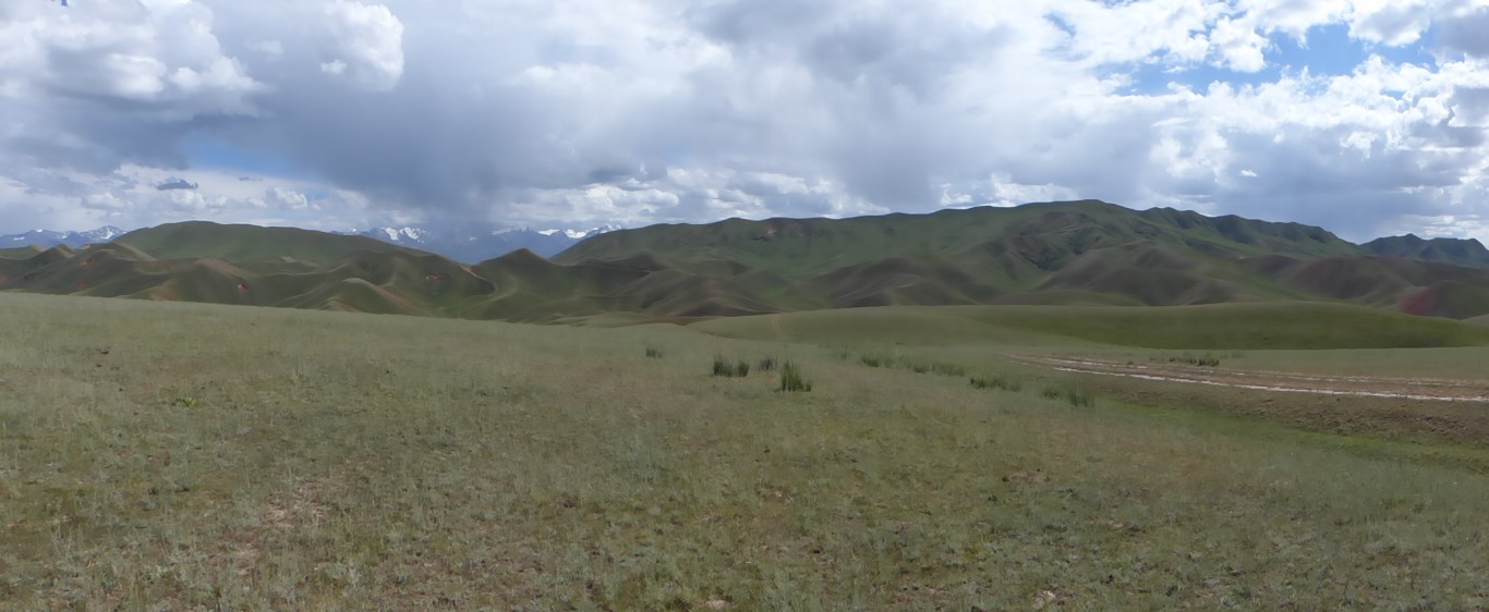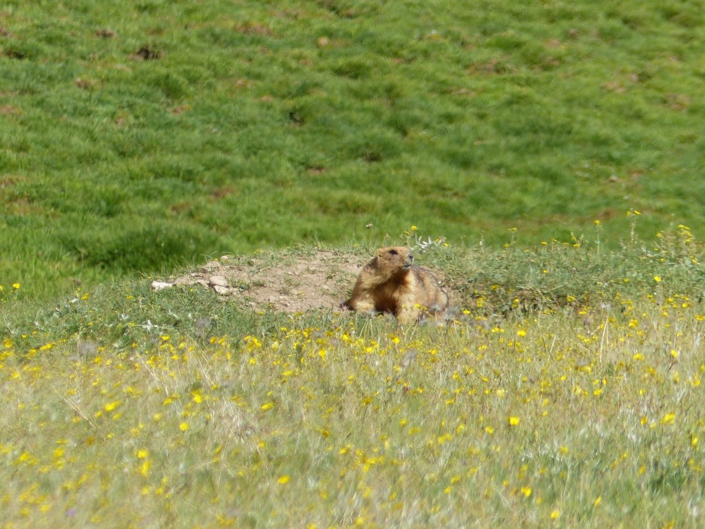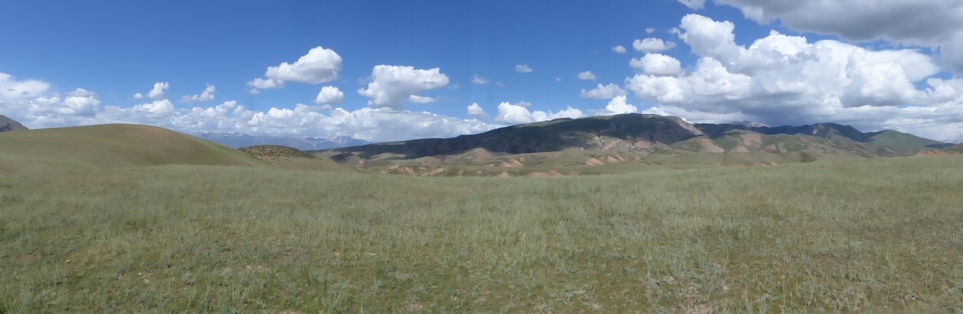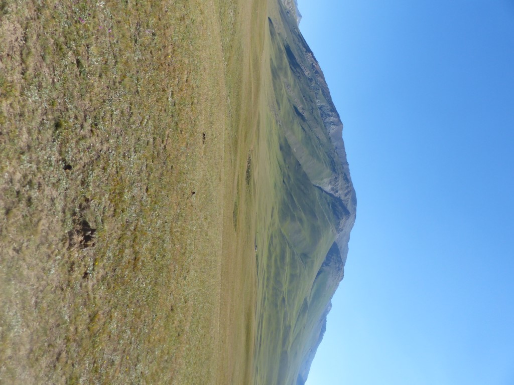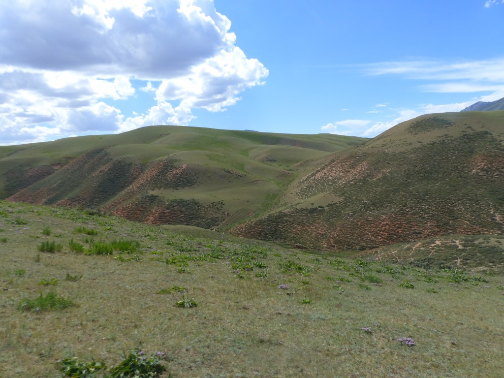 Après le col, le plateau nous offre un espace de verdure où les troupes de vaches et de chevaux déambulent à la bonne volonté ; pas de clôture ici. Parfois, ils sont sur la route et ils ne s'effraient pas plus que de cela des véhicules. Les propriétaires sont installés sur le bord de la route, souvent dans une yourte et une remorque de tôle. Ils sont installés là à l'année, même si l'hiver ils regroupent le bétail un peu plus bas pour passer la période des -15°C (il ya quelques années, c'était plutôt -30°C, mais ce n' est plus le cas à présent).