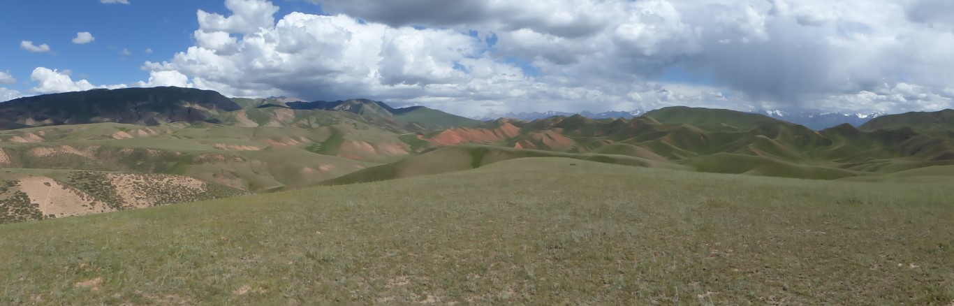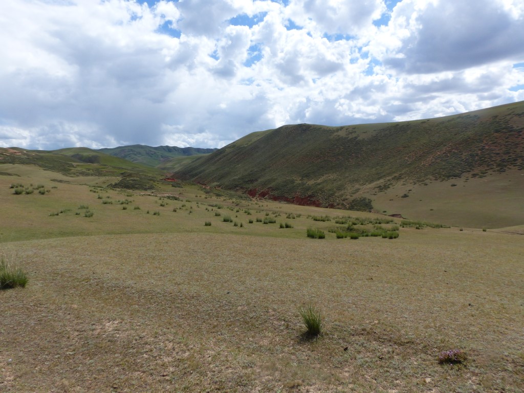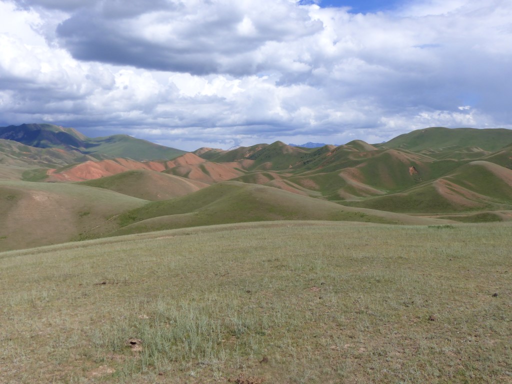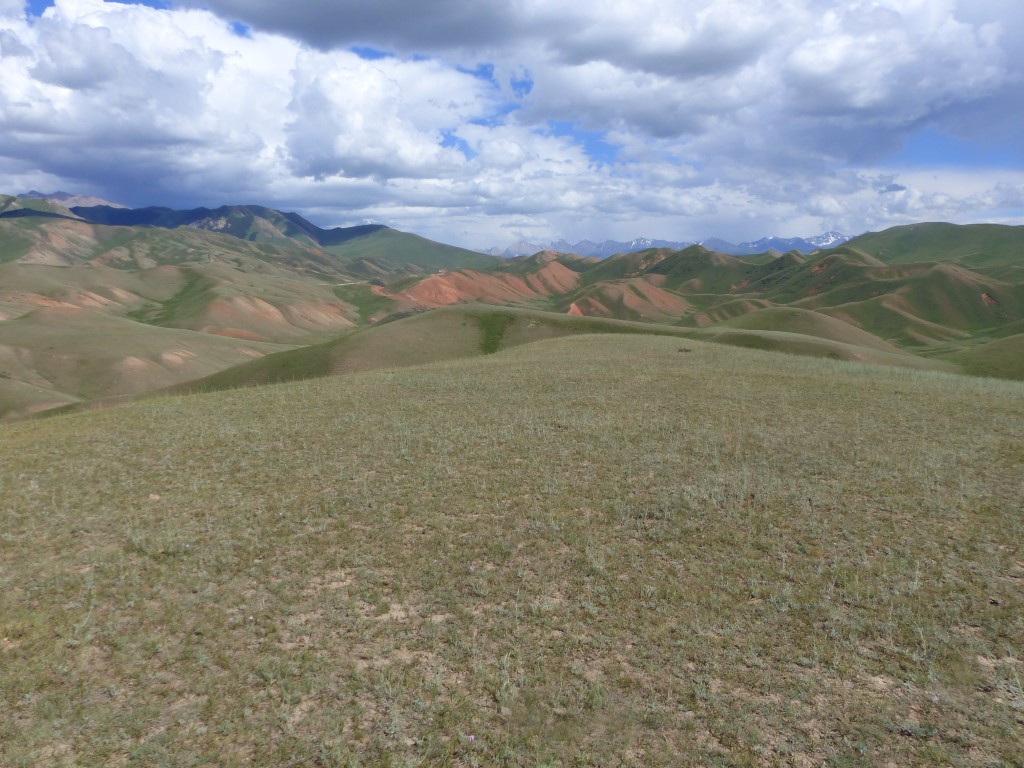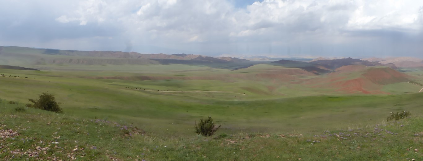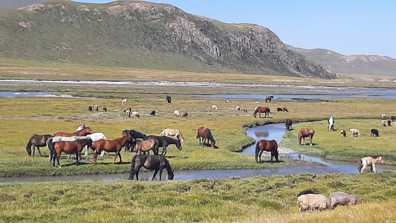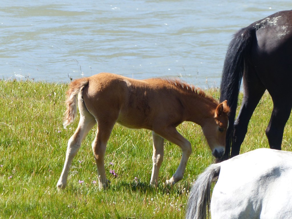 Après le col, le plateau nous offre un espace de verdure où les troupes de vaches et de chevaux déambulent à la bonne volonté ; pas de clôture ici. Parfois, ils sont sur la route et ils ne s'effraient pas plus que de cela des véhicules. Les propriétaires sont installés sur le bord de la route, souvent dans une yourte et une remorque de tôle. Ils sont installés là à l'année, même si l'hiver ils regroupent le bétail un peu plus bas pour passer la période des -15°C (il ya quelques années, c'était plutôt -30°C, mais ce n' est plus le cas à présent).