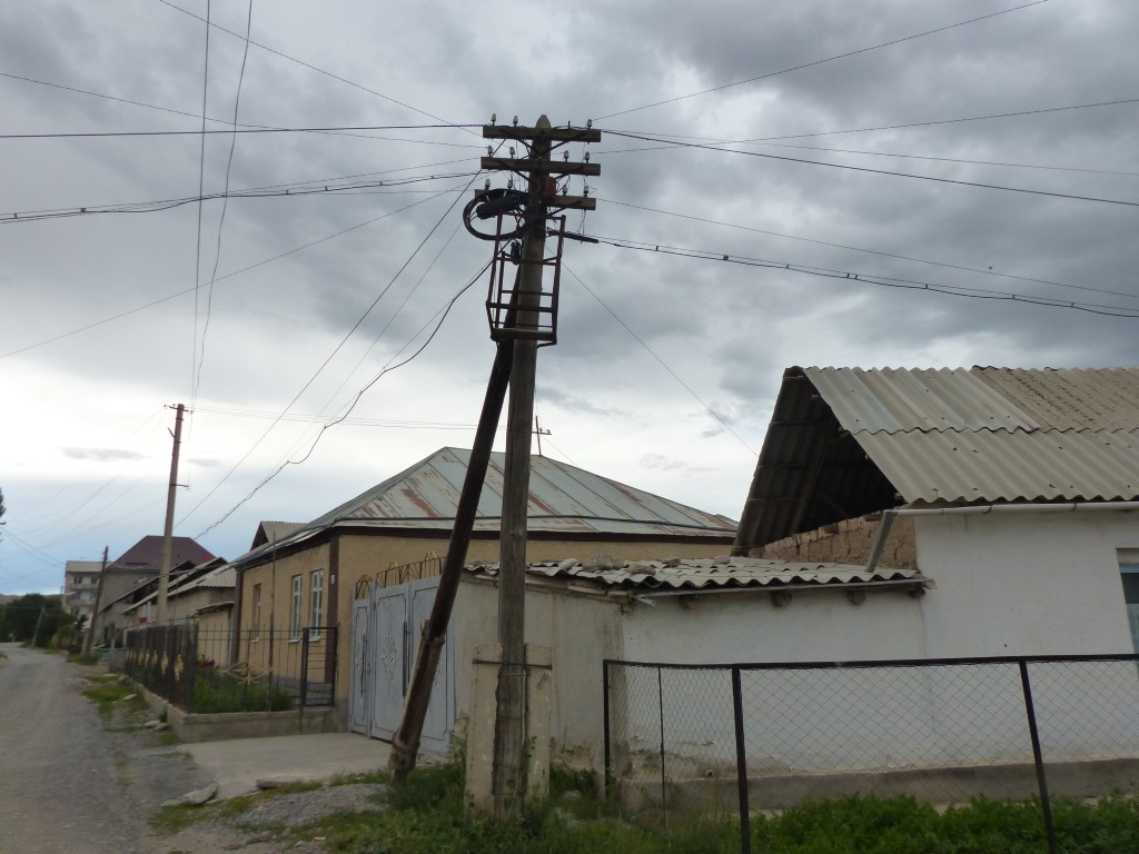 En préparatif de nos deux prochains jours en altitude et loin de tout, nous faisons le plein de gaz pour la voiture. Elle peut fonctionner à l'essence et au gaz. S'en suit une longue ascension. La piste est bordée de deux lignes électriques. L'une bâtie avec des poteaux de bois et de ciment date de l'ère soviétique. L'autre, bâtie comme une ligne à haute tension est l'oeuvre des chinois. Avec 6 millions d'habitants, les kirghizes ne sont pas assez nombreux pour maîtriser toutes les technologies.