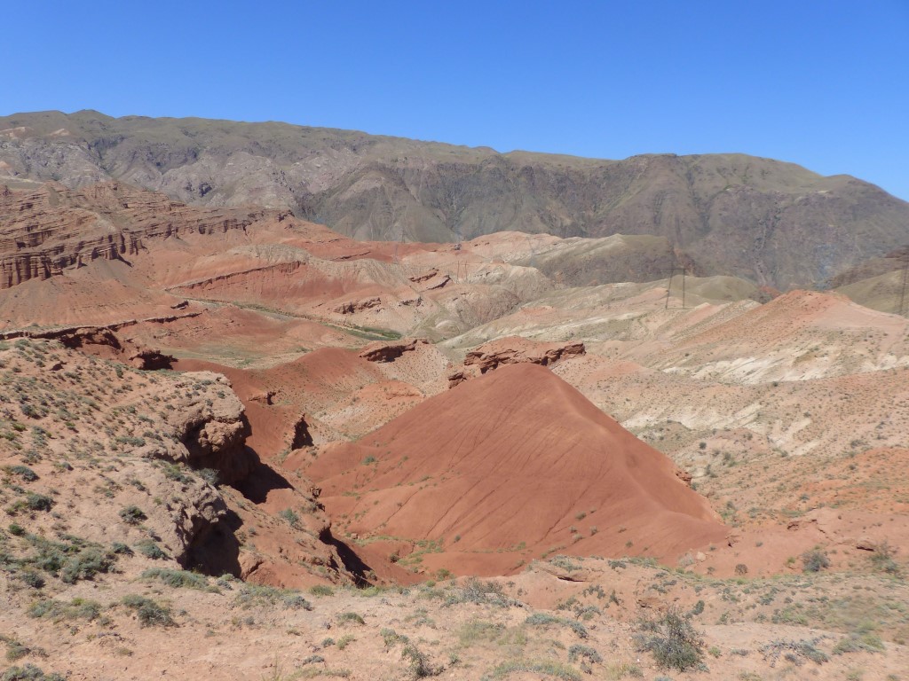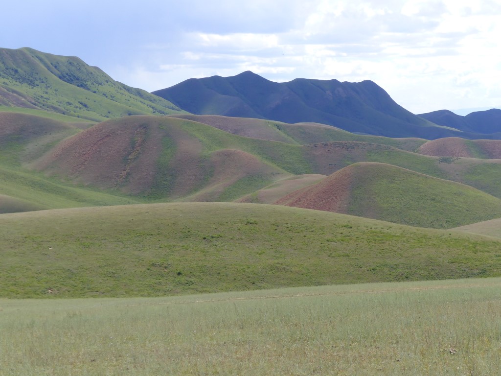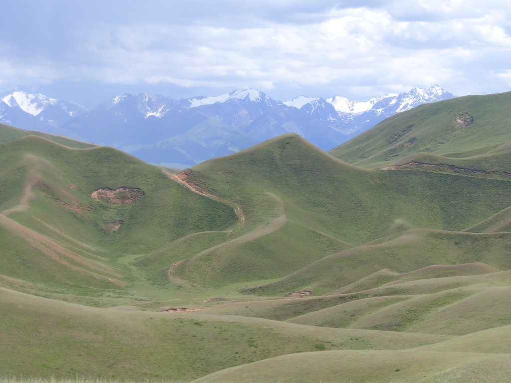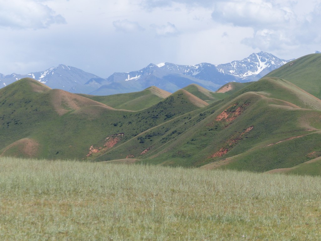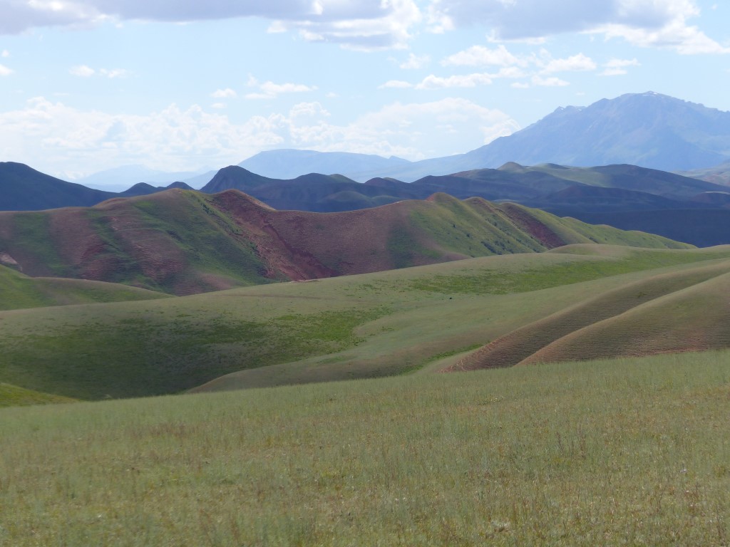 3ème et dernière attraction : mes fameuses collines rouges, que je n’ai de cesse de réclamer à Oulan depuis ce matin. Il ne connaît pas plus que ça la piste que je lui montre sur mon bouquin « Kirghizistan Off Road », mais après s’être enquis de la route auprès d’un nomade yourtier qui passait par là, on y va, et c’est tout de suite magnifique (même si ce n’est pas aussi rouge que ce que je pensais). On s’arrête pour admirer tout ça au calme (pas évident de se pâmer devant un beau paysage alors qu’on est dans un 4X4 qui n’arrête pas de sauter dans tous les sens – et je ne parle pas des dévers qui font monter l’adrénaline – enfin la mienne, les autres rigolent!). C’est confirmé : c’est encore plus beau à l’arrêt qu’en mouvement : douces collines qui ondulent, dans des tons de vert amandes et de briques, le tout sur fond de montagnes enneigées. On fait une partie de la piste à pied, Altimbeck nous rejoignant un peu plus loin avec le 4X4, et on s’émerveille à chaque pas. Je suis contente d’avoir fait découvrir ça à Oulan, j’espère qu’il en fera profiter d’autres touristes … On termine par un passage auprès d’un petit lac recouvert de canards (ou autres volatiles, je n’ai pas été voir de près), puis on rejoint la grande route et de nouveau Naryn, où on va passer notre 2ème nuit, mais cette fois ci dans un hôtel 3 étoiles (on reprend le programme initialement prévu). A noter qu’au Kirghistan, le nombre d’étoiles est proportionnel à la hauteur des lits. Dans celui ci, il faut quasiment une échelle pour aller se coucher.