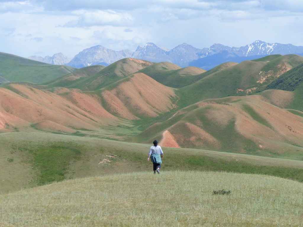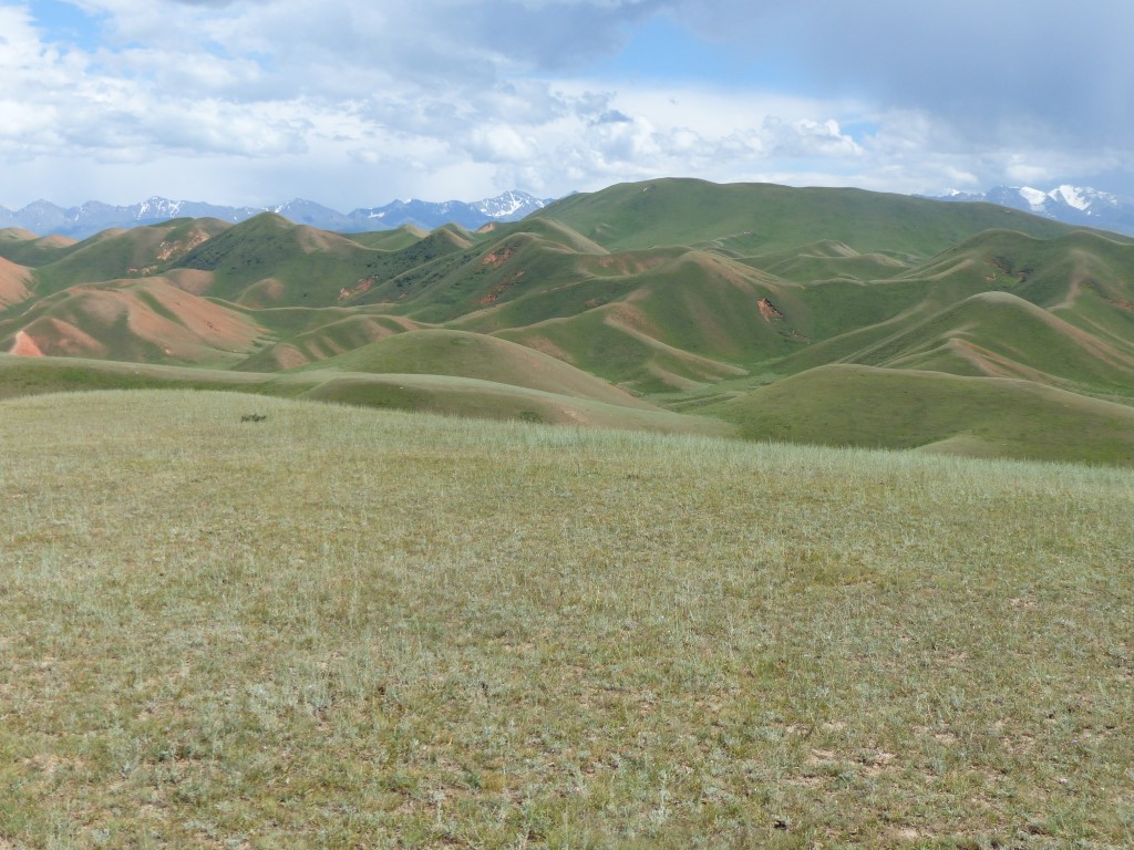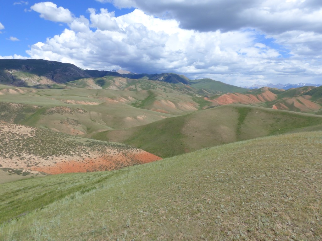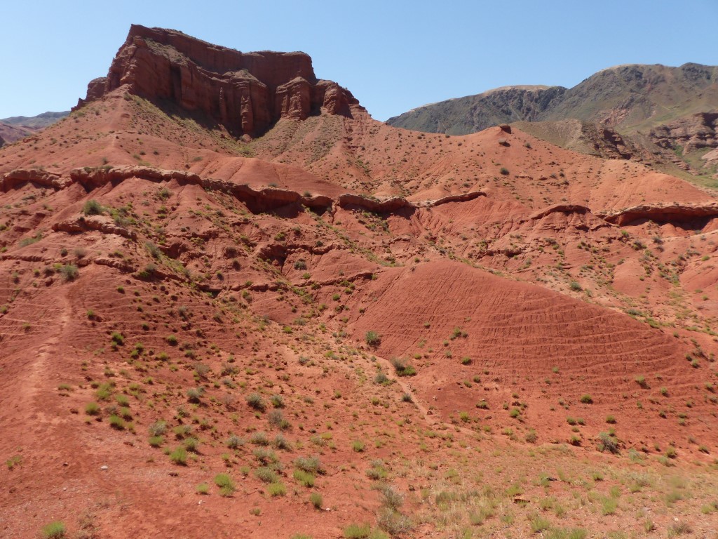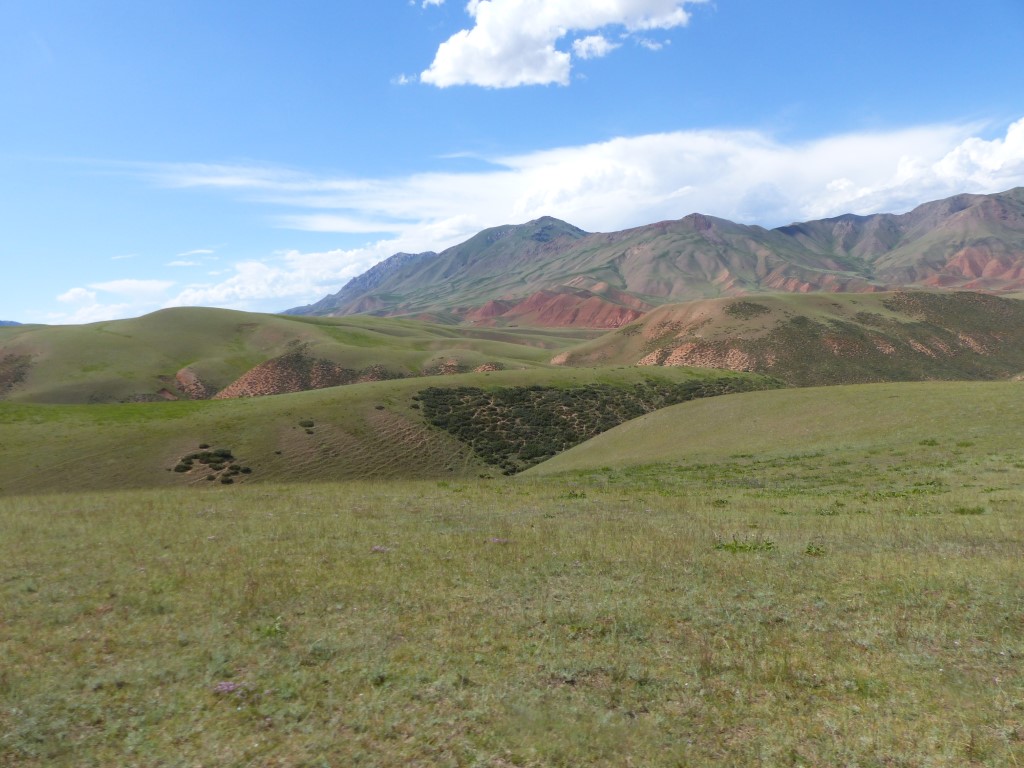 3ème et dernière attraction : mes fameuses collines rouges, que je n’ai de cesse de réclamer à Oulan depuis ce matin. Il ne connaît pas plus que ça la piste que je lui montre sur mon bouquin « Kirghizistan Off Road », mais après s’être enquis de la route auprès d’un nomade yourtier qui passait par là, on y va, et c’est tout de suite magnifique (même si ce n’est pas aussi rouge que ce que je pensais). On s’arrête pour admirer tout ça au calme (pas évident de se pâmer devant un beau paysage alors qu’on est dans un 4X4 qui n’arrête pas de sauter dans tous les sens – et je ne parle pas des dévers qui font monter l’adrénaline – enfin la mienne, les autres rigolent!). C’est confirmé : c’est encore plus beau à l’arrêt qu’en mouvement : douces collines qui ondulent, dans des tons de vert amandes et de briques, le tout sur fond de montagnes enneigées. On fait une partie de la piste à pied, Altimbeck nous rejoignant un peu plus loin avec le 4X4, et on s’émerveille à chaque pas. Je suis contente d’avoir fait découvrir ça à Oulan, j’espère qu’il en fera profiter d’autres touristes … On termine par un passage auprès d’un petit lac recouvert de canards (ou autres volatiles, je n’ai pas été voir de près), puis on rejoint la grande route et de nouveau Naryn, où on va passer notre 2ème nuit, mais cette fois ci dans un hôtel 3 étoiles (on reprend le programme initialement prévu). A noter qu’au Kirghistan, le nombre d’étoiles est proportionnel à la hauteur des lits. Dans celui ci, il faut quasiment une échelle pour aller se coucher.
