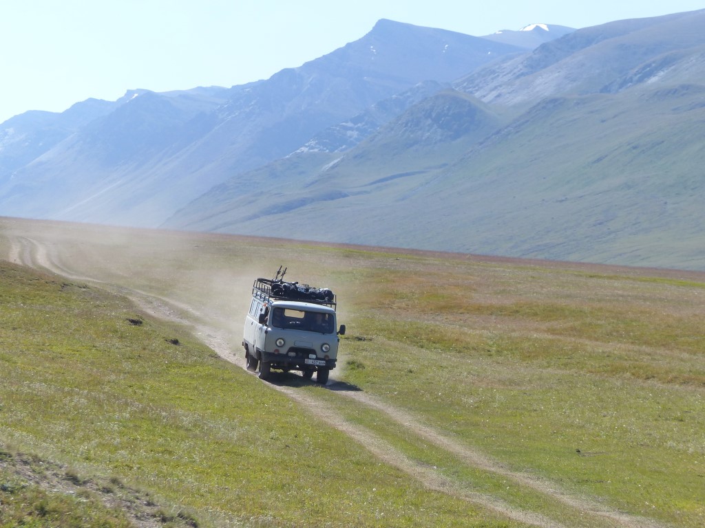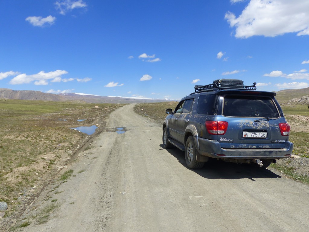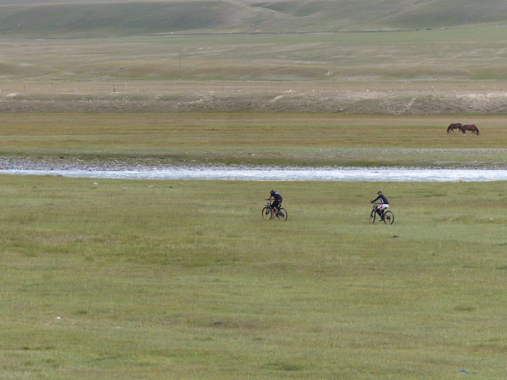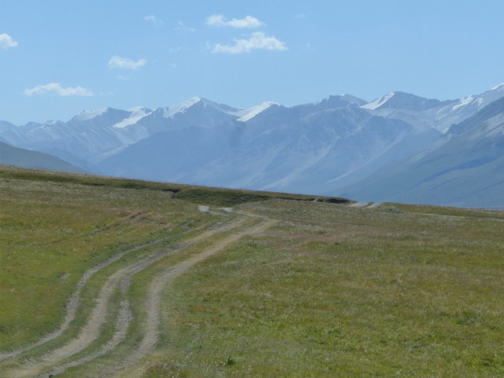 Toujours de grands paysages de plaines encadrées par de grandes montagnes abruptes. La piste d'abord normale, devient petit à petit plus sélective et Altimbeck en vient à se battre avec les éléments. Malgré qu'il prenne tout particulièrement soin du 4x4 qui lui appartient, plus d'une fois le chassis tape le sol. La voiture se met à chauffer lors des nombreuses épreuves de franchissement. Il faut asperger le radiateur d'eau pour faire baisser le thermomètre. Les campements nomades deviennent plus rares et nous nous sentons un peu loin de la civilisation. Pas tant que cela en fait; nous croisons un groupe de 4 touristes, deux ouvrent la voie en VTT à une camionnette "WAZ" russe. Il n'y aura pas d'autre rencontre je crois!