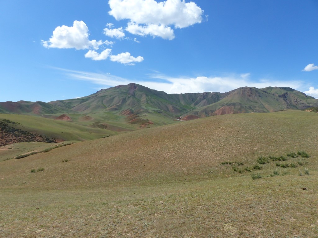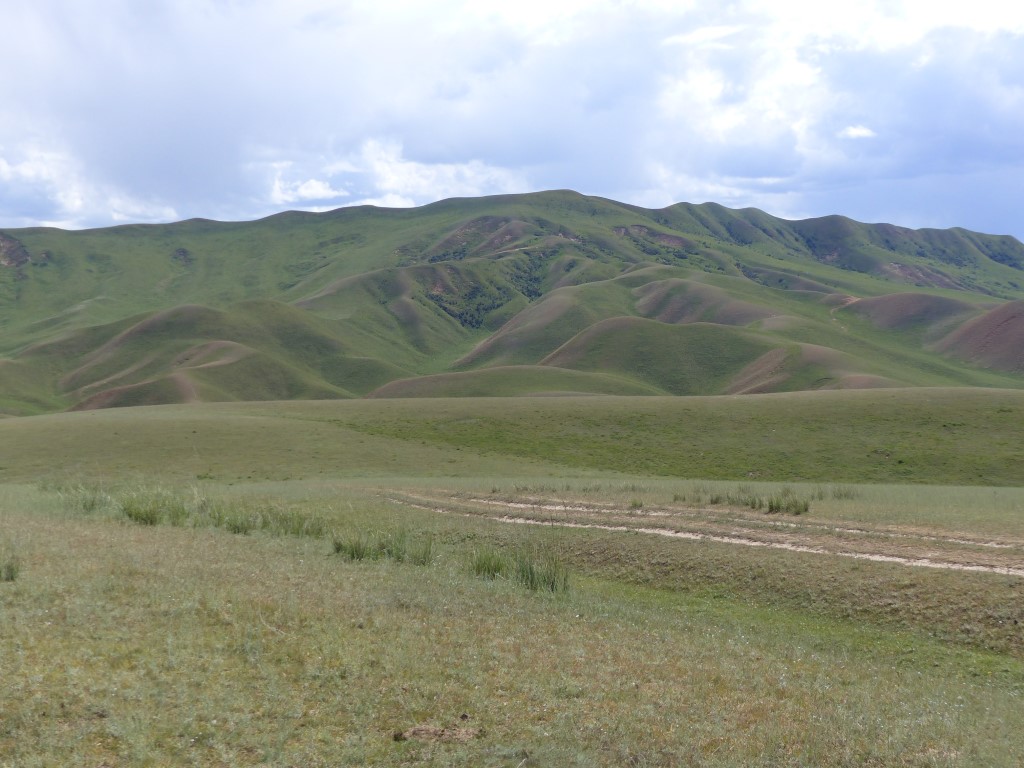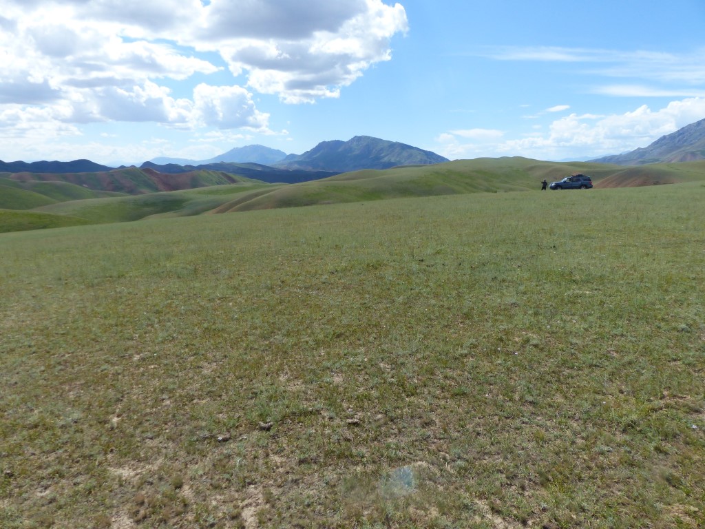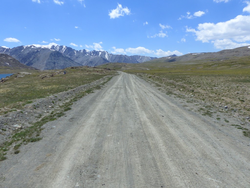 Toujours de grands paysages de plaines encadrées par de grandes montagnes abruptes. La piste d'abord normale, devient petit à petit plus sélective et Altimbeck en vient à se battre avec les éléments. Malgré qu'il prenne tout particulièrement soin du 4x4 qui lui appartient, plus d'une fois le chassis tape le sol. La voiture se met à chauffer lors des nombreuses épreuves de franchissement. Il faut asperger le radiateur d'eau pour faire baisser le thermomètre. Les campements nomades deviennent plus rares et nous nous sentons un peu loin de la civilisation. Pas tant que cela en fait; nous croisons un groupe de 4 touristes, deux ouvrent la voie en VTT à une camionnette "WAZ" russe. Il n'y aura pas d'autre rencontre je crois!