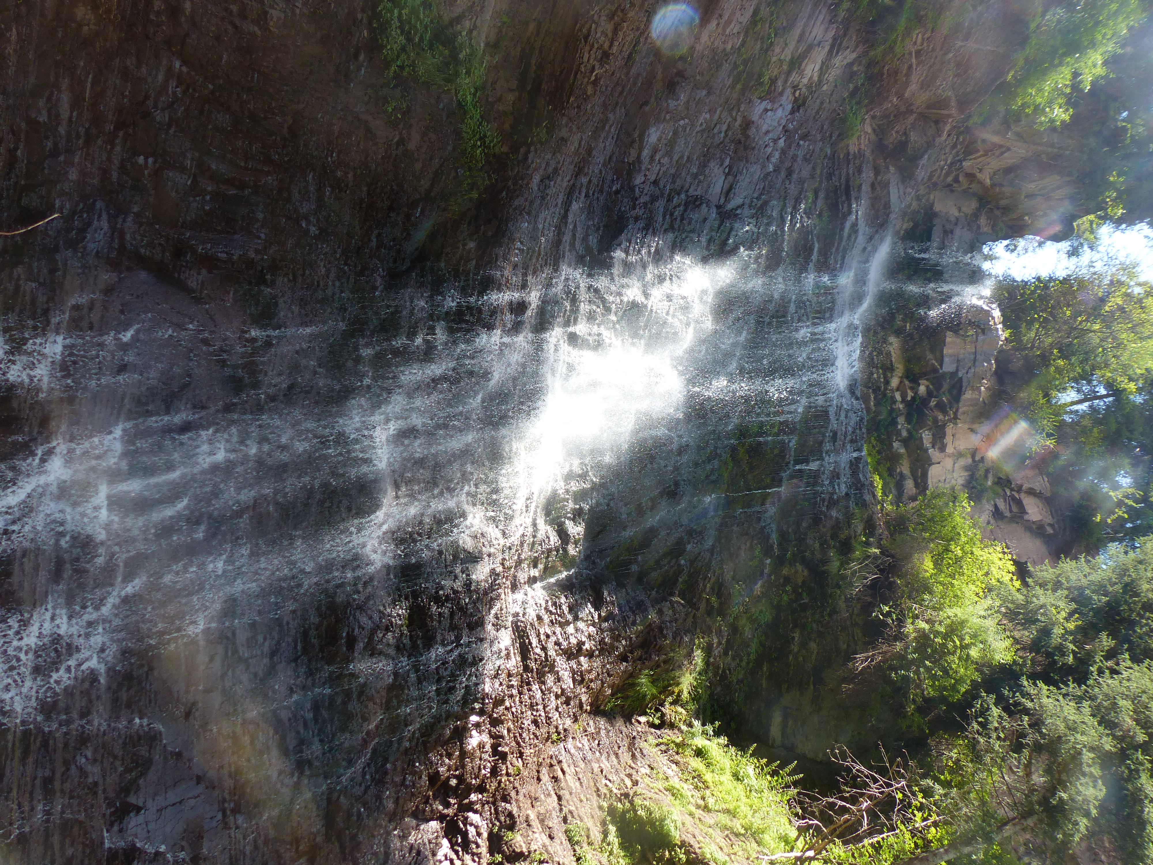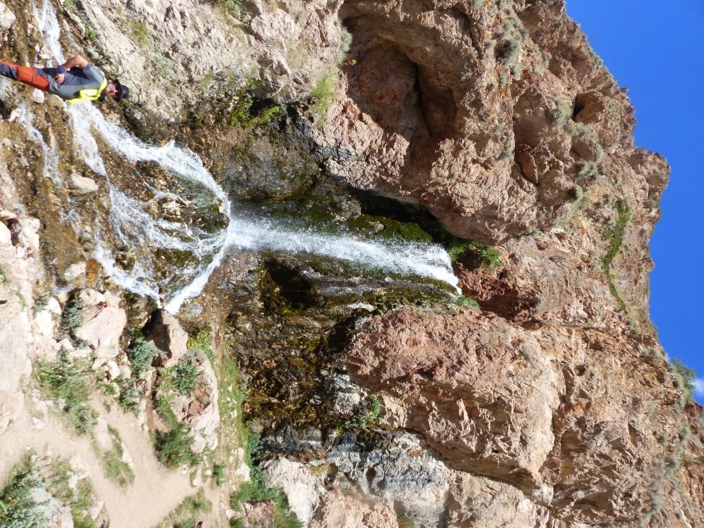 2ème stop de la journée : une petite incursion près d’une cascade qui semble jaillir d’un rocher, et au pied de laquelle pique nique une famille kirghize avec 3 petits garçons qui s’en donnent à coeur joie sous cette cascade.