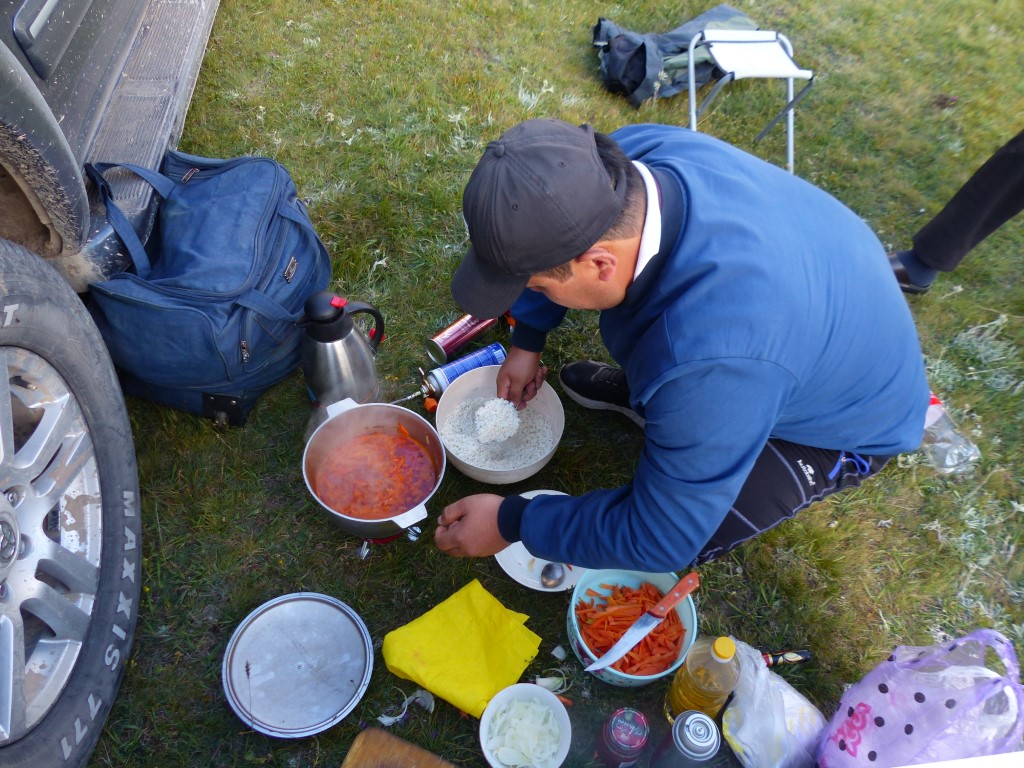 Arrivés sur place, on apprend que la place est déjà occupée, et qu’il faut attendre que le groupe précédent en sorte. Normalement ça ne devrait pas être trop long, vu la température (qu’Oulan estime aux alentours de 40 °) il ne faut pas y rester plus de 10 mn. Le bâtiment est petit, plutôt miteux d’extérieur comme d’intérieur, construit par les soviétiques à l’époque et jamais entretenu depuis. Il y a une première petite pièce où on pose ses vêtements, puis la salle avec la source d’eau chaude à proprement dit, qui répand une légère odeur de soufre. On pose un pied dans l’eau, puis on le retire bien vite, n’ayant aucune intention de vouloir nous transformer en homard. Les 2 Didier résistent un peu plus longtemps que moi, trempent une partie de jambe dans l’eau, mais pas question de s’immerger totalement dans le petit bassin … On estime que la température se situe plutôt entre 45 et 50 ° (en tout cas bien plus que la source chaude la plus chaude d’Islande que nous ayions fait qui était à 42°). Pas de risque que l’on dépasse les 10 mn réglementaires, en ce qui me concerne je vais me tremper les pieds dans le torrent tout proche pour les refroidir. Oulan et Altimbeck prennent notre suite, puis nous regagnons tous les 5 notre campement. Le repas de ce soir sera composé de nouilles chinoises déshydratées et retrempées dans l’eau bouillante. Franchement pas mauvais et très pratique pour le camping … En plus si on met trop d’eau, cela permet d’avoir une soupe en plus de plat de pâtes. Que demander de mieux ?