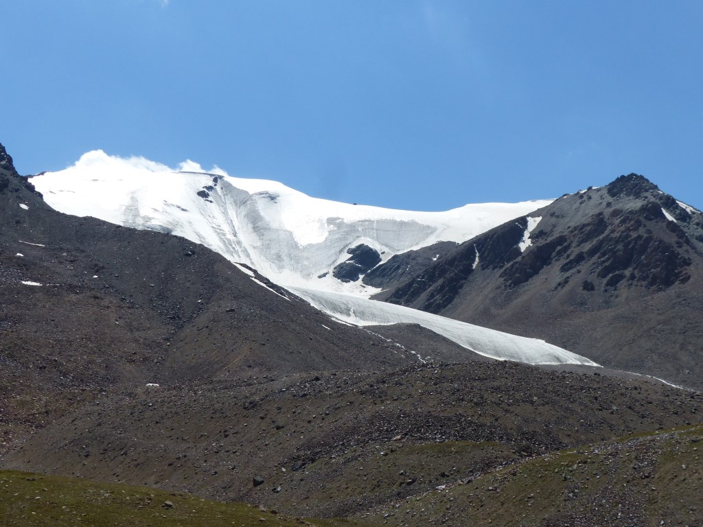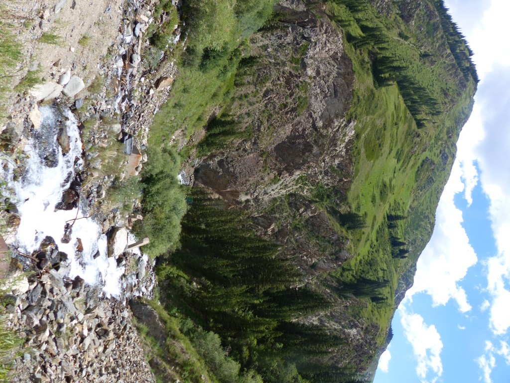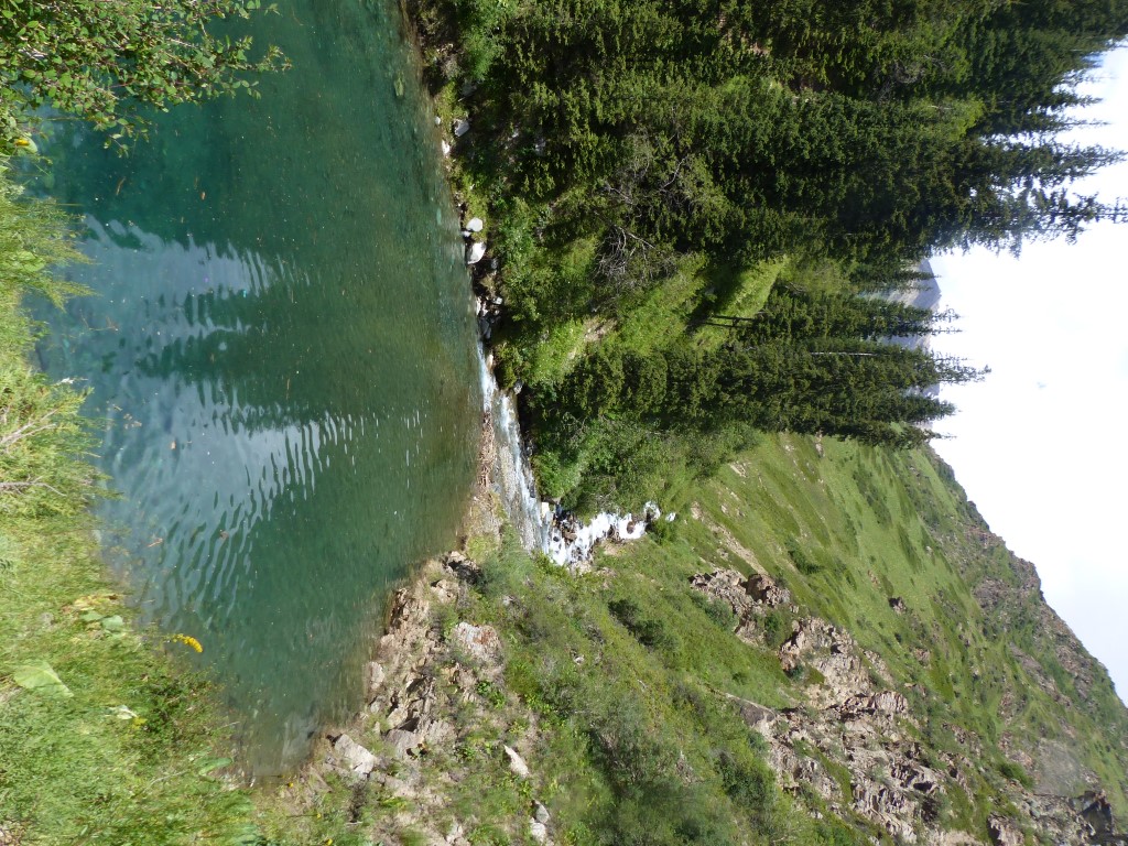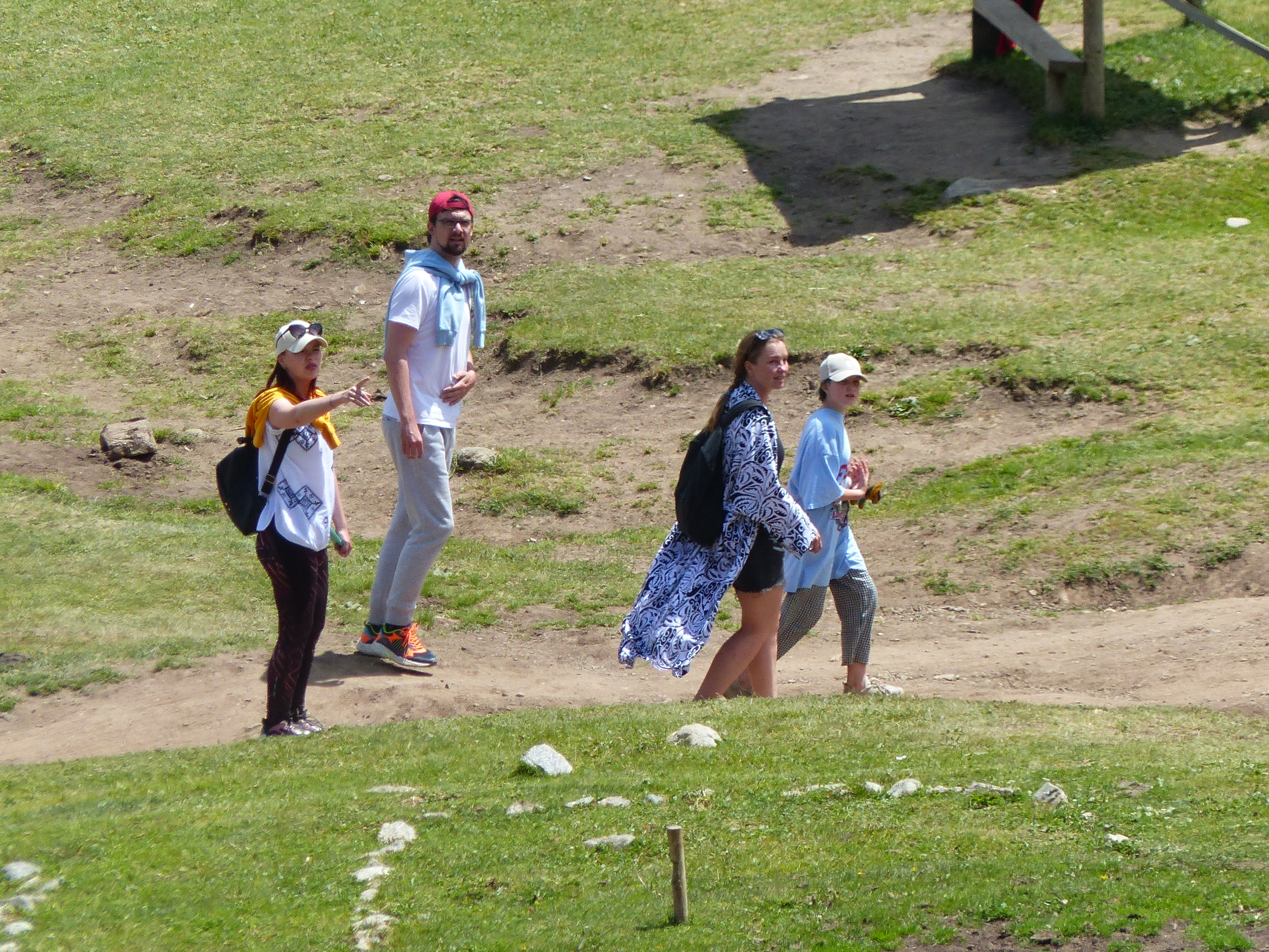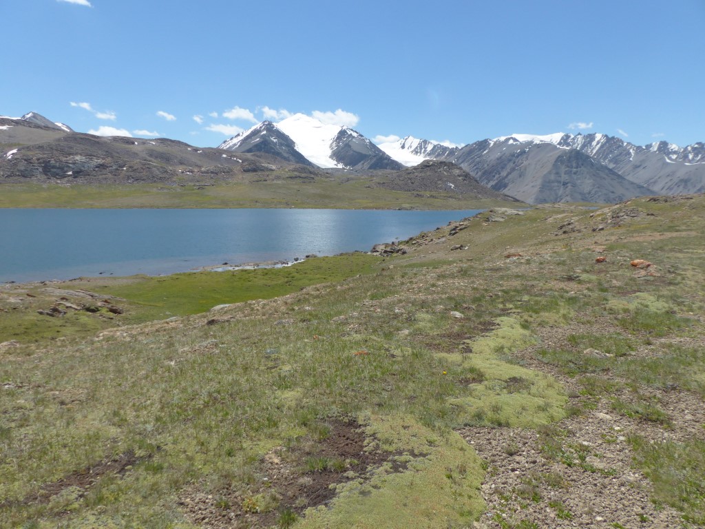 L’estomac bien lesté, on démarre notre rando en rejoignant par la piste la ferme qui garde la « source d’eau chaude », puis en s’élevant côté Sud sur un chemin qui longe la montagne. Le paysage est magnifique. On admire notamment les glaciers qui nous dominent (avec une petite pensée pour le groupe de touristes britanniques, qui s’est trouvé juste sous l’effondrement d’un glacier … mais là pas de risque, on est sur l’autre versant … message personnel pour Noëlle Fontanier:) ). Et on admire aussi la rivière qui brille en serpentant dans le fond de la vallée. Le chemin oblique à droite pour suivre un torrent bondissant qui nous mènera jusqu’au petit lac. On finit par arriver à 1 1er lac vert vif, où un troupeau de vaches ont établi leurs quartiers. Petite pause (on doit avoir fait pas loin de 400 m de dénivelé et avec cette altitude, c’est plutôt crevant), puis Oulan nous propose de repartir jusqu’à 1 2ème lac, plus grand celui là, un peu moins vert vif mais tout aussi beau… C’est donc reparti pour 100m de dénivelé de plus, avec comme récompense le pique nique au bord du lac. Pas d’orage cette fois ci, mais là encore l’altitude me vrille le crâne. La descente se fait bien, mais chaque fois que je pose un pied par terre, ça me résonne dans la tête… Autant dire que l’arrivée n’est pas très glorieuse, Didier GO est lui aussi assez HS (même s’il a caracolé en tête pendant toute la rendo), et après une petite sieste, on accepte honteusement de se faire emmener en 4X4 à la source d’eau chaude à 1 ou 2 km de là.