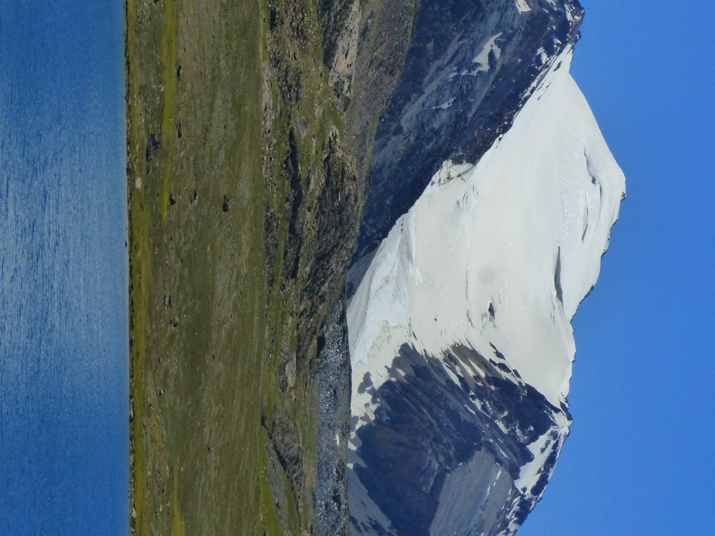Nous nous arrêtons au pied d'un premier lac d'altitude, nous sommes à 3800m, et face à l'un des glaciers qui nous entourent pour savourer l'instant. Il est aussi temps de déjeuner. Le saucisson est de la partie !