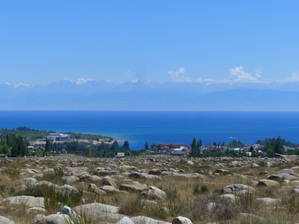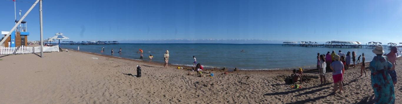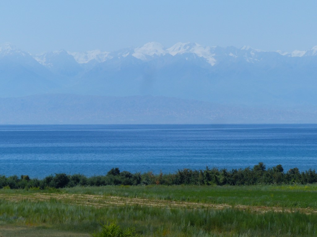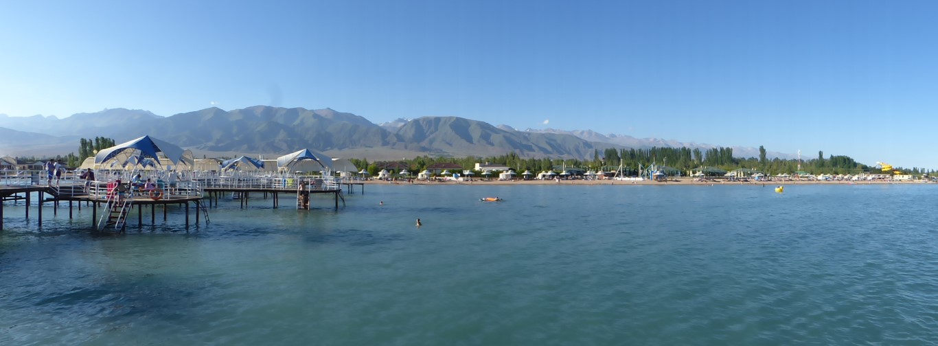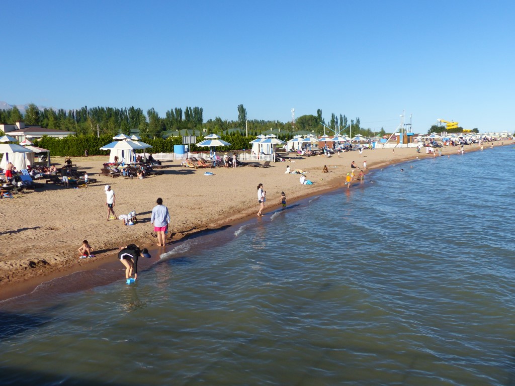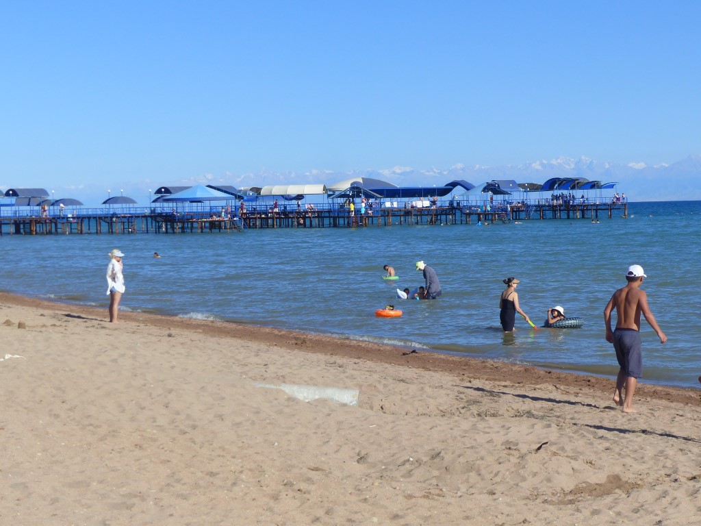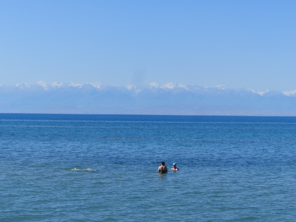 Nous déposons nos affaires, prenons une pause d'une heure puis allons nous baigner au lac Issyk Kul qui signifie en Kirghize "lac chaud". Effectivement, l'eau est bonne. Elle semble parcourue par des courants tantôt chauds, tantôt frais. En fait, le lac s'est formé lors de la rencontre de deux plaques tectoniques ce qui explique ces sources chaudes.