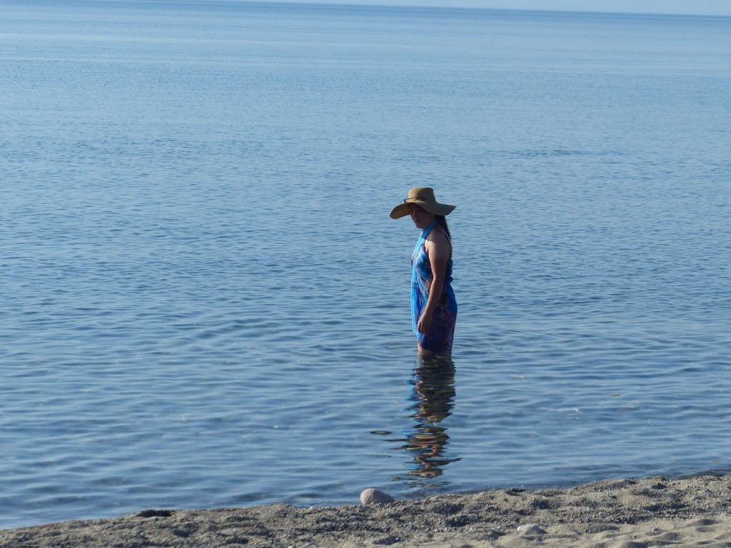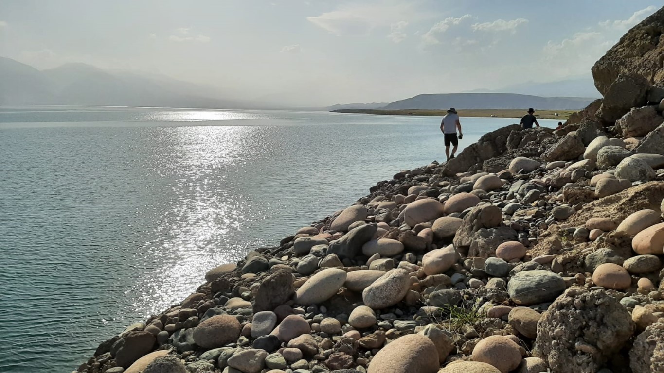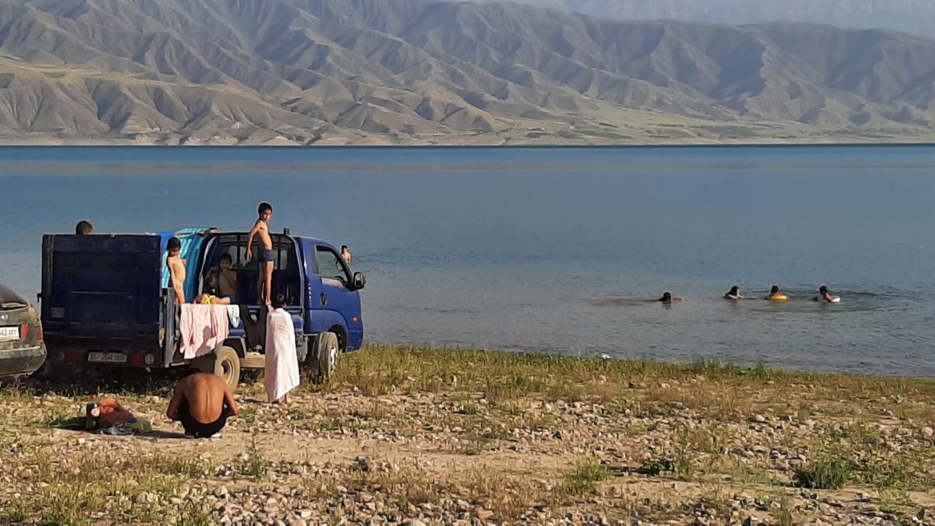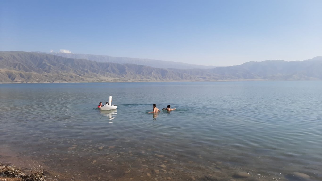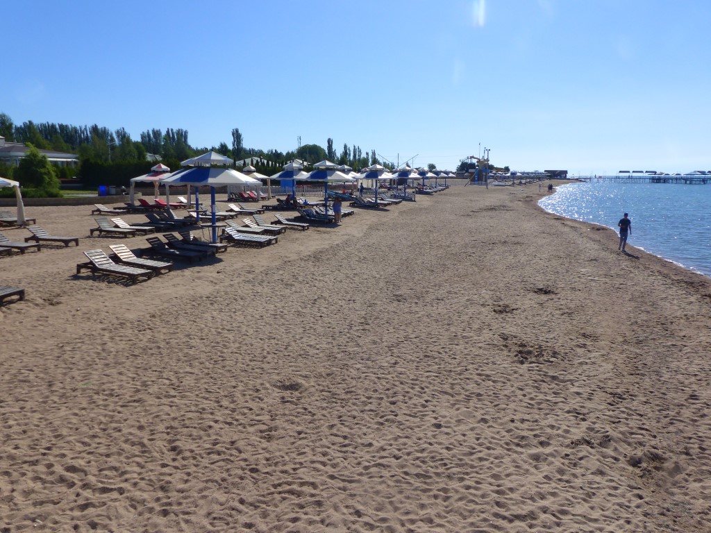 Nous déposons nos affaires, prenons une pause d'une heure puis allons nous baigner au lac Issyk Kul qui signifie en Kirghize "lac chaud". Effectivement, l'eau est bonne. Elle semble parcourue par des courants tantôt chauds, tantôt frais. En fait, le lac s'est formé lors de la rencontre de deux plaques tectoniques ce qui explique ces sources chaudes.