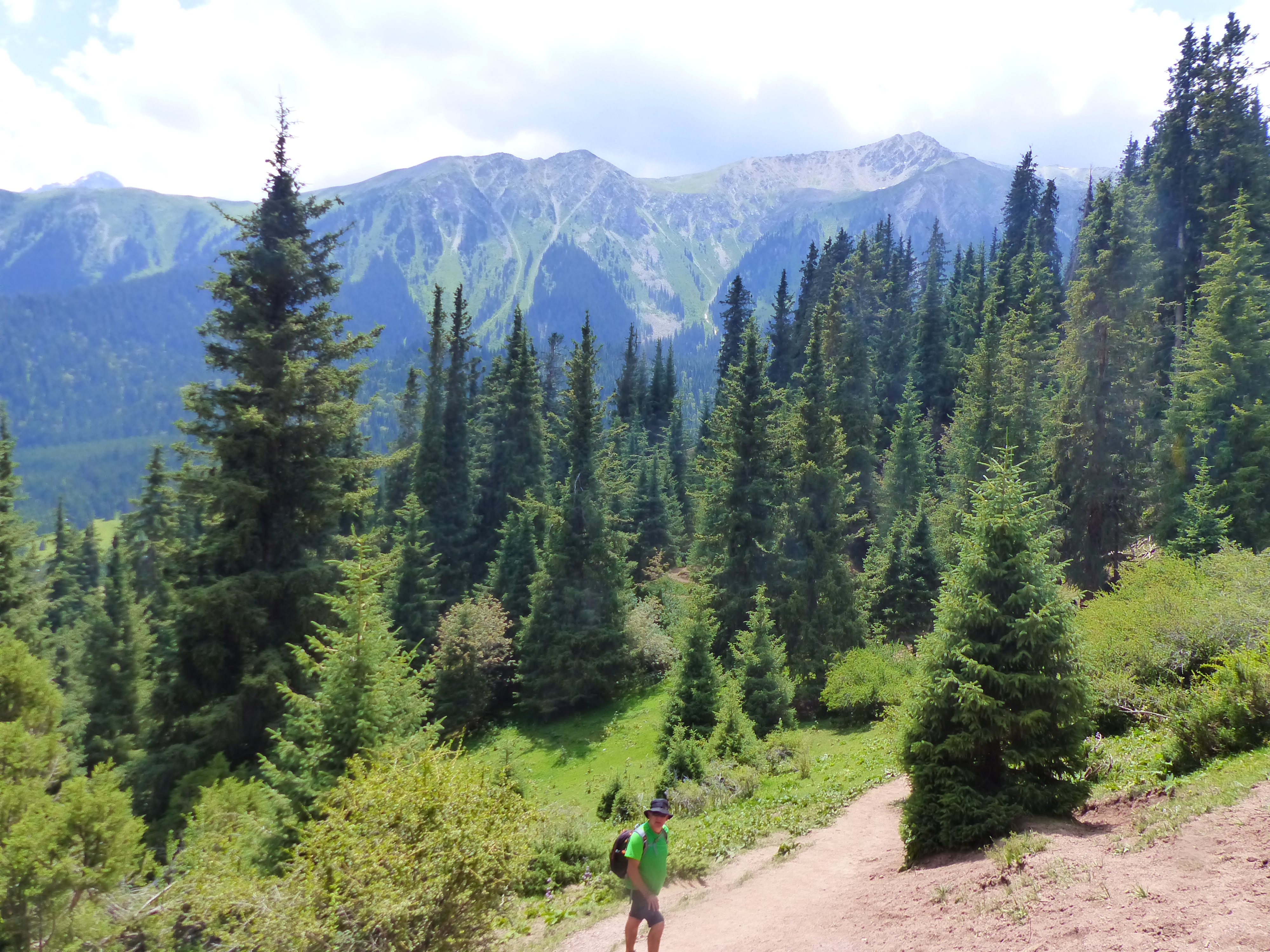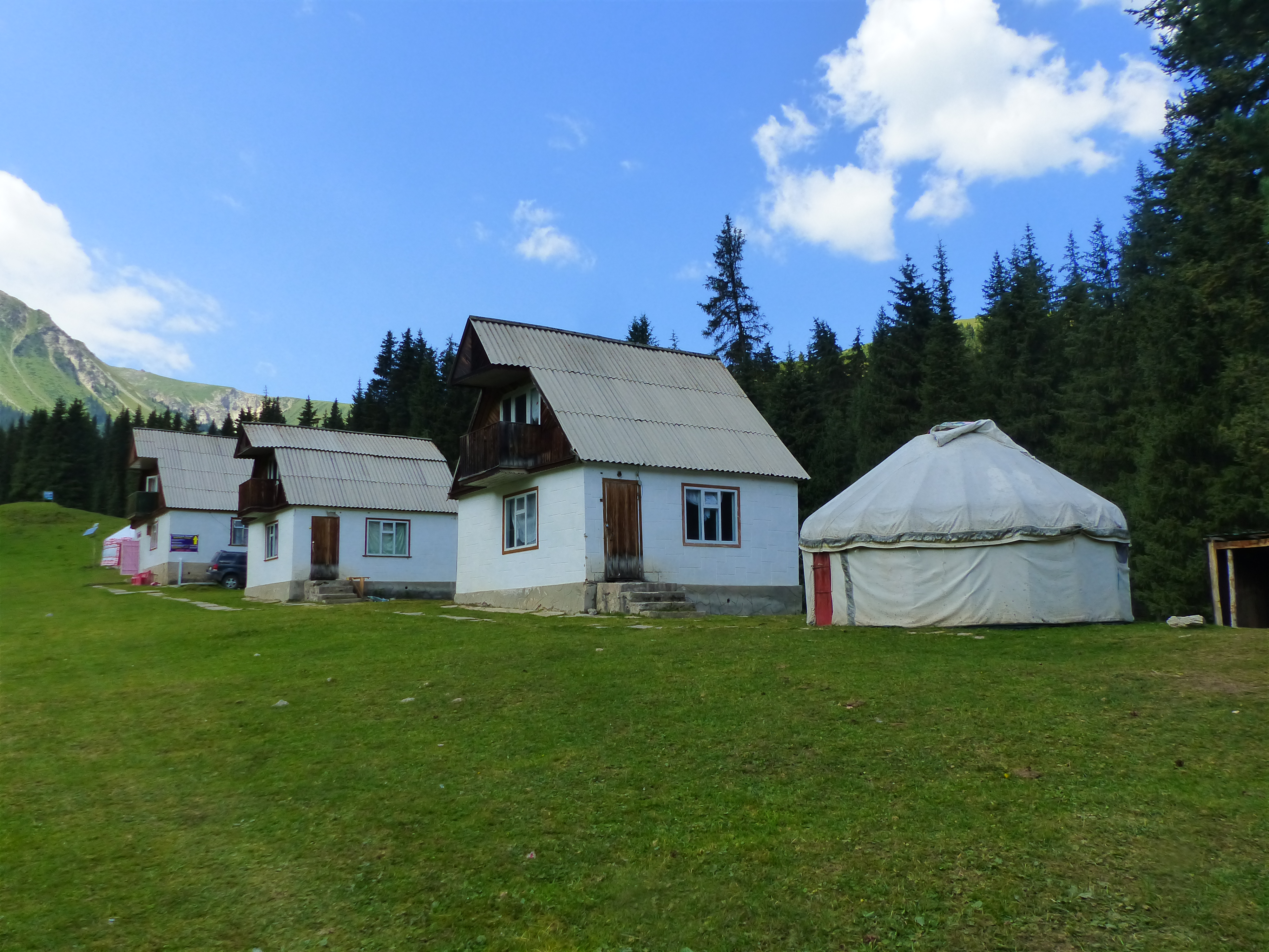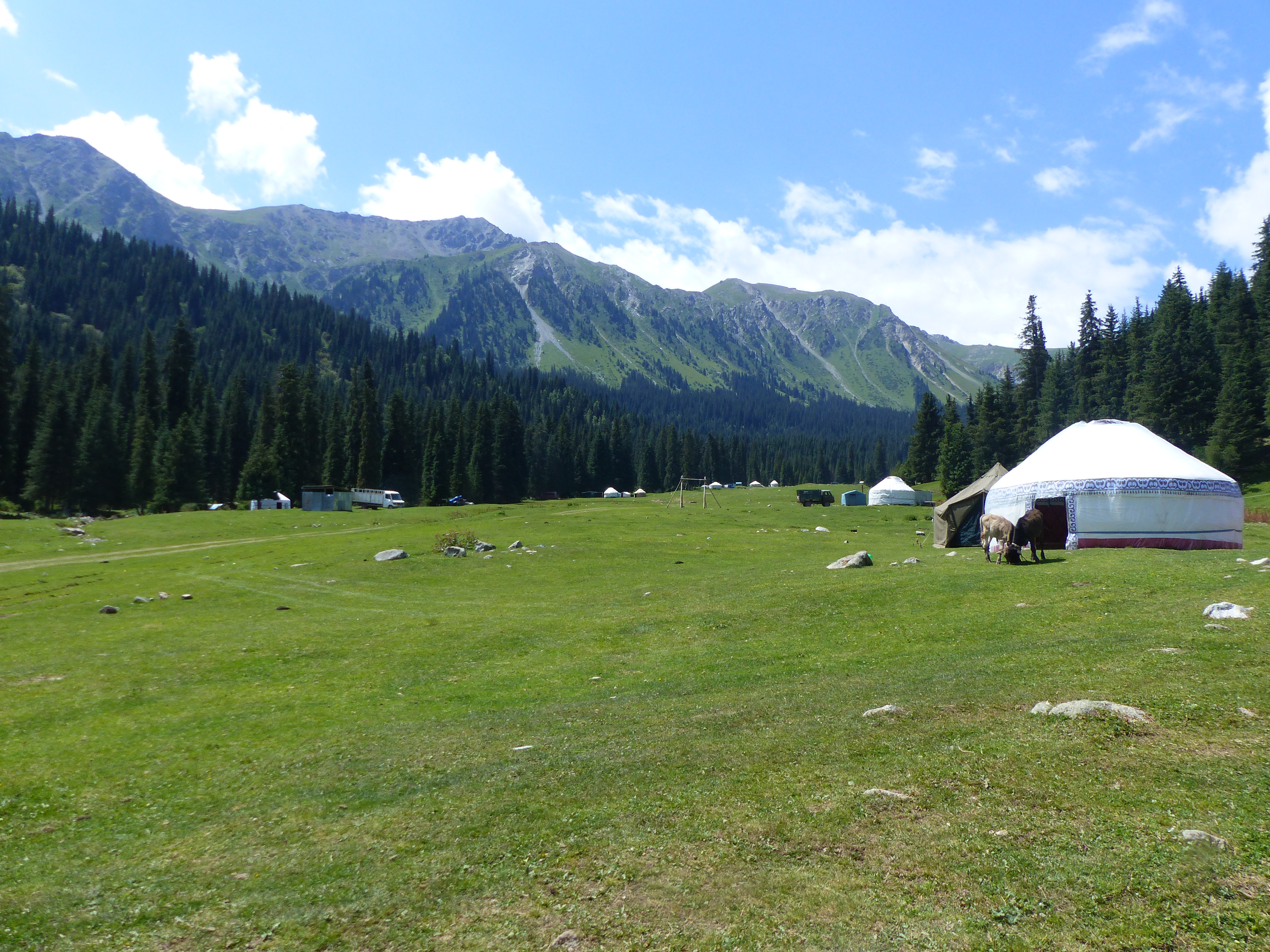 Contrairement à celles des précédents jours, cette piste est très empruntée par des touristes, kirghizes mais aussi russes. D’ailleurs les visages que nous croisons sont pour partie asiatiques, pour partie caucasiens (les russes). On laisse Altimbeck et le 4X4 dans une magnifique vallée (pelouses et forêts), parsemée de yourtes (on a d’ailleurs réservé notre déjeuner dans l’une d’entre elles … apparemment elles font toutes restau…) et on commence à marcher en direction d’une cascade célèbre – j’ai oublié son nom mais je pense que ça ne vous dira rien … On traverse d’abord un pré, on est abordés par des jeunes garçons à cheval qui veulent nous proposer une monture pour rejoindre la fameuse cascade (c’est non!), puis un petit sentier forestier nous amène dans une zone encore plus « touristique » (en tout cas peuplée) avec des yourtes restau, des emplacements en béton pour des futures arrivées de yourtes (une espèce de terrain de camping, donc… à moins que ce ne soit des résidences secondaires qui s’installent ici), des stands où on peut acheter de la nourriture et des boissons, et partout des chevaux qui peuvent être loués pour la balade. On passe aussi à côté d’un petit chalet où Youri Gagarine a passé 1 an en 1961 pour se remettre de son vol en orbite (petite pensée pour Ariane qui n’a pas pu aller en Russie l’année dernière), ainsi que sa collègue beaucoup moins connue – certainement car c’est une femme ! - Valentina Telichkova – en 1963).